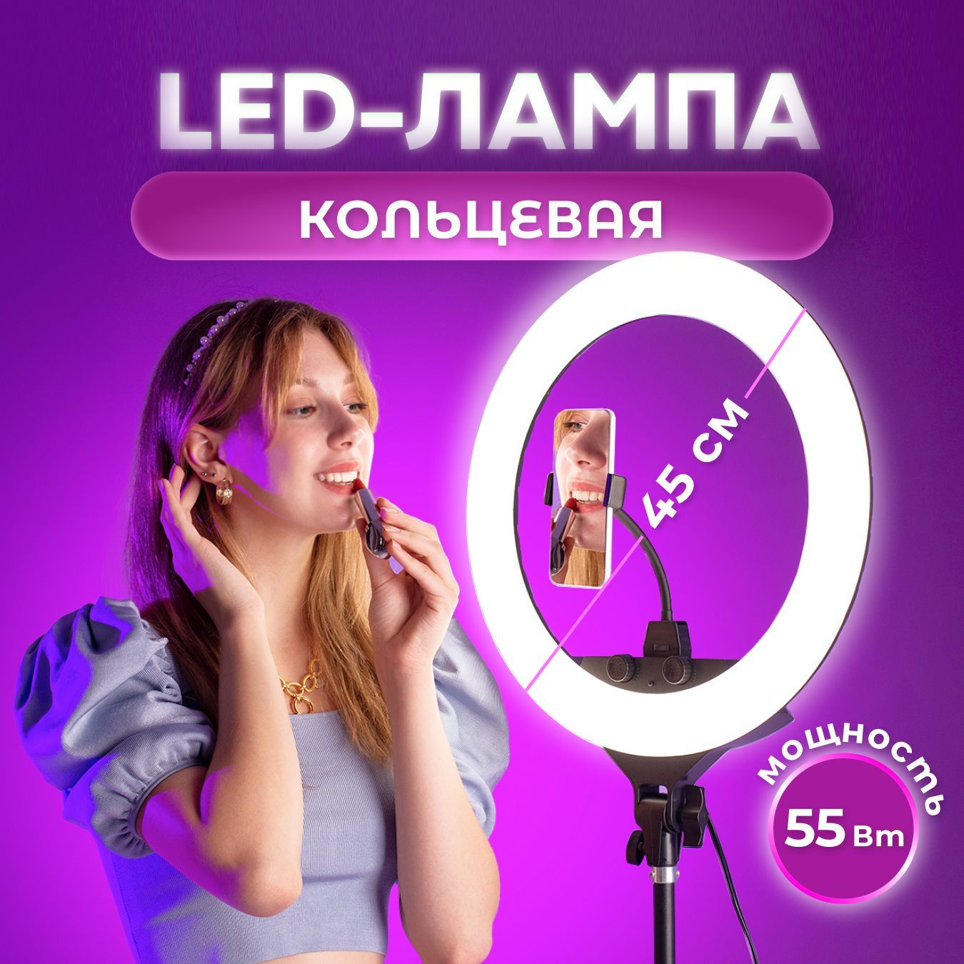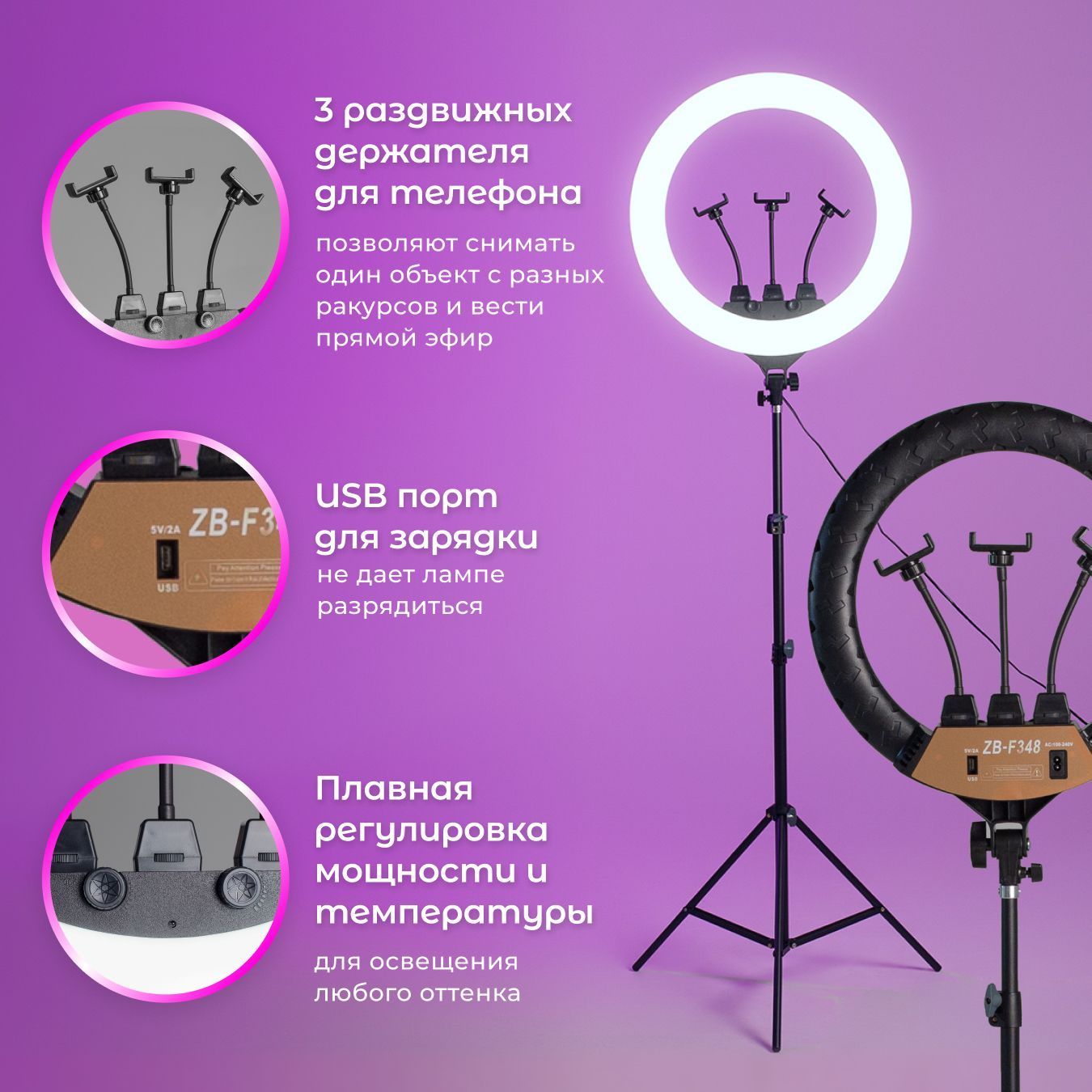 Описание: Кольцевая лампа 45см ZB-F348-идеальный помощник для создания фото и видеконтента, а так же для бьюти-индустрии. Основным преимуществом лампы является отсутствие бликов и равномерное рассеивание света. Так же в данной модели 500 светодиодов и мощность в 55Вт. Расширенный температурный диапазон подарит вам освещение любого оттенка. Создавайте любые эффекты для съемок используя теплый, нейтральный и холодный свет, переключая его плавными диммерами на корпусе лампы или же с помощью дистанционного пульта. 3 крепления для смартфона позволят снимать один объект с разных ракурсов и вести прямой эфир, а USB на задней части не дадут ему разрядиться. С лампой ZB-F348 вы гарантированно останетесь довольны. К напольной лампе для сэлфи в комплект идет раздвижной напольный штатив трипод кронштейн 2 метра, три гибких держателя с прищепкой для телефона, чехол сумка-переноска, bluetooth блютуз пульт на батарейках для смартфона.