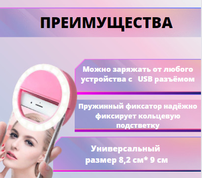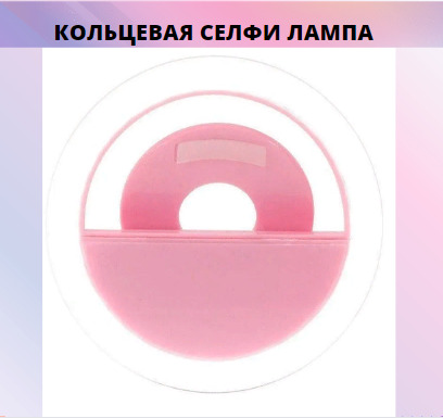 Описание: Лампа для селфи и фото на телефон / планшет. Позволит вам сделать профессиональные фото с отличным светом в любом месте. Подойдет к любому устройству, не зависимо от расположения камеры. Три режима яркости. Легко устанавливается на телефон как прищепка, силиконовые вставки защищают ваше устройство от царапин.