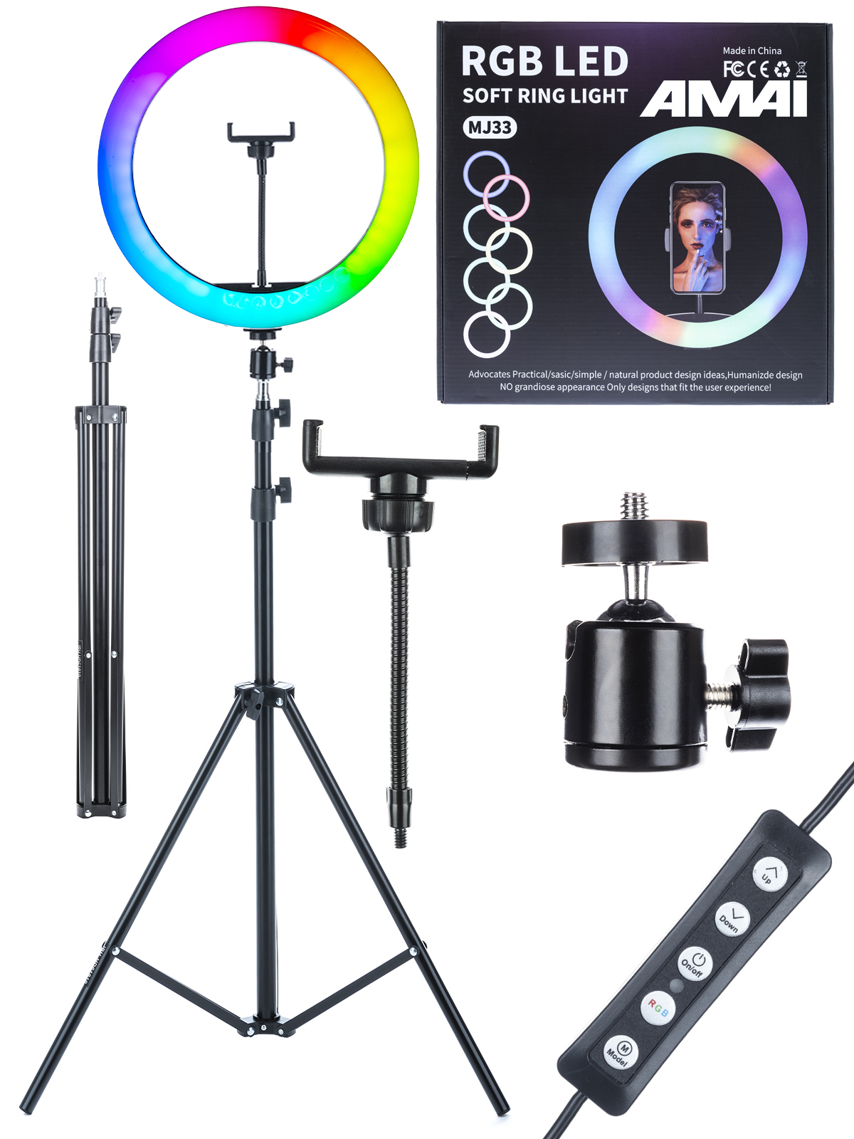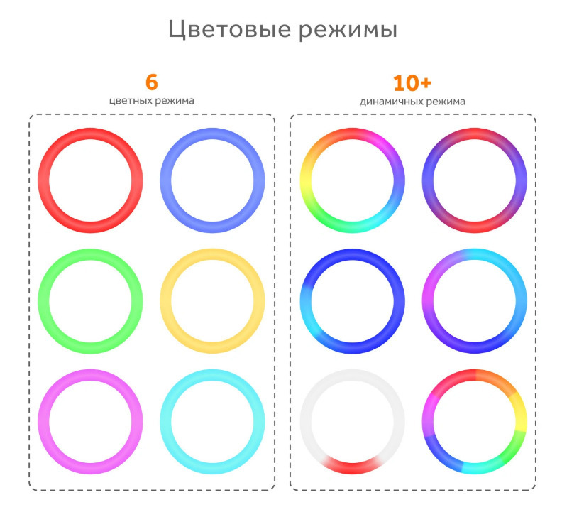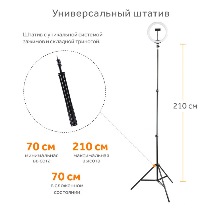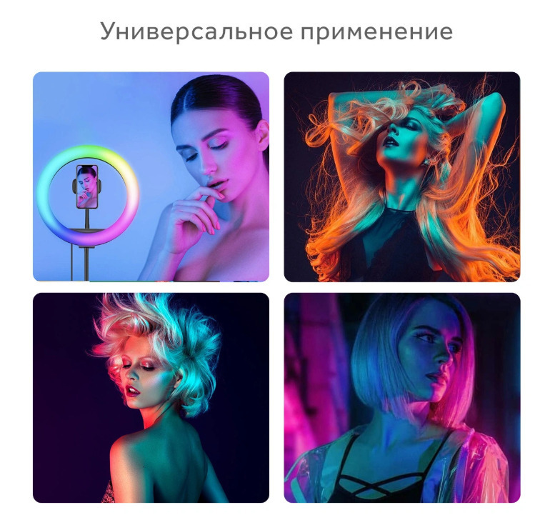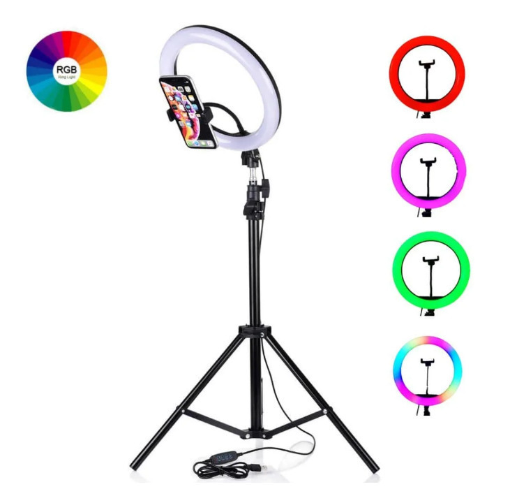 Описание: Кольцевая лампа RGB LED MJ33 является самой уникальной и прогрессивной на сегодняшний день. Лампа MJ33 подойдет как бьюти-мастерам (визажистам, бровистам, стилистам), так и блоггерам, фотографам и любителям качественного фото. Поддержка RGB многоцветного режима освещения (переключаемый цвет) красный, синий, зеленый, голубой, салатовый, сиреневый + все это моргает, переливается, мигает, плавно переливается и меняет цвет, так же могут все эти цвета гореть одновременно в одном кольце, может быть бегающий по кругу цвет, также  возможен уровень двух цветов в одном кругу, режим теплого света, режим белого света и нейтральный режим освещения, чтобы удовлетворить любые потребности в освещении. Свет переключается с помощью пульта расположенного на проводе. Данная лампа позволит осветить больше места. Светодиоды, в зависимости от выбранного режима, осветят ваше лицо мягко и аккуратно, либо подарят студийную подсветку, или же, дадут освещение, подобное ярким софитам. Не стоит, конечно, забывать о том, что главным преимуществом таких изделий является отсутствие бликов и то, что свет рассеивается равномерно. Каждый специалист, в первую очередь, в данной кольцевой лампе отметит существование вариативной цветовой температуры и индекса цветопередачи, что делает в свою очередь ее более привлекательной для многих высококвалифицированных специалистов в различных областях, где необходим качественный свет.Данное изделие может быть приобретено не только с целью профессиональной деятельности, но и для домашнего использования, поскольку оно имеет маленький вес и обладает компактностью. В связи с тем, что данная кольцевая лампа оснащена большим количеством лампочек, она может стать незаменимой, как в домашнем обиходе, так и для осуществления собственной профессиональной деятельности в любых отраслях. В комплекте с лампой идет металлический штатив размером от 70 до 210 см с держателем для телефона шириной 6 - 9 см на гибкой ножке.