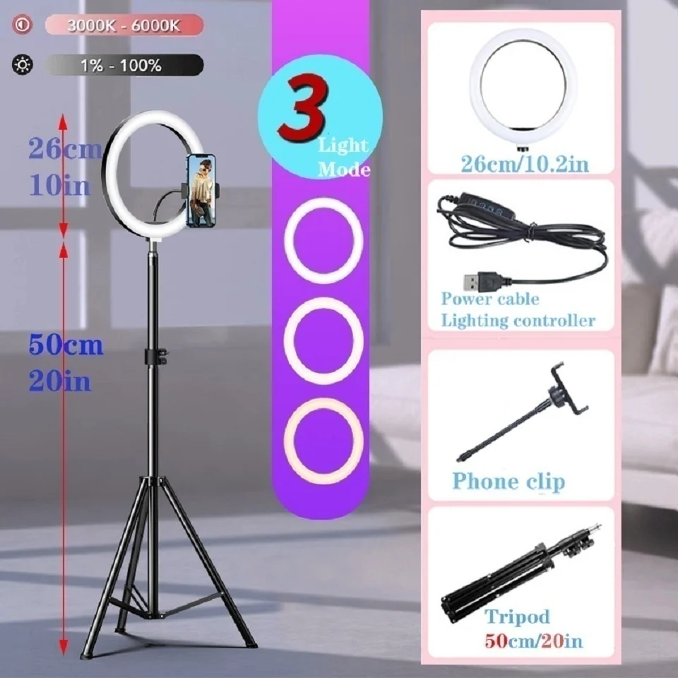 Кольцевой светильник для селфи, 10 дюймов, с регулируемой яркостью