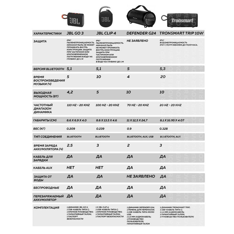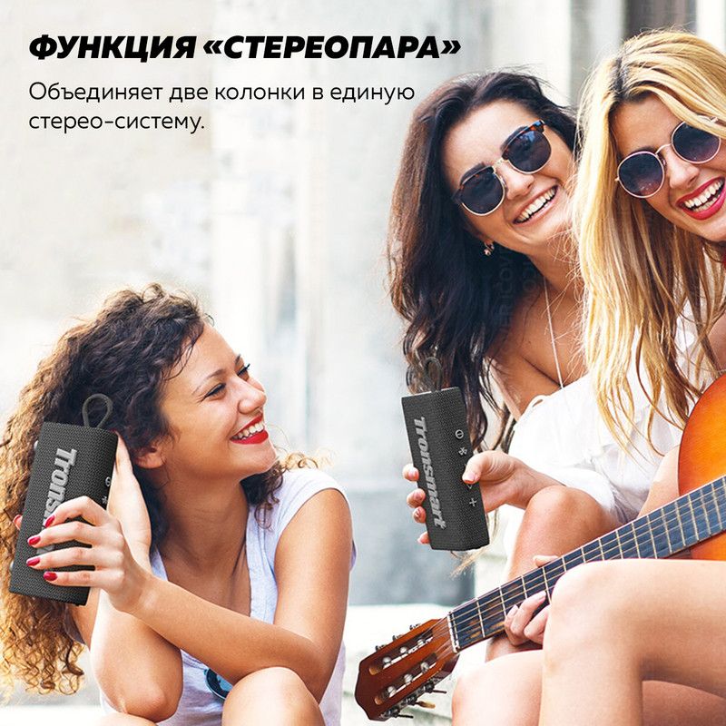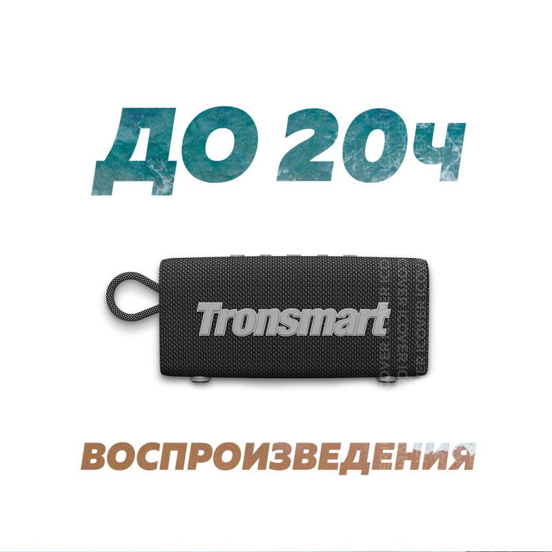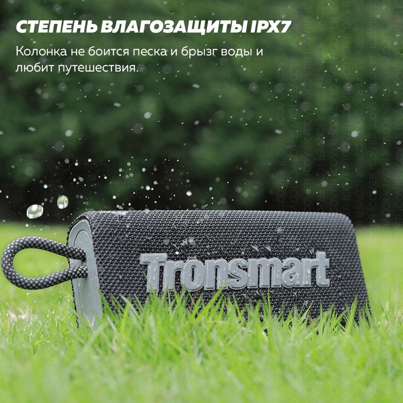 Для подключения к источнику звука в Tronsmart Trip 10W используется интерфейс Bluetooth 5.3. Защита корпуса по стандарту IPX7 позволяет взять акустическую систему с собой в поход или на пляж и не переживать о том, что на неё попадёт влага.