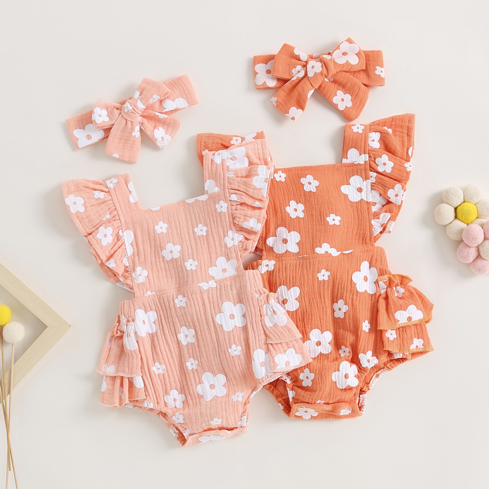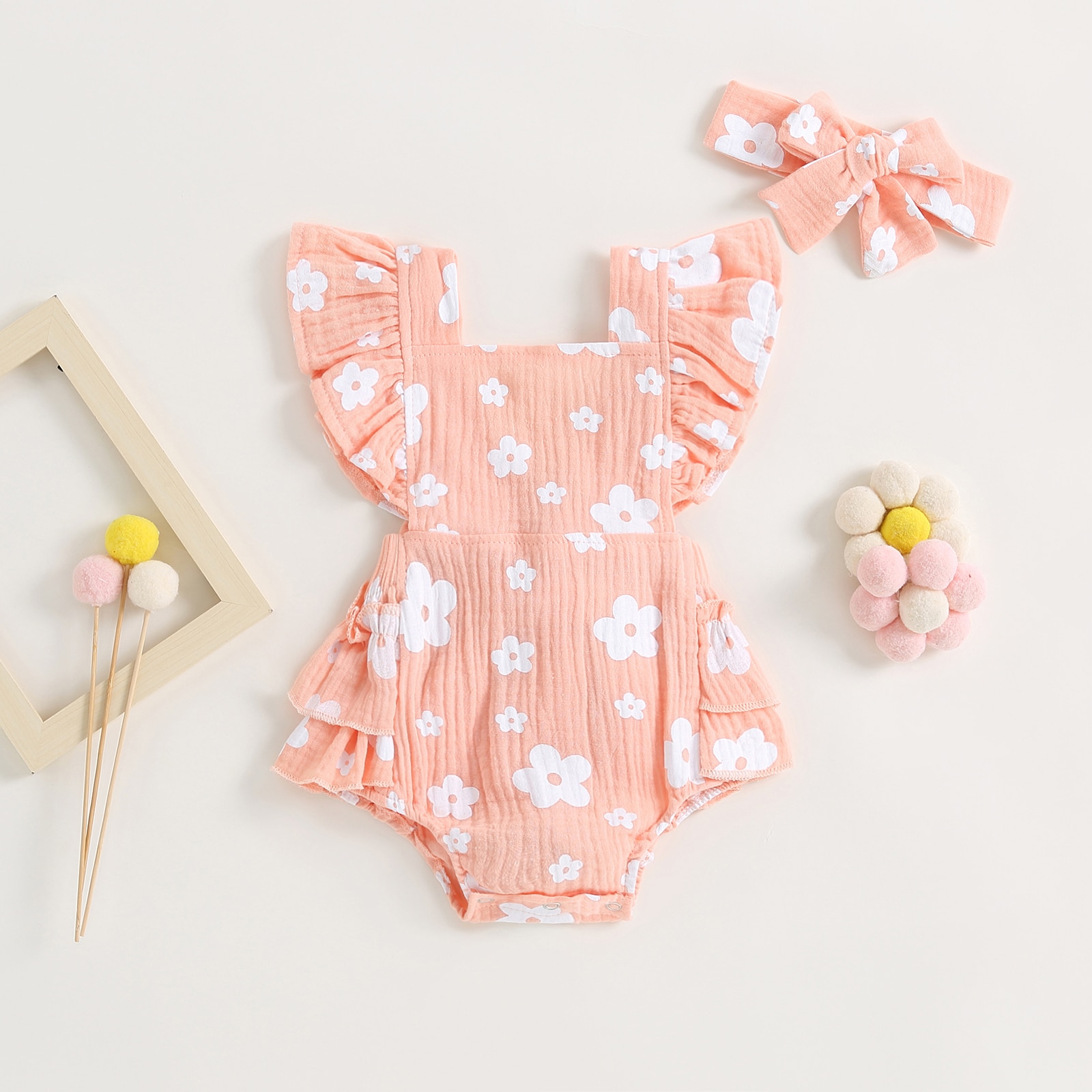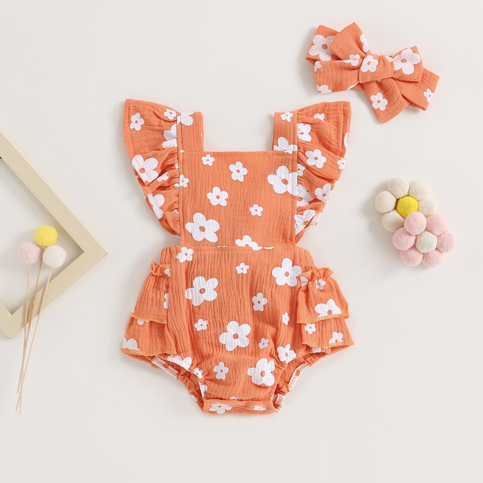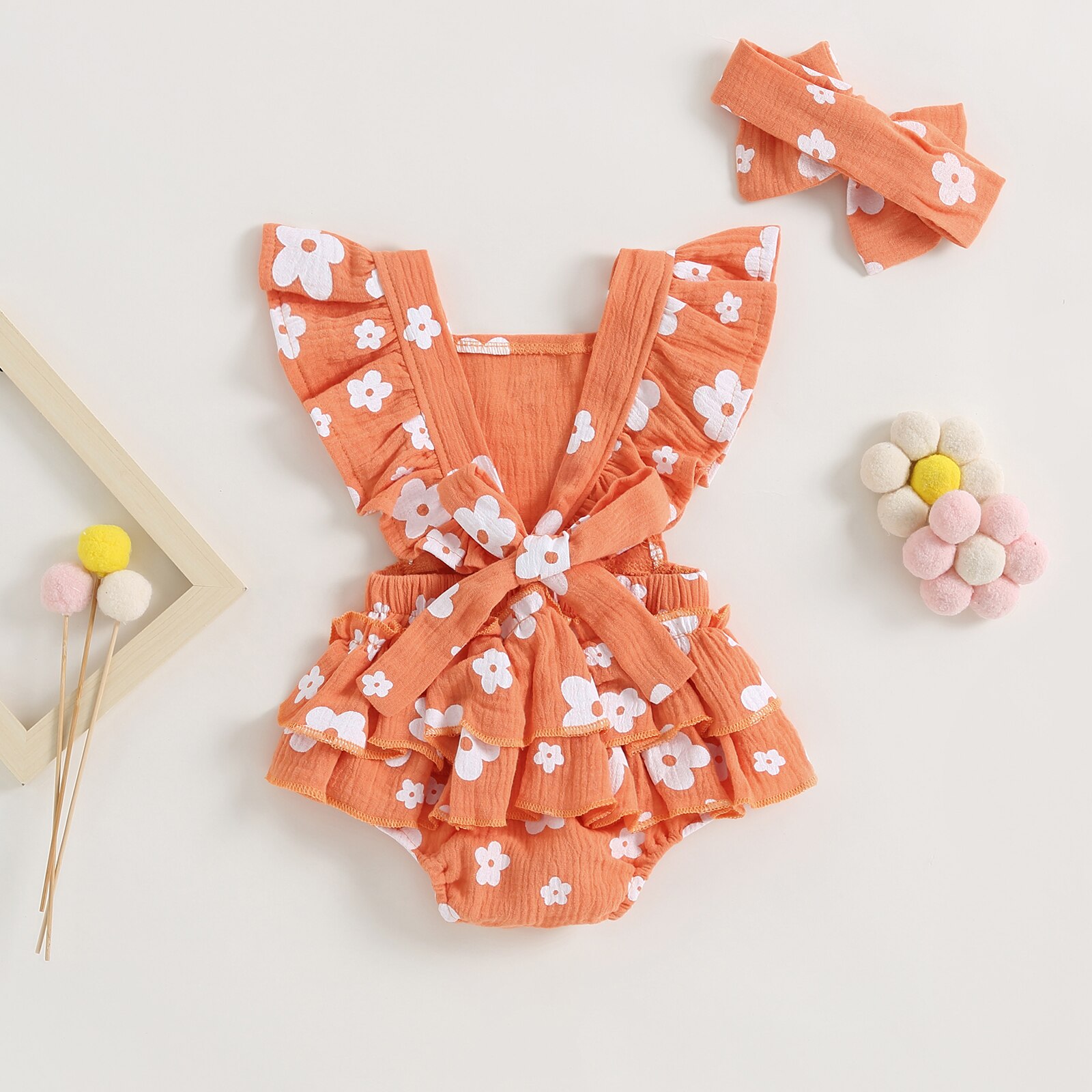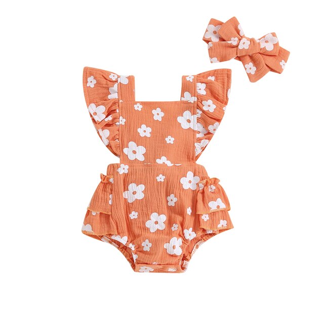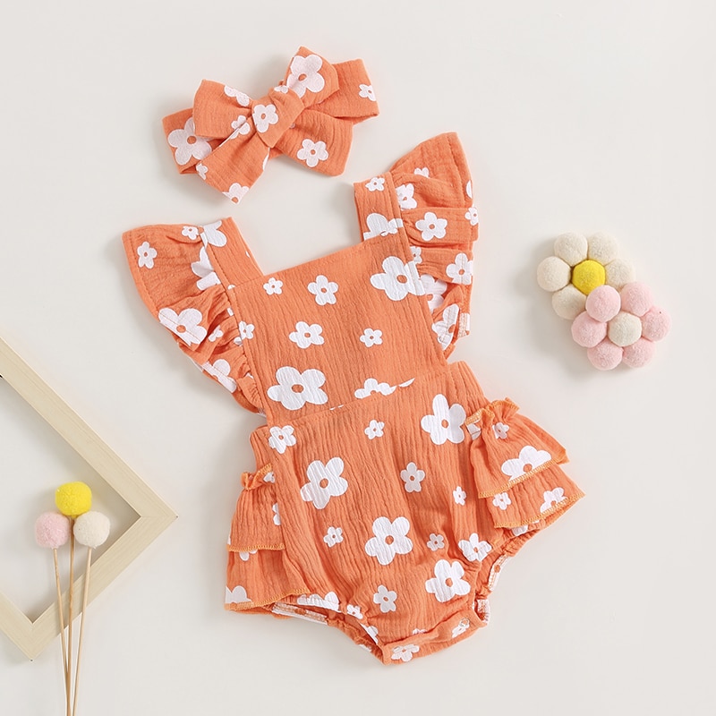 Описание: Новорожденных девочек Повседневный комбинезон с цветочным принтом Летающий рукав Многоуровневое с рюшами с оголовьем Летняя одежда