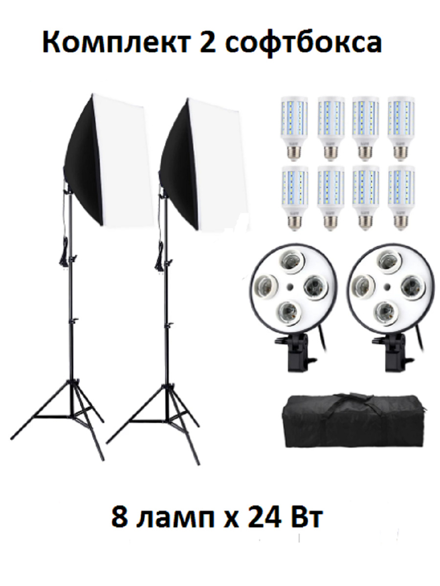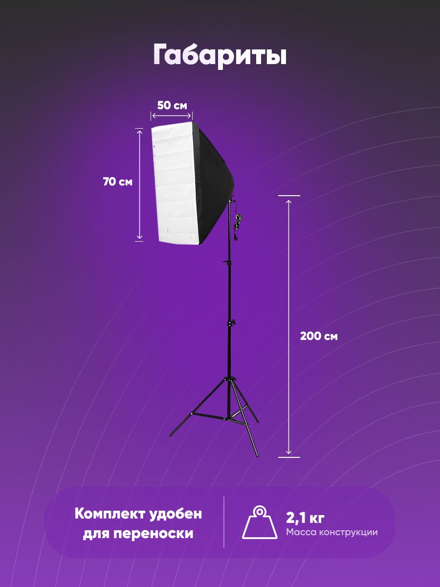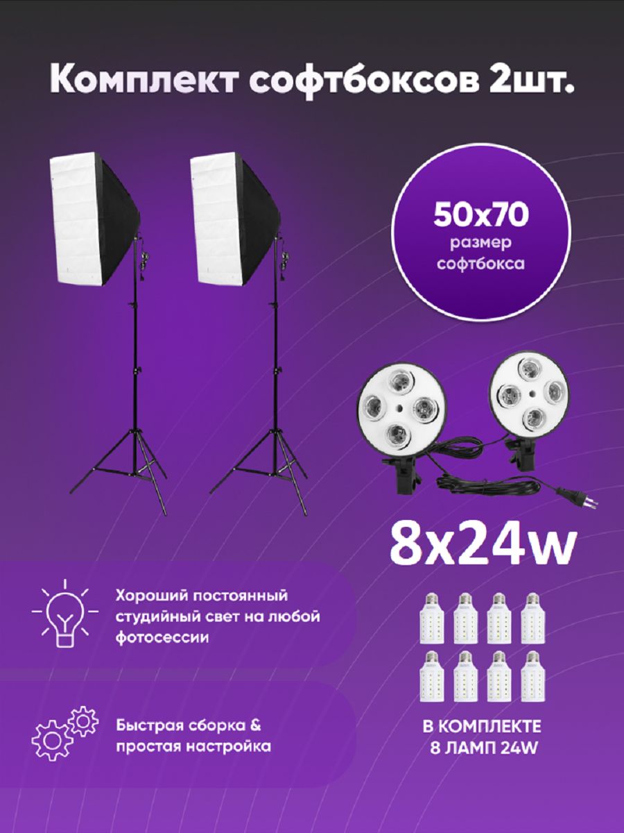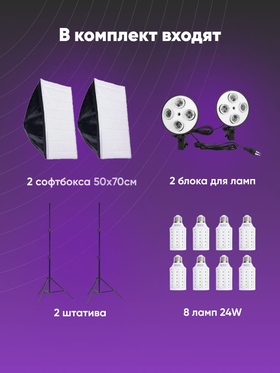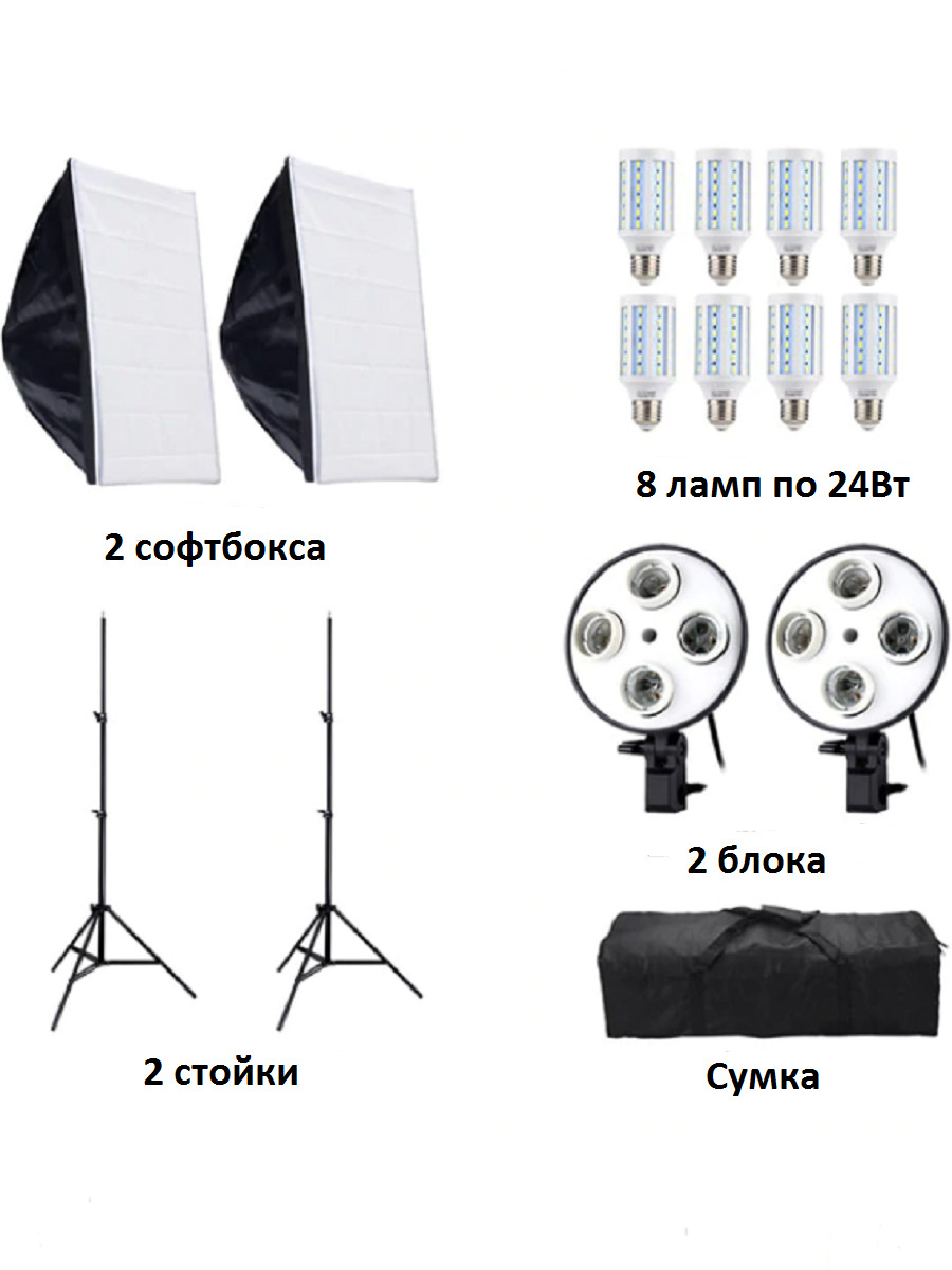 штатив - 2 шт; блок электрический - 2 шт; софтбокс 50х70 - 2 шт; рассеиватель - 2 шт; лампа 24 w - 8 шт; сумка в подарок - 1 шт