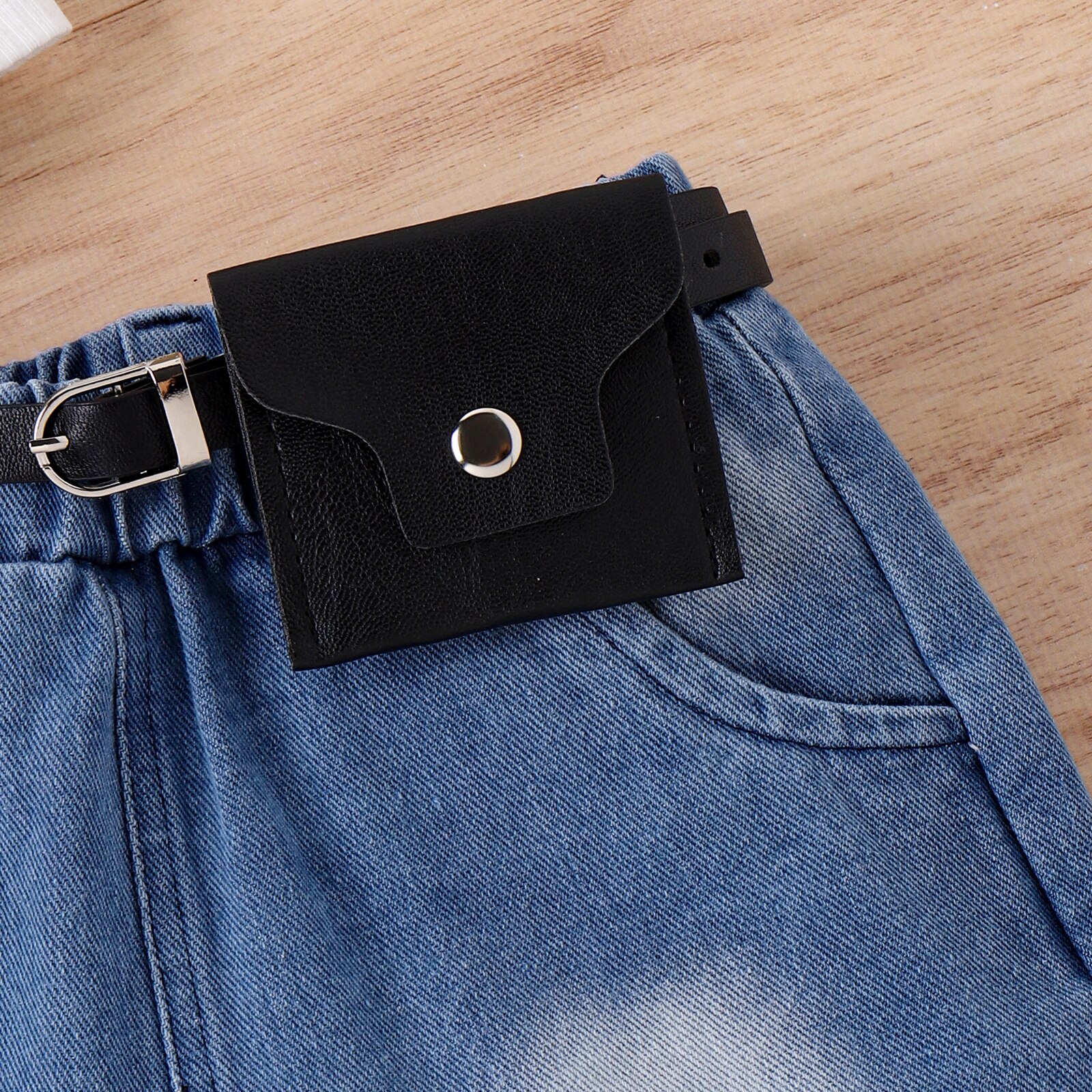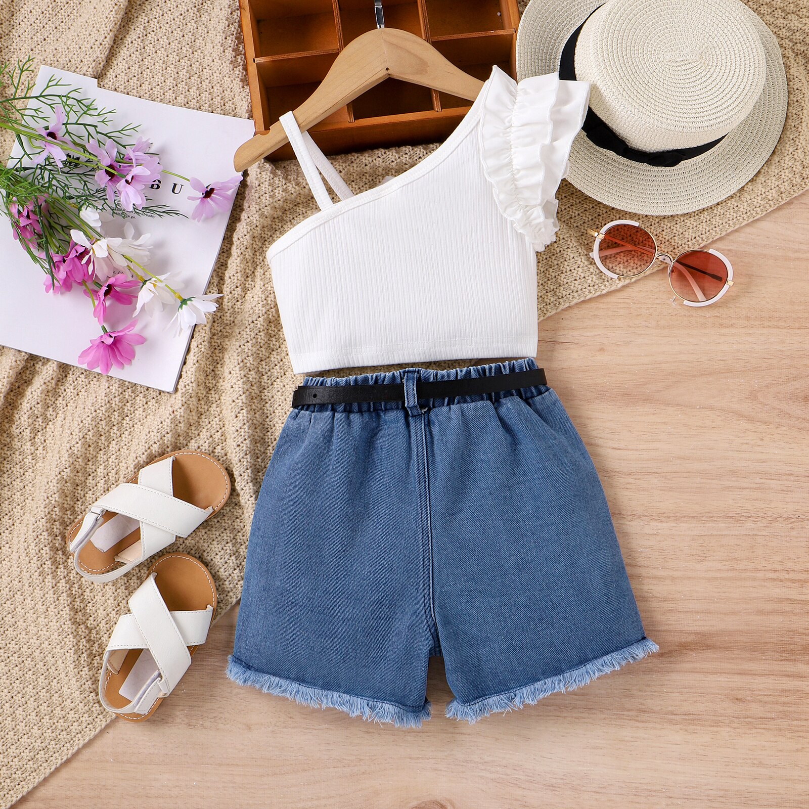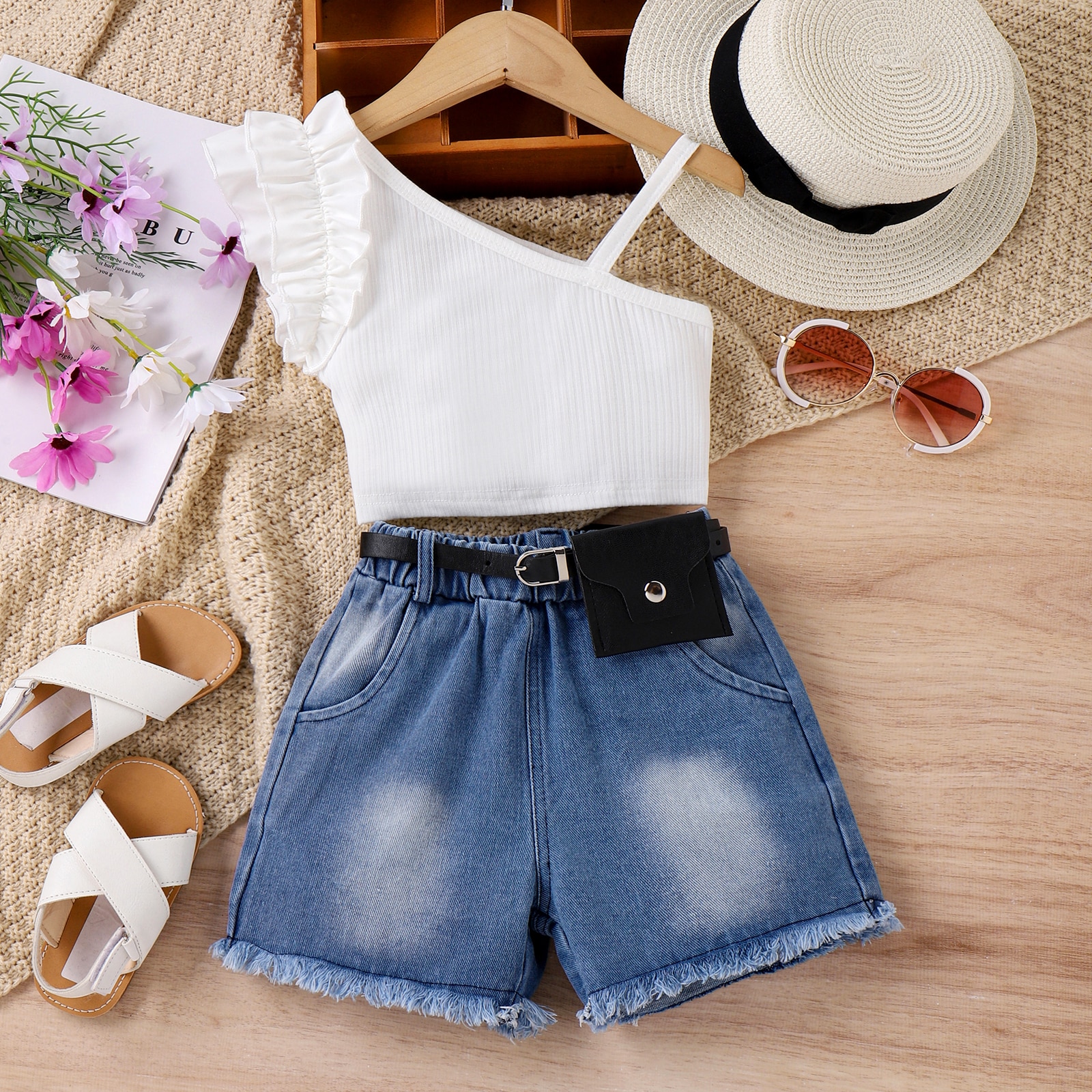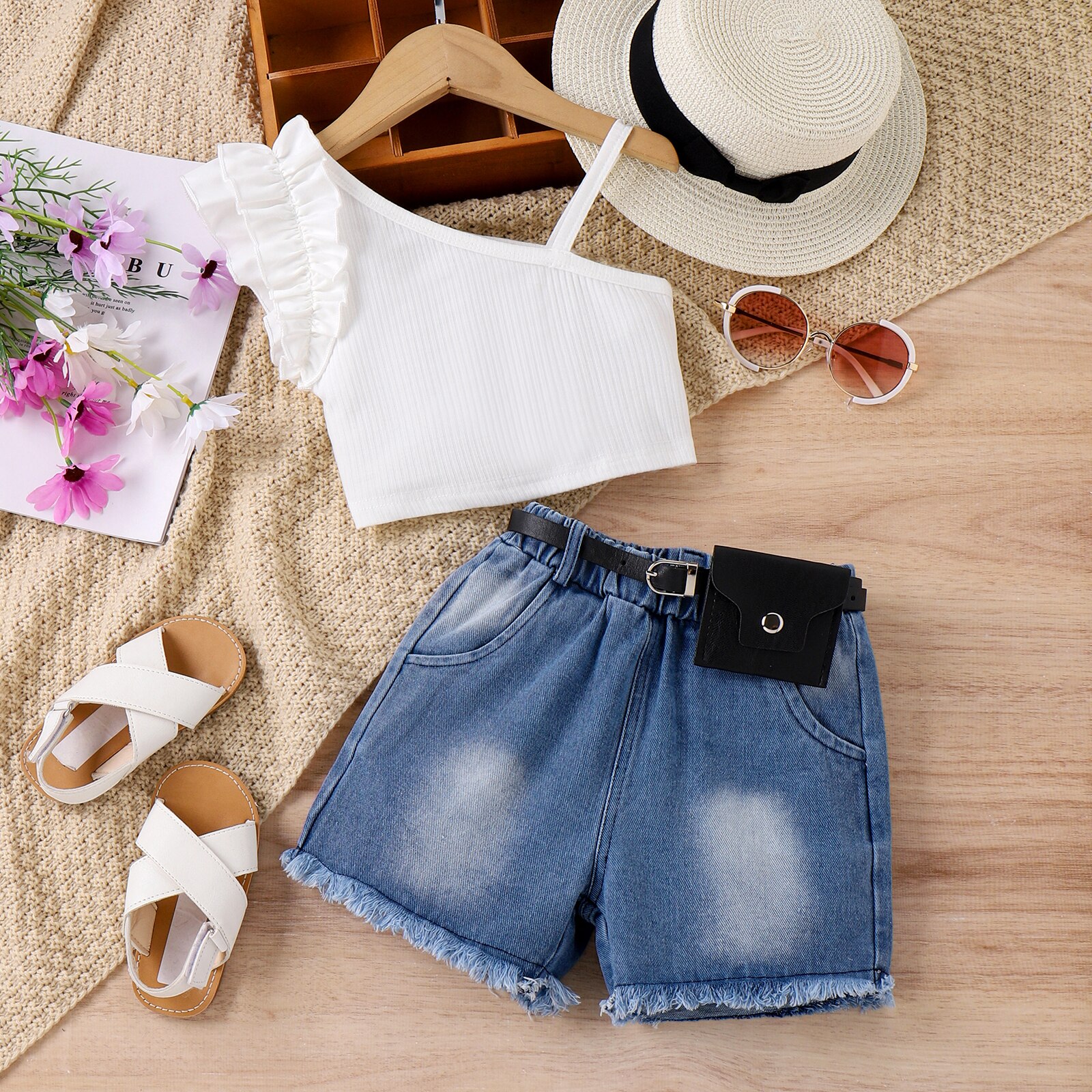 Комплект детской летней одежды для девочек, белый топ на лямках с оборками и рваные джинсовые шорты с сумкой на талии, комплект из 3 предметов