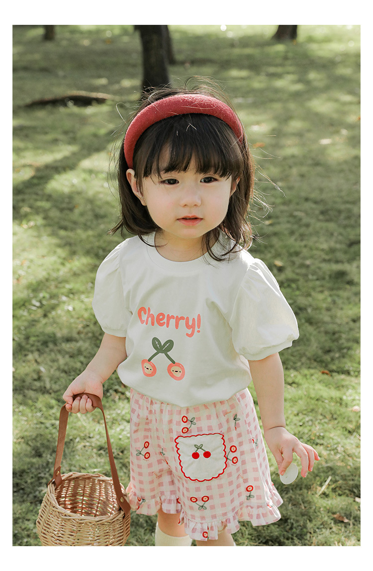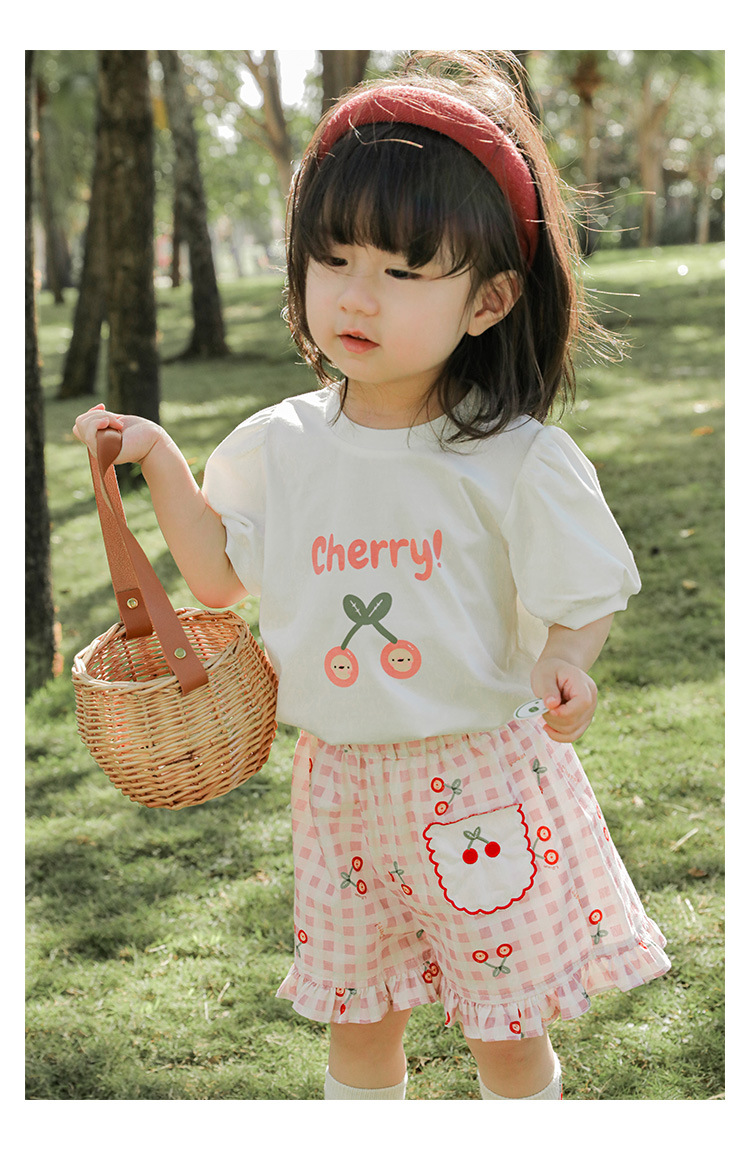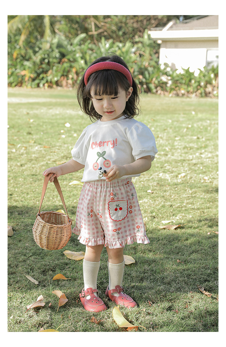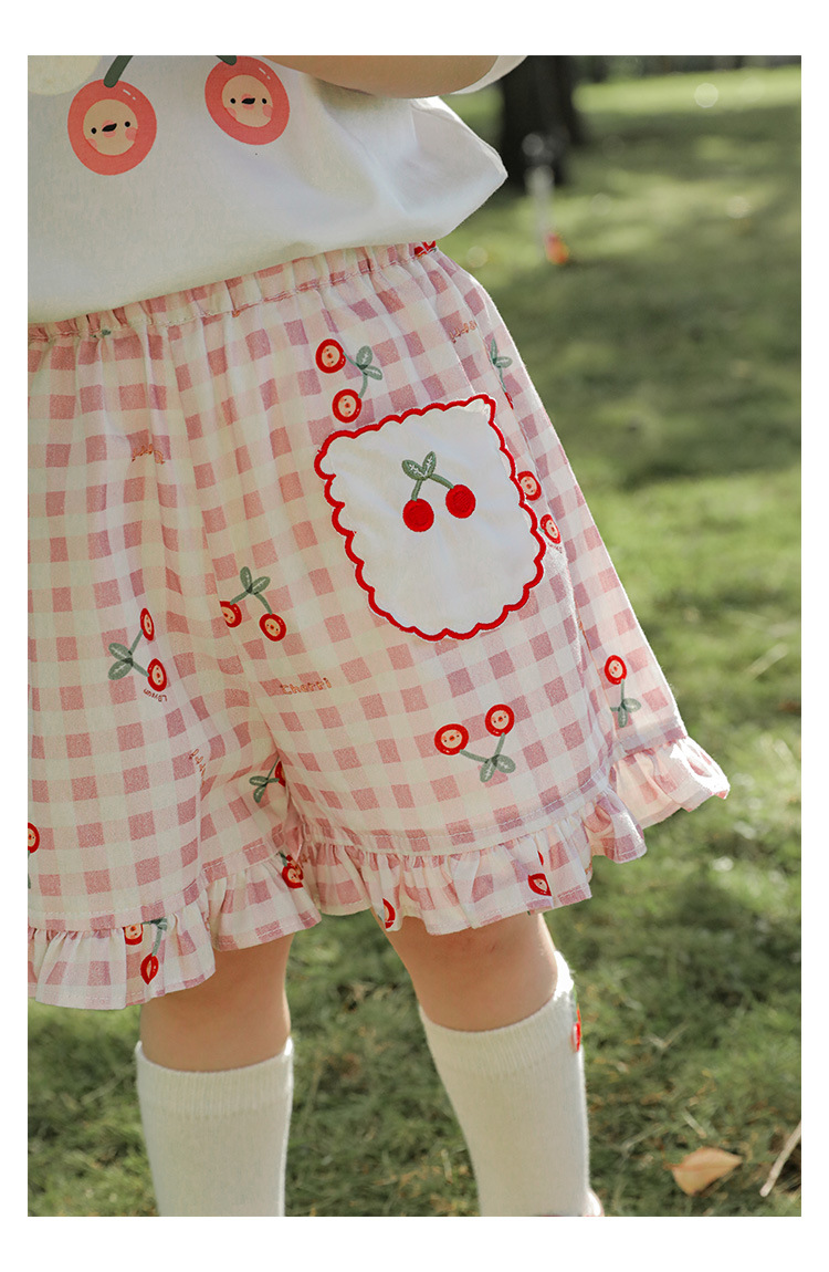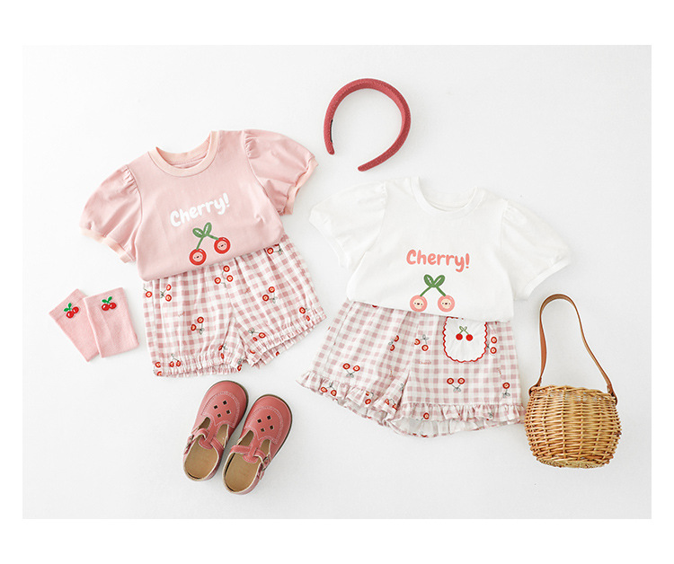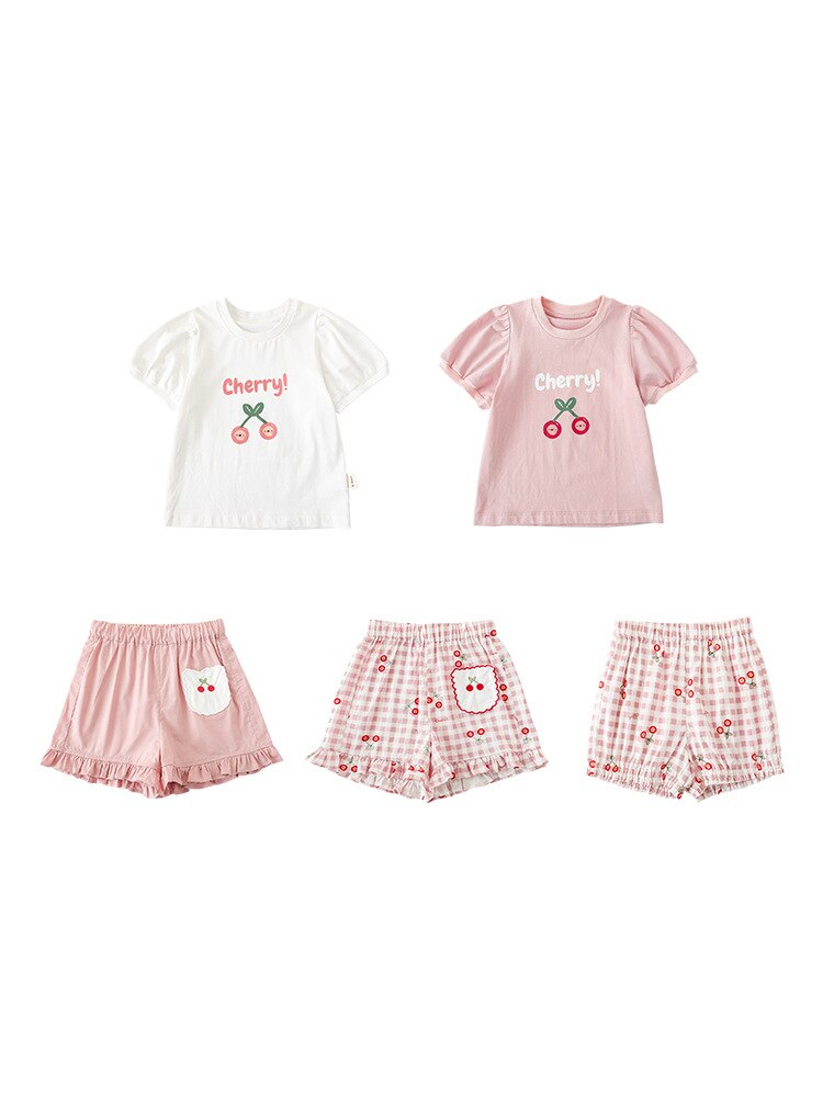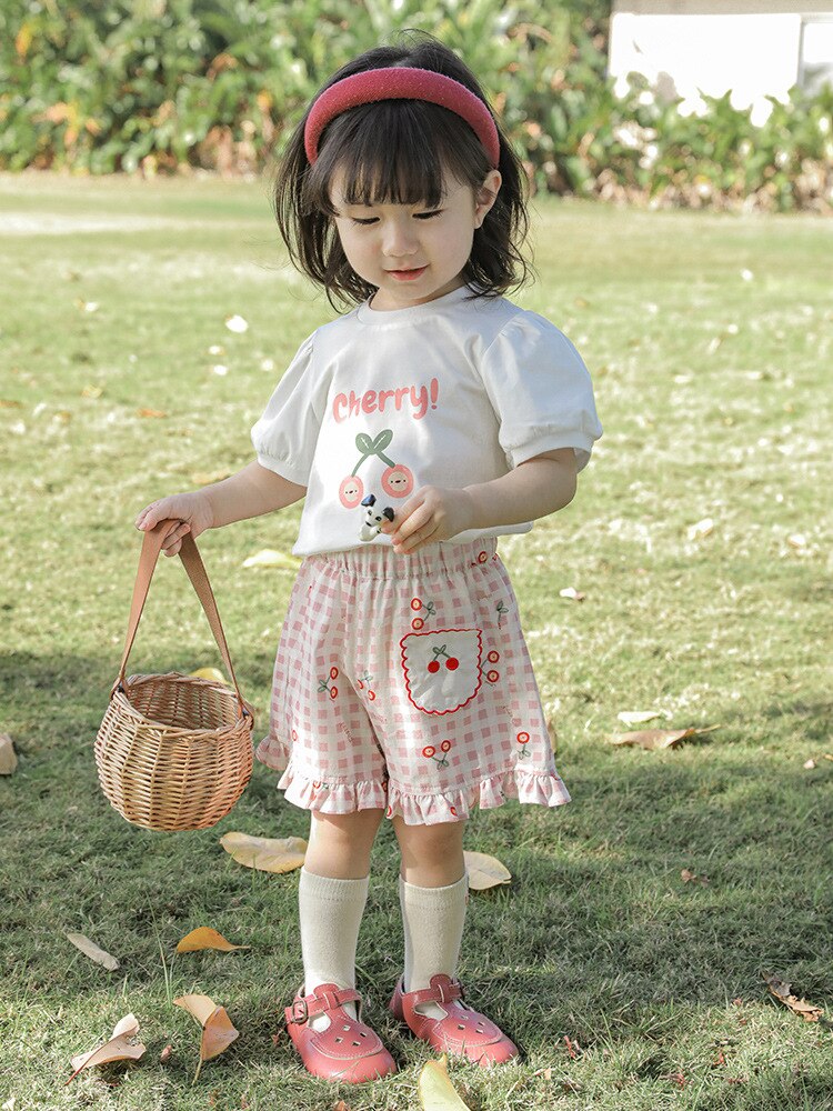 Комплект детской одежды для девочек, летняя новинка, детский комплект одежды с милым принтом и кружевной вышивкой на подоле, одежда для малышей, хлопковая футболка и шорты