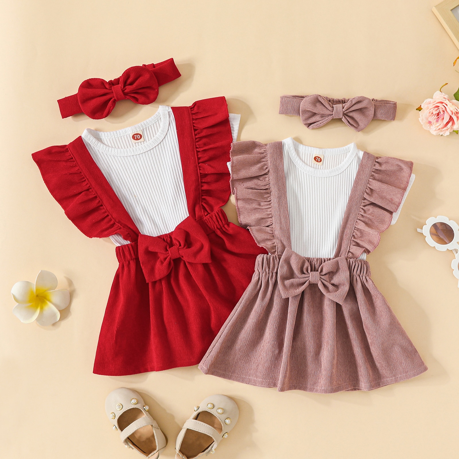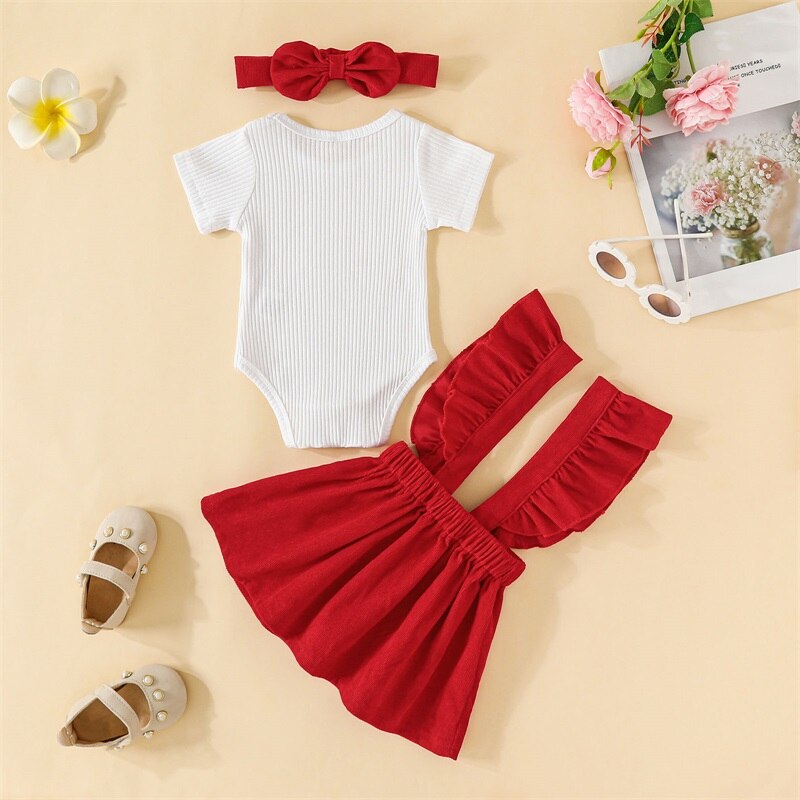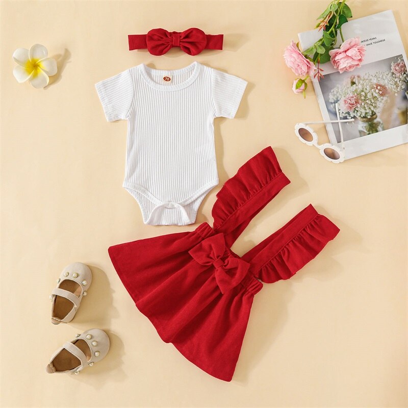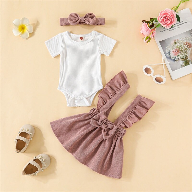 Описание: Комплекты летней одежды для маленьких девочек, белый ребристый комбинезон с короткими рукавами + Однотонная юбка на подтяжках + повязка на голову