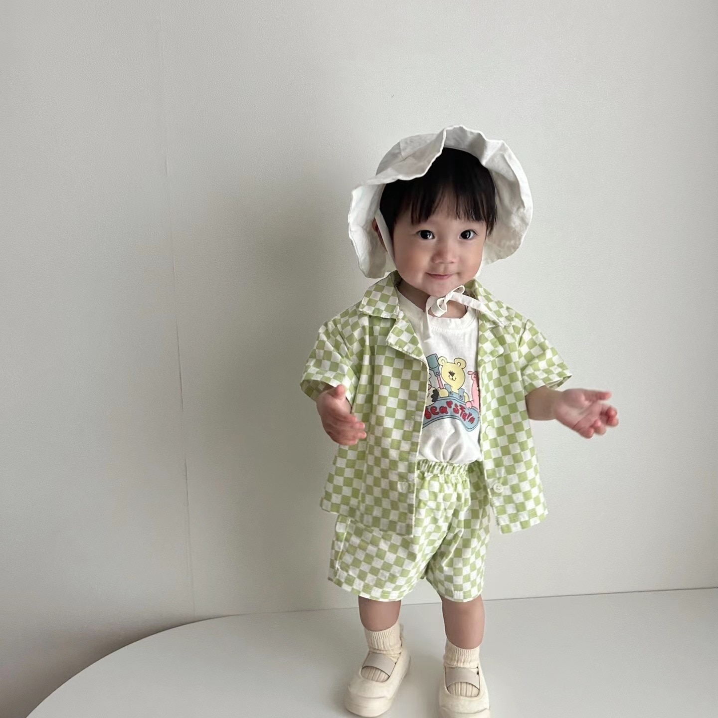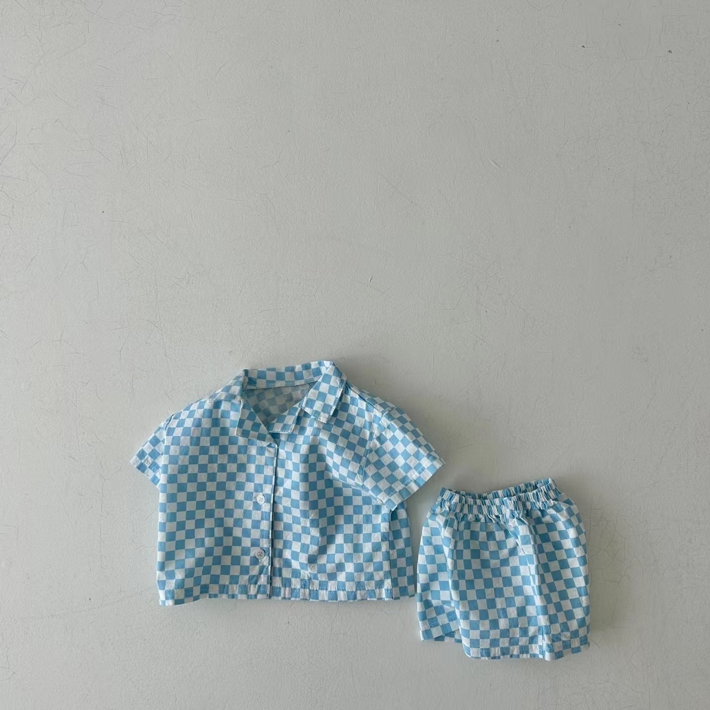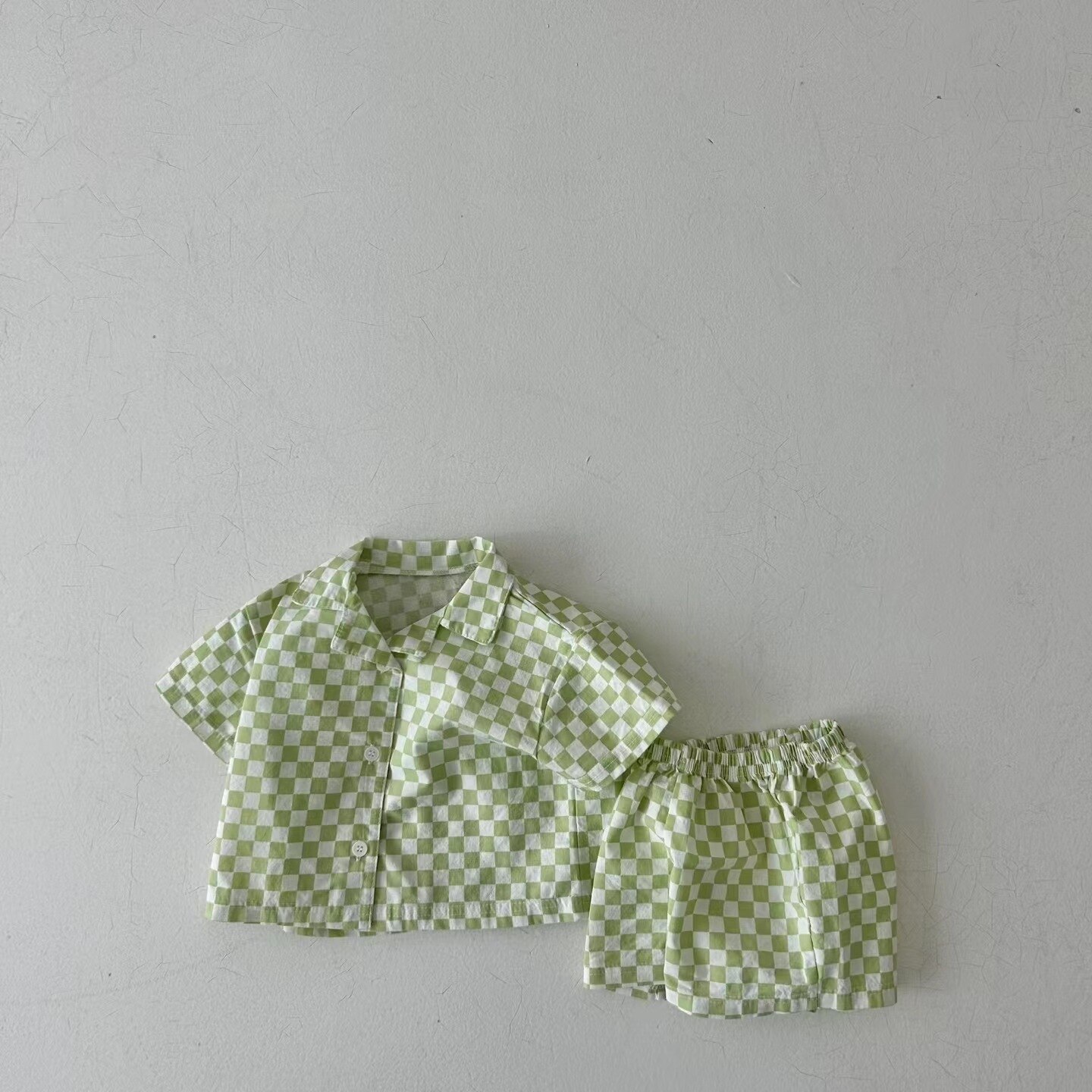 Комплект детской одежды, новинка 2023, модная Милая Детская футболка с коротким рукавом и шорты в Корейском стиле, повседневный клетчатый комплект из двух предметов