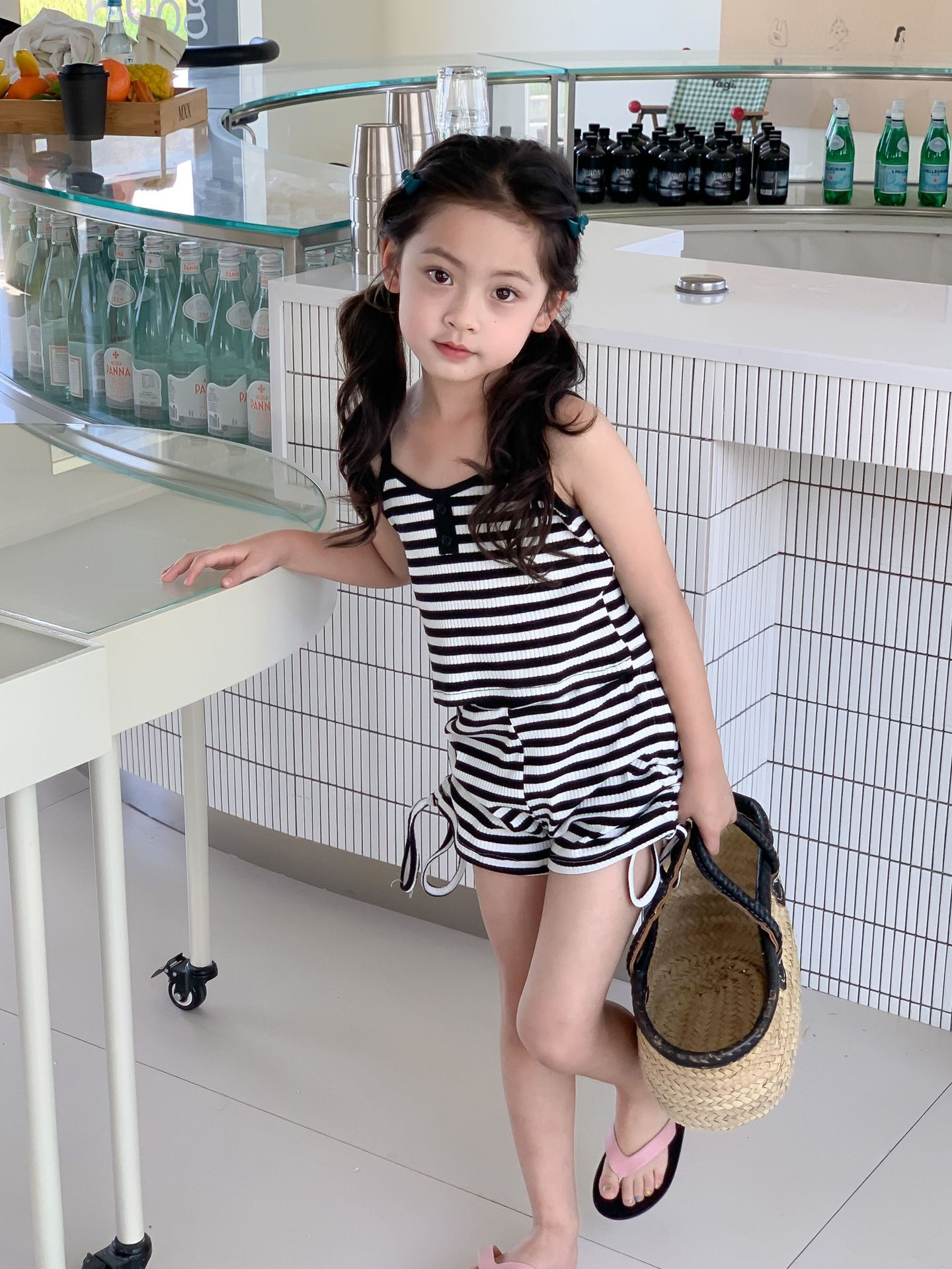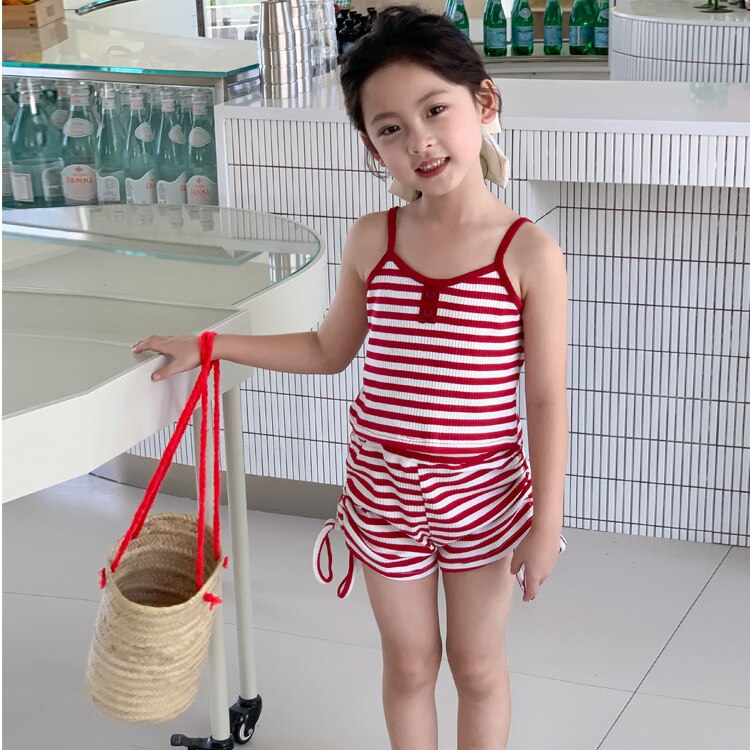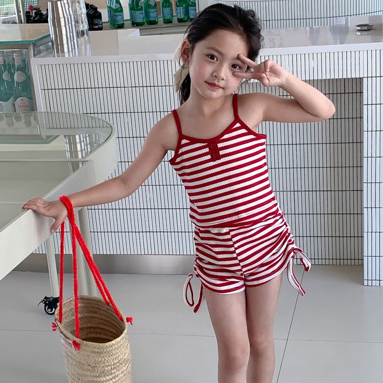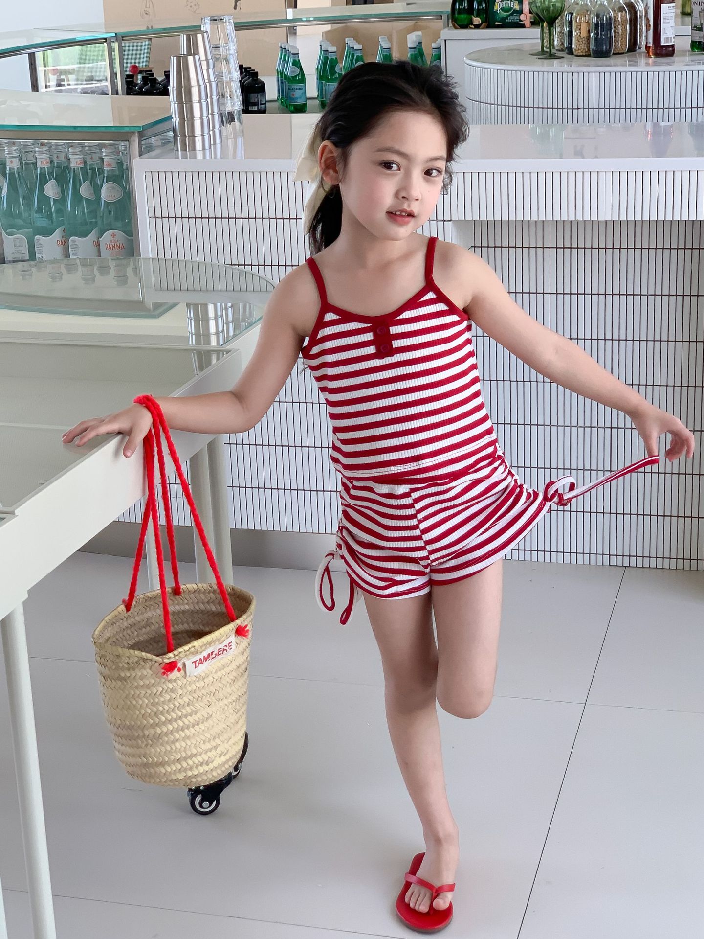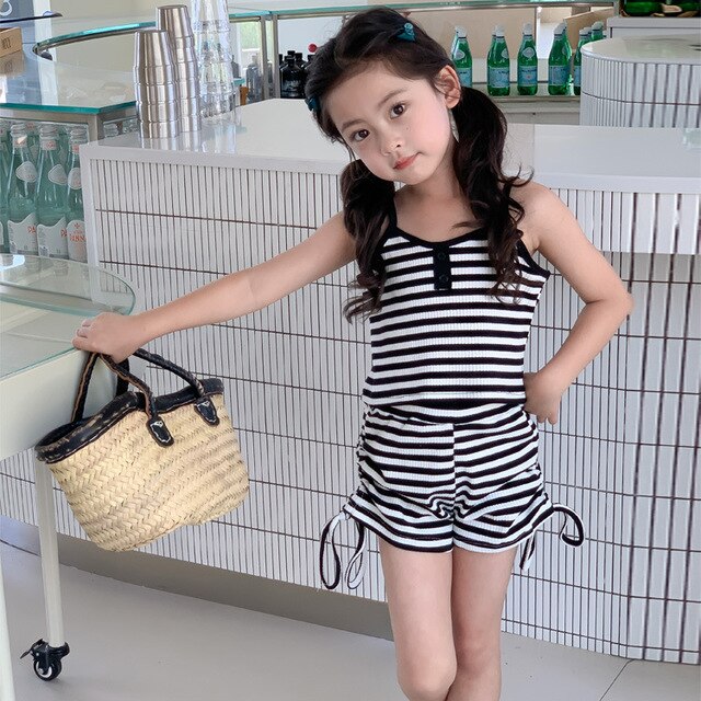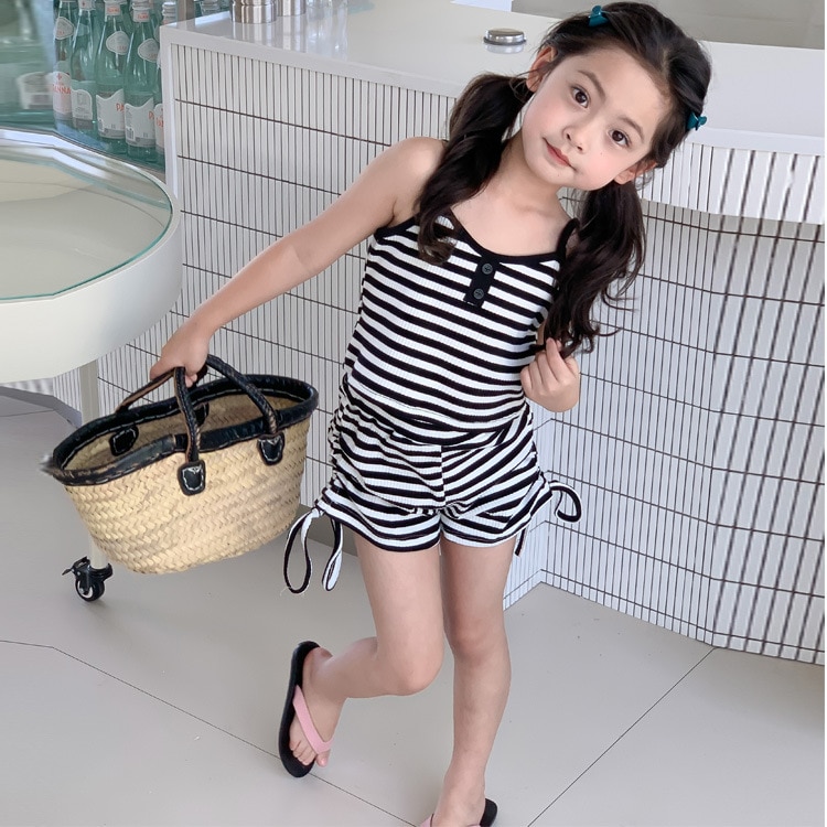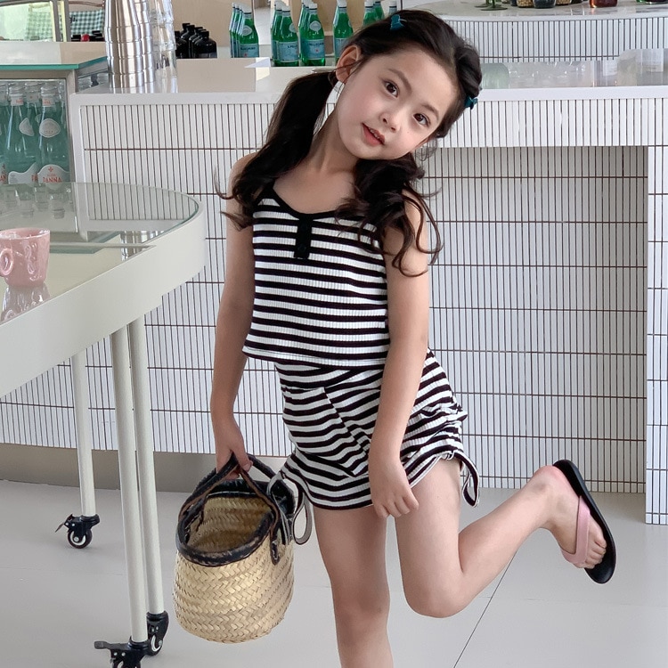 Комплект детской одежды Спайс для девочек 2023 Летний Тонкий полосатый подтяжки жилет и шорты на шнурке Повседневный простой комплект из двух предметов для детей