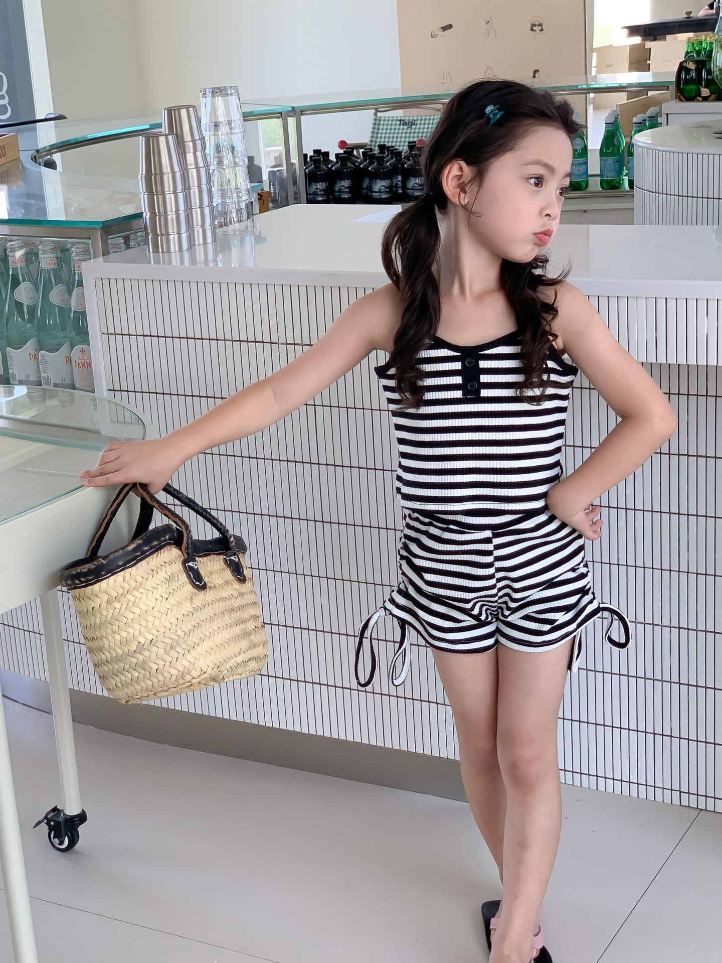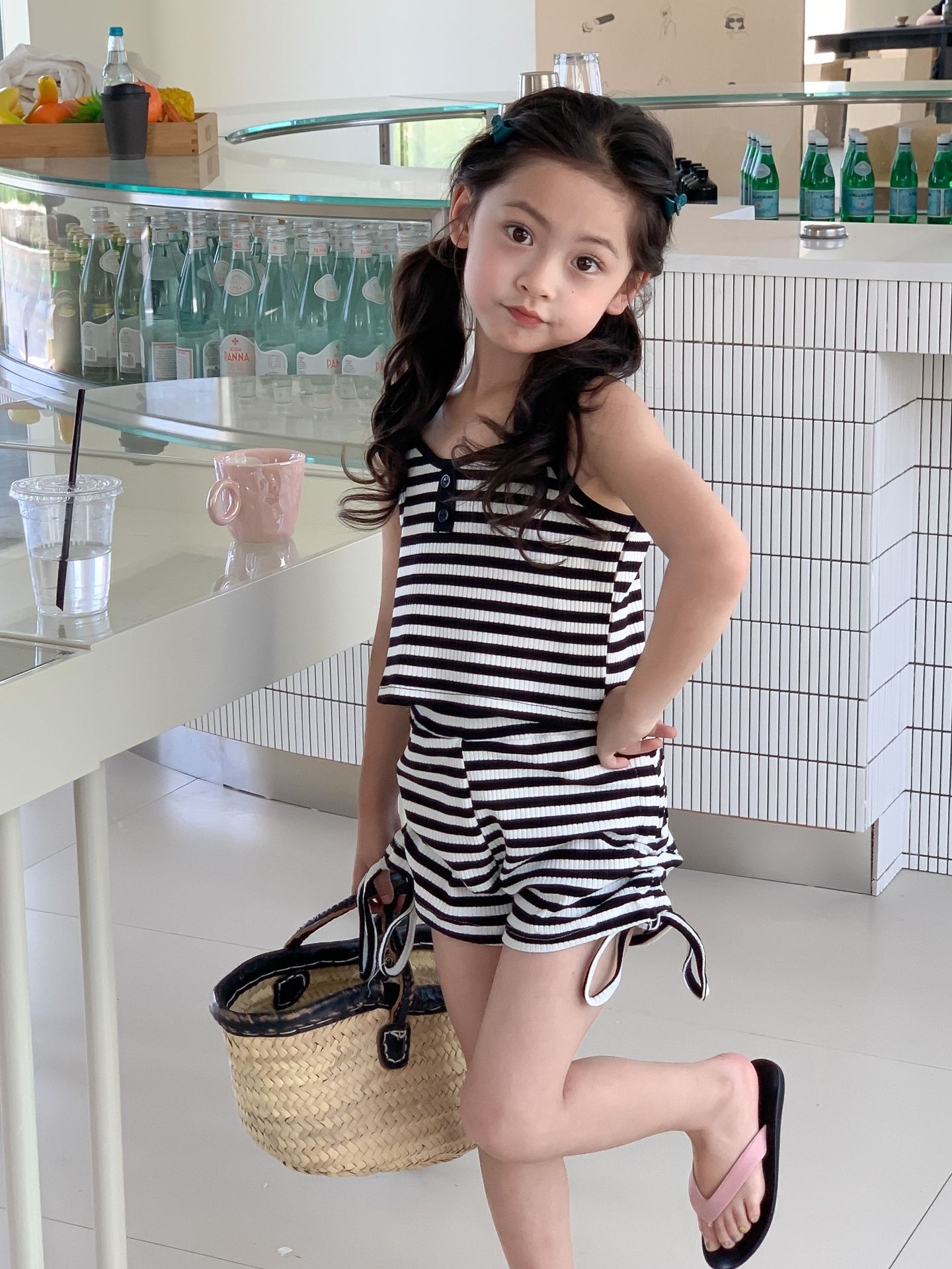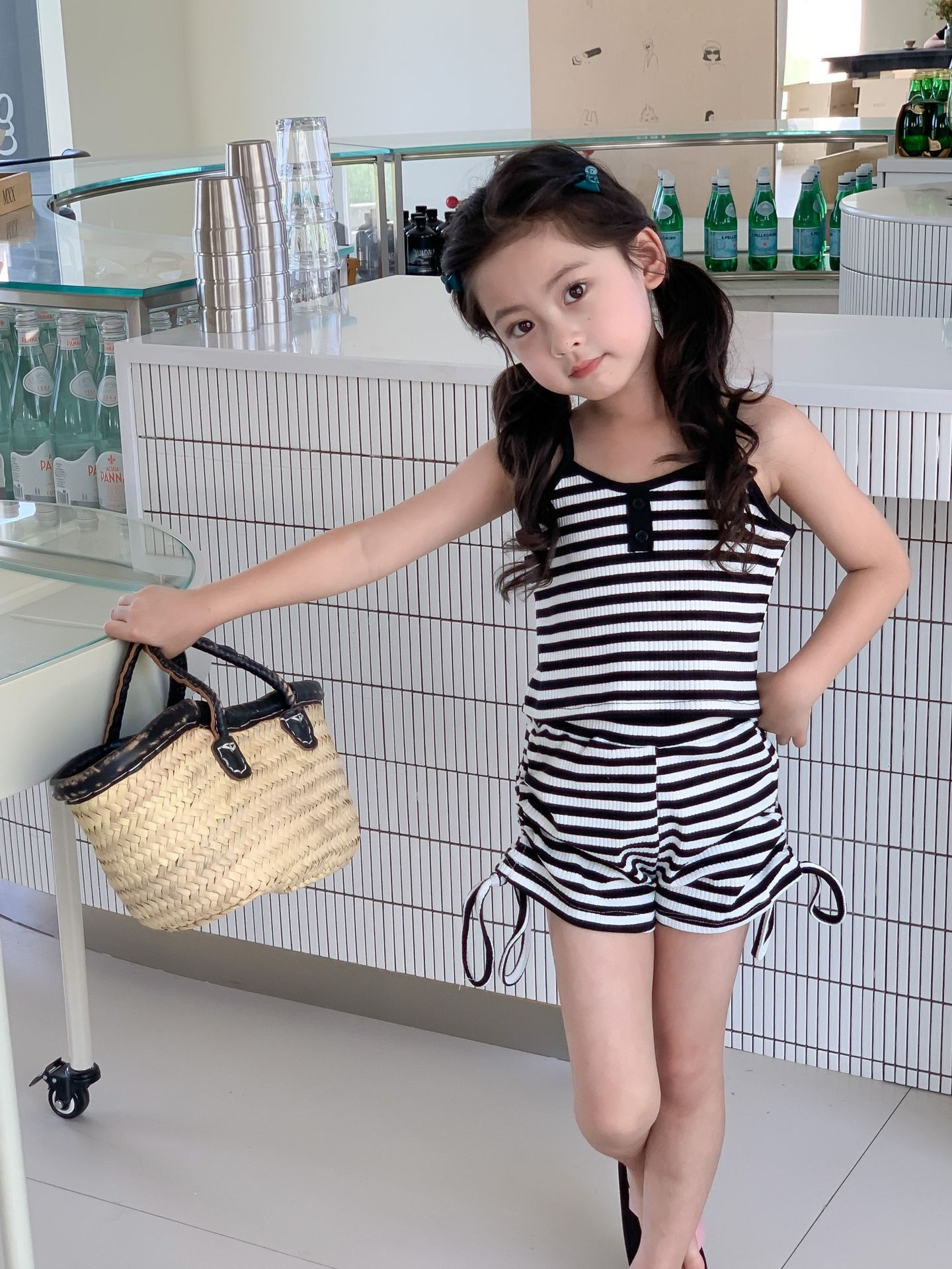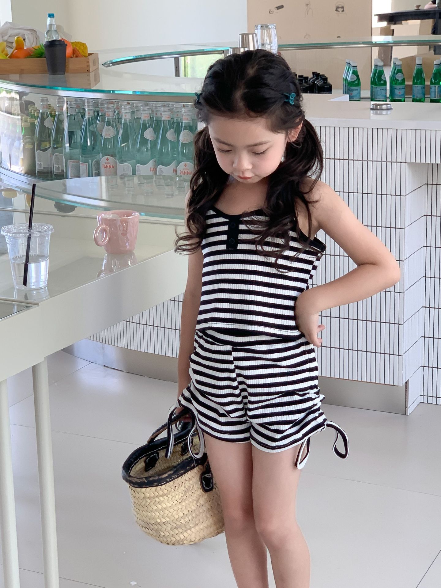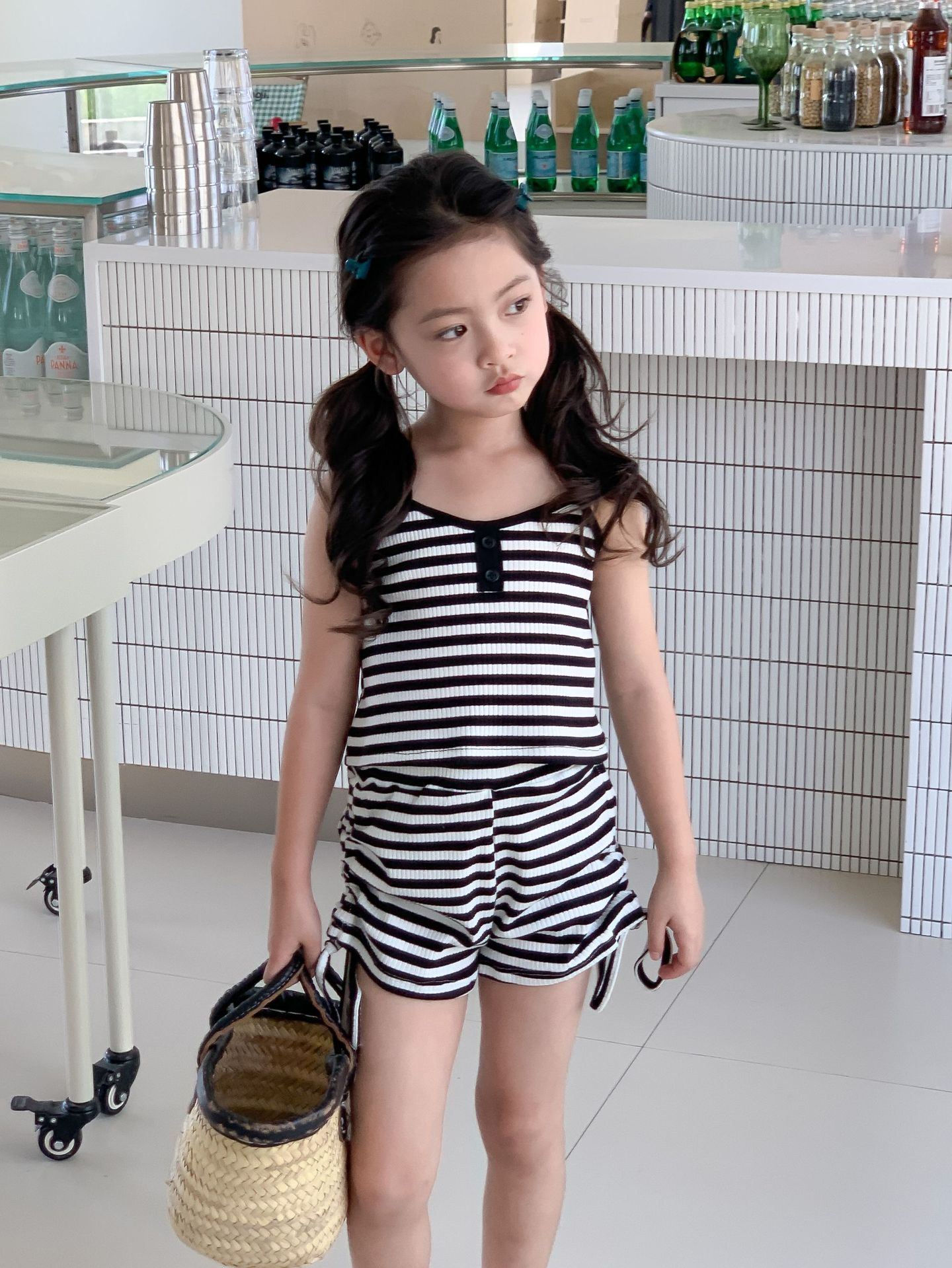 Комплект детской одежды Спайс для девочек 2023 Летний Тонкий полосатый подтяжки жилет и шорты на шнурке Повседневный простой комплект из двух предметов для детей