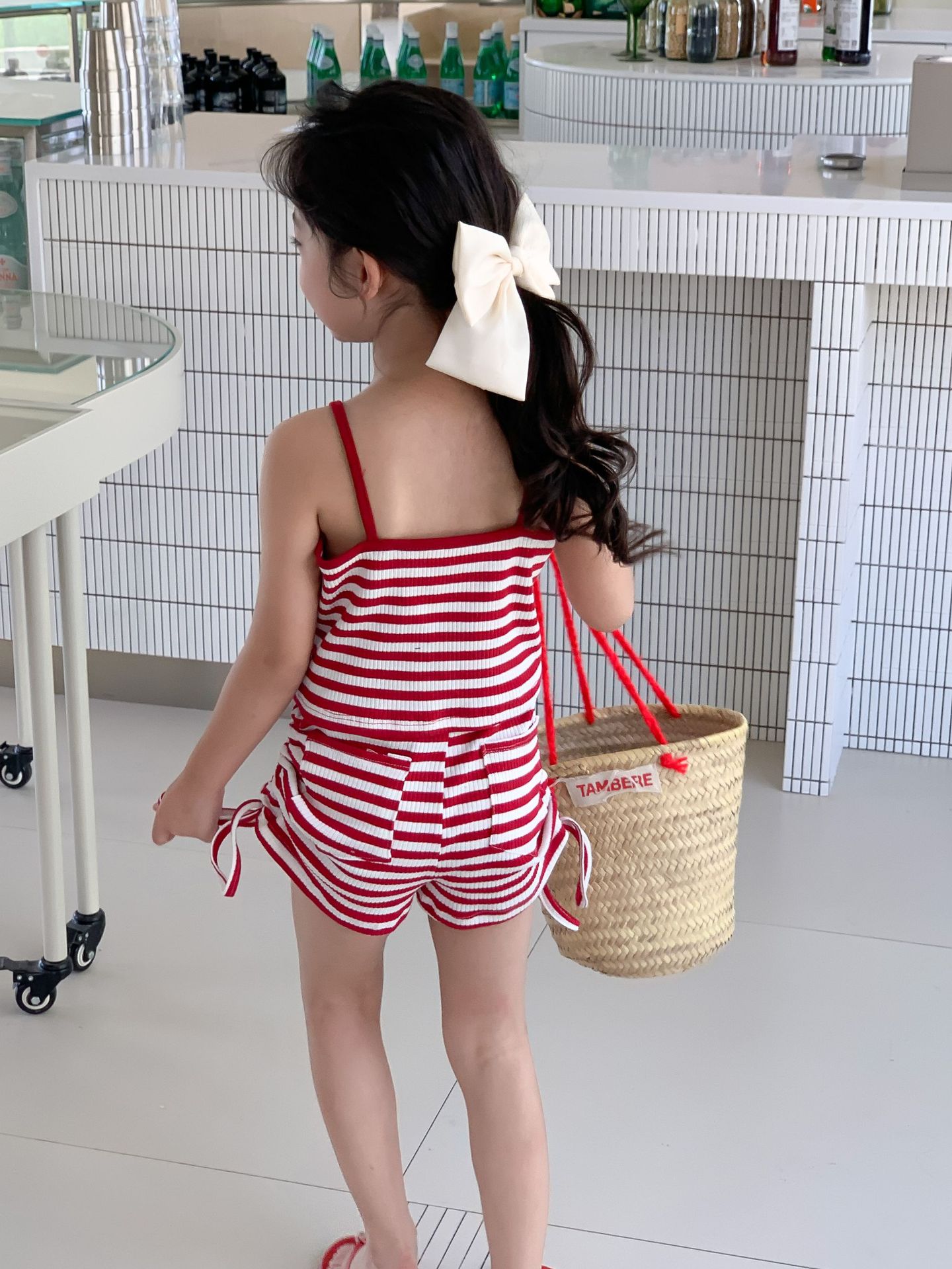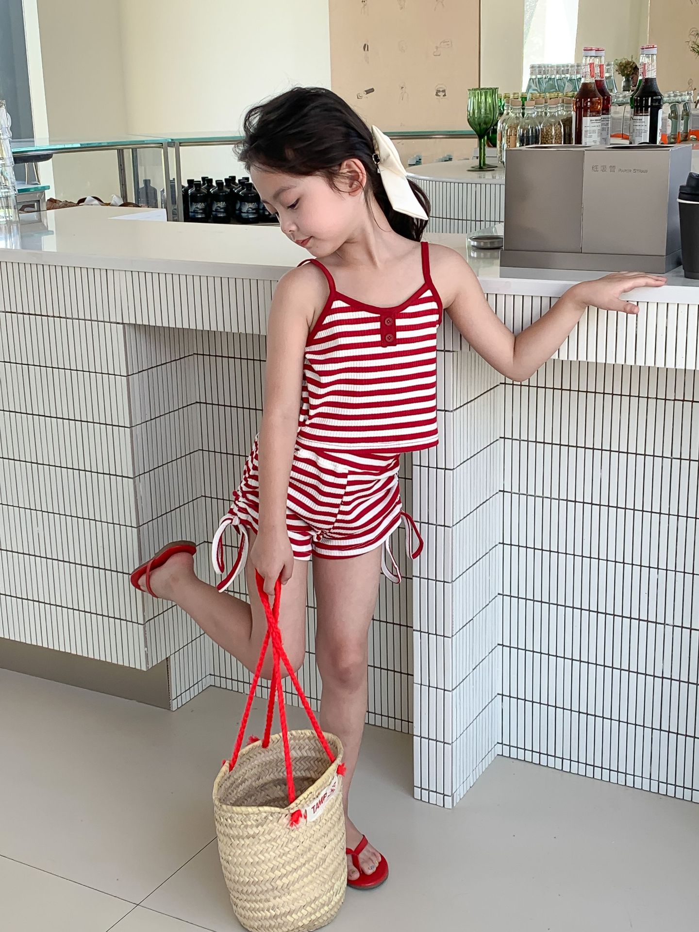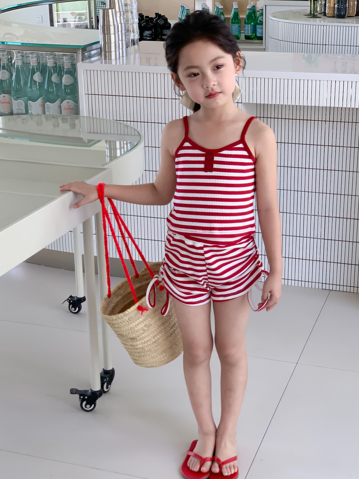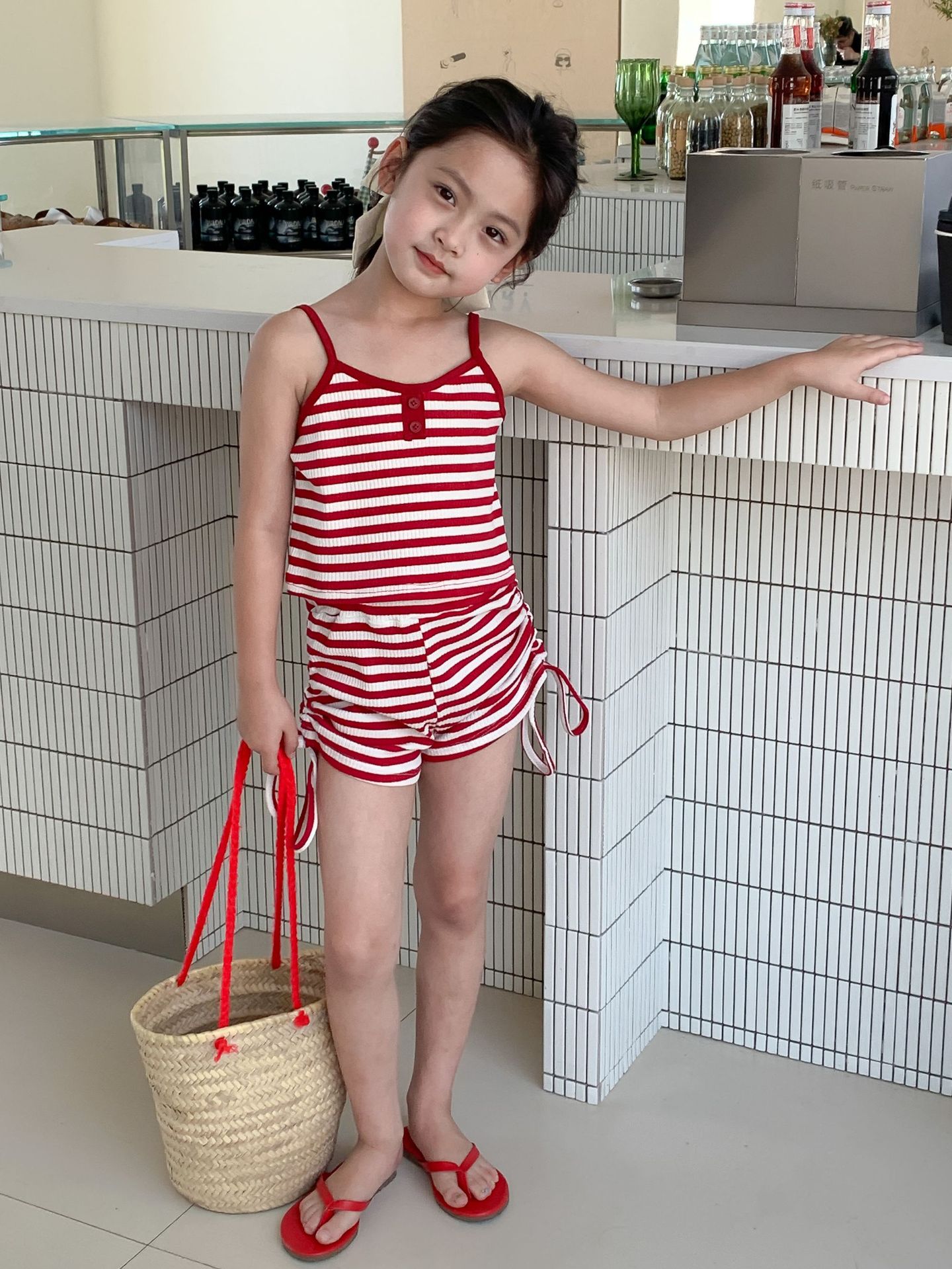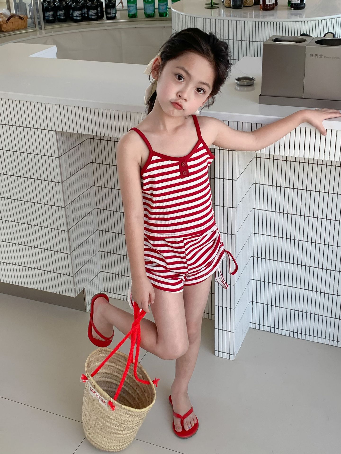 Комплект детской одежды Спайс для девочек 2023 Летний Тонкий полосатый подтяжки жилет и шорты на шнурке Повседневный простой комплект из двух предметов для детей