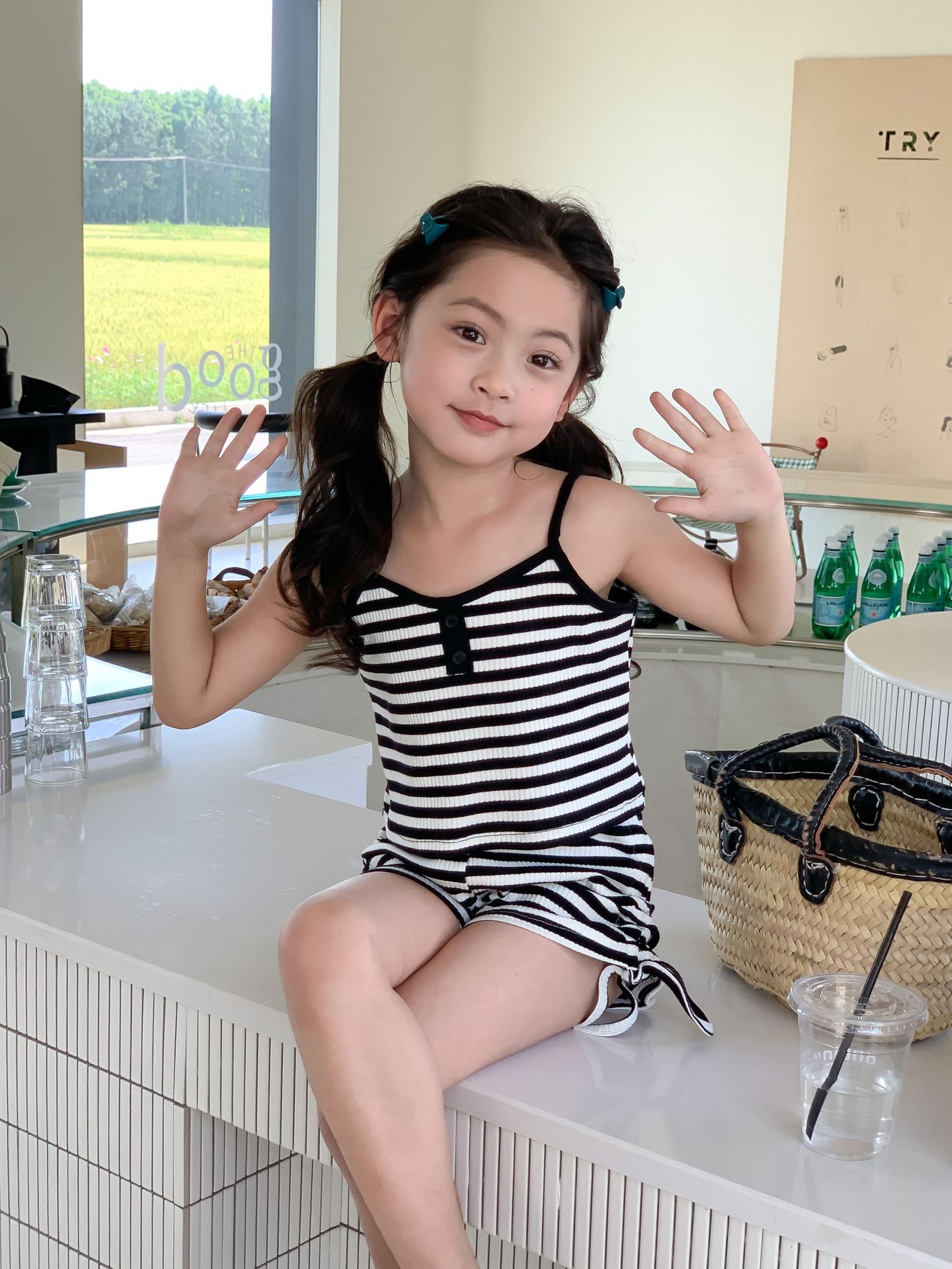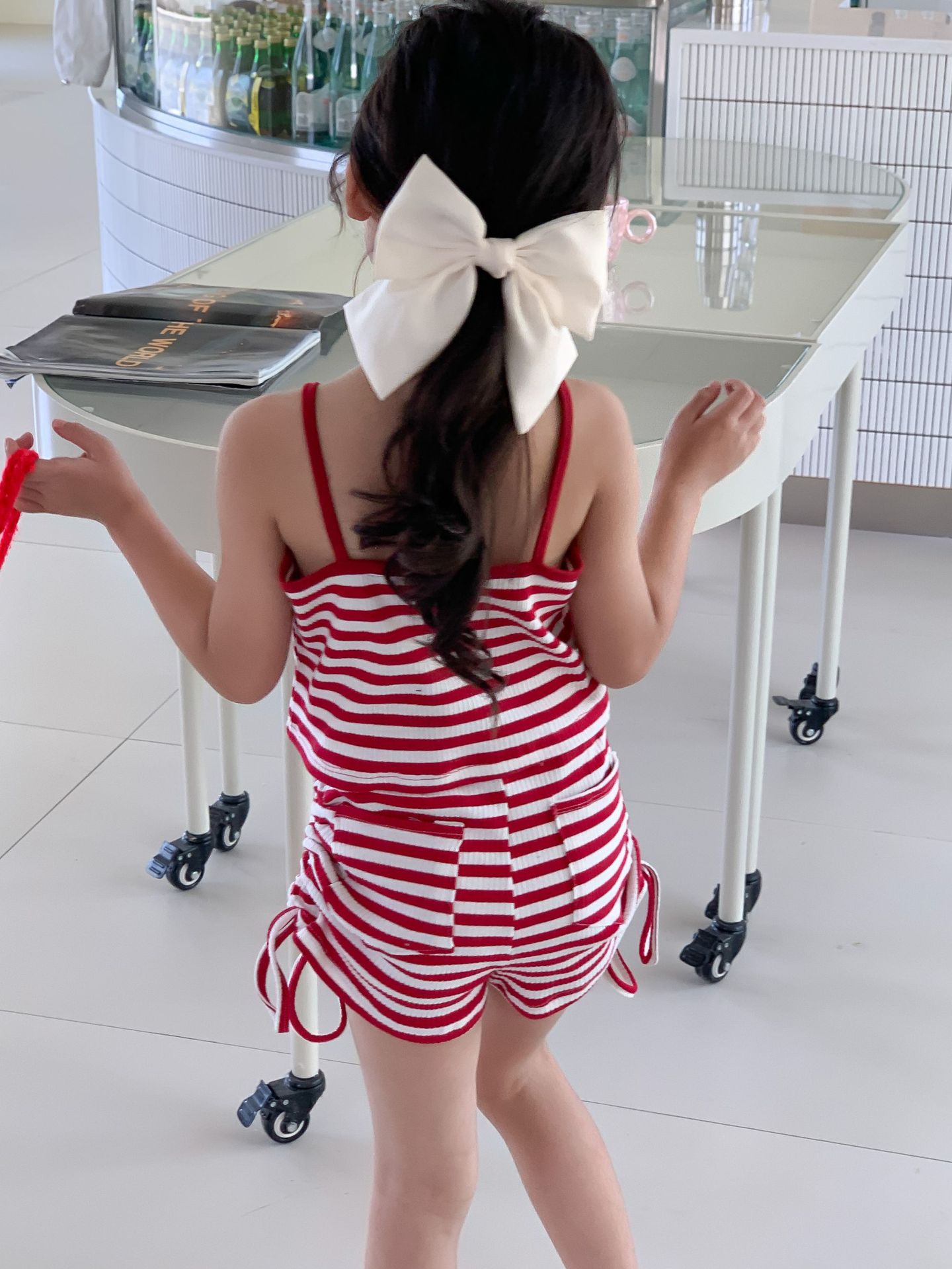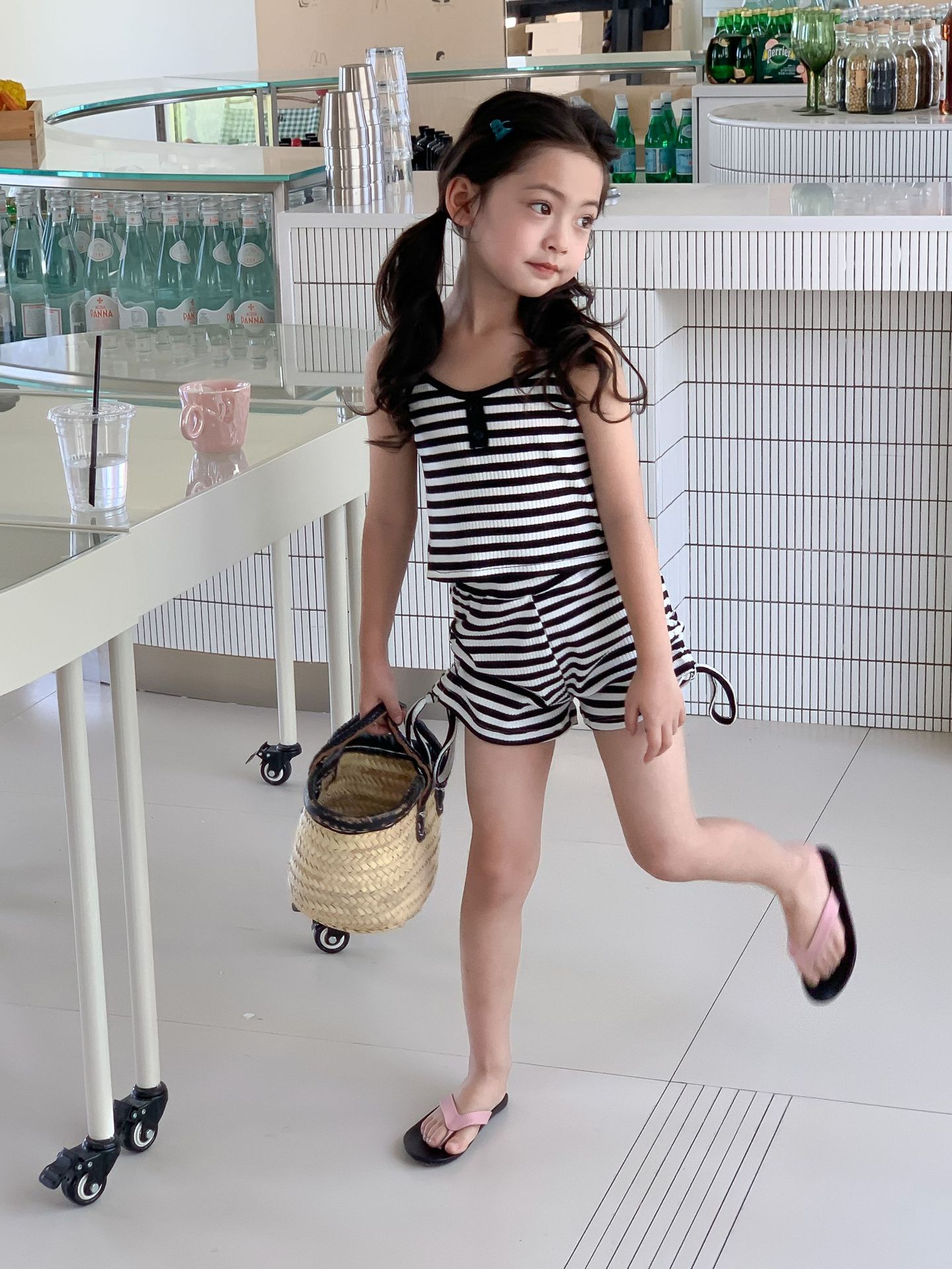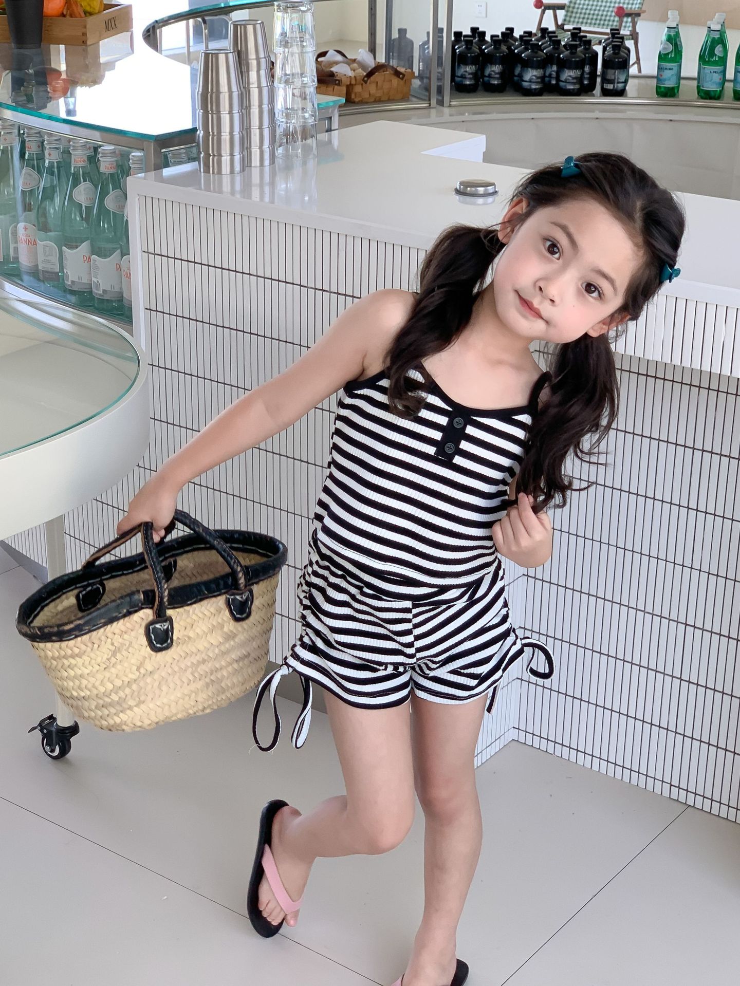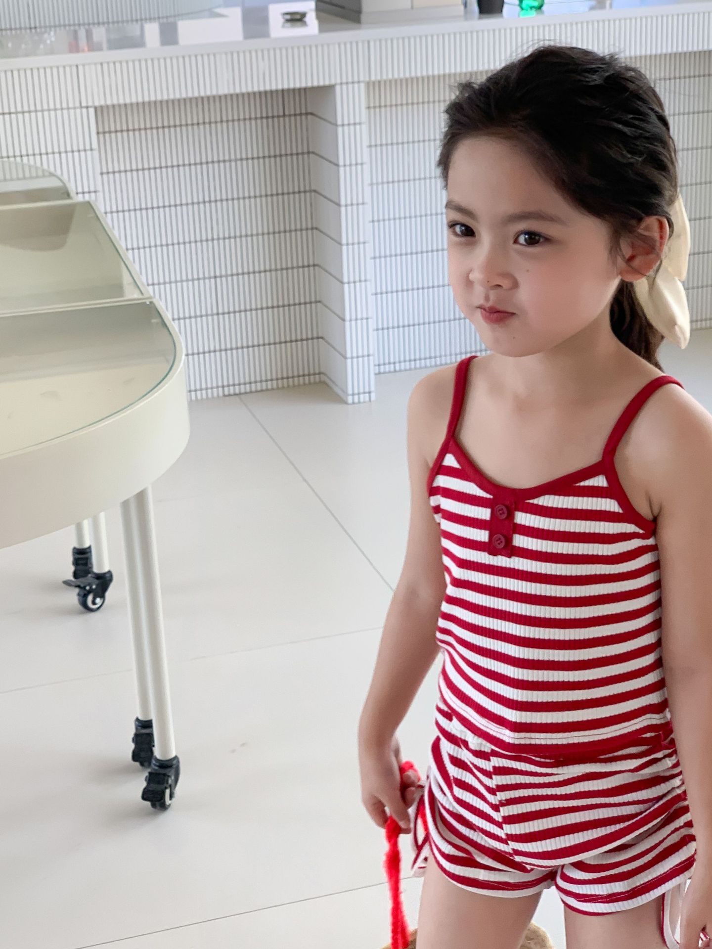 Комплект детской одежды Спайс для девочек 2023 Летний Тонкий полосатый подтяжки жилет и шорты на шнурке Повседневный простой комплект из двух предметов для детей