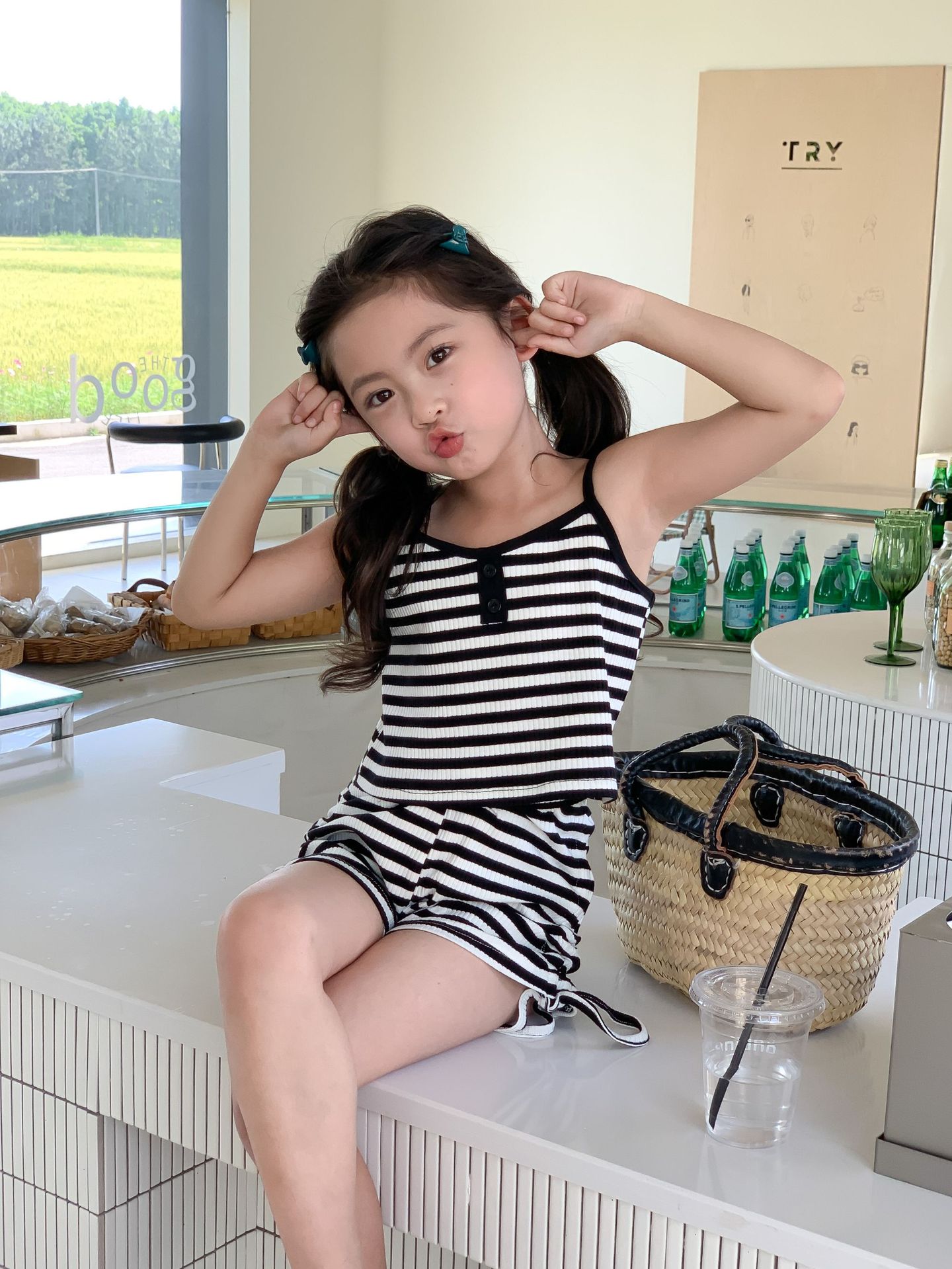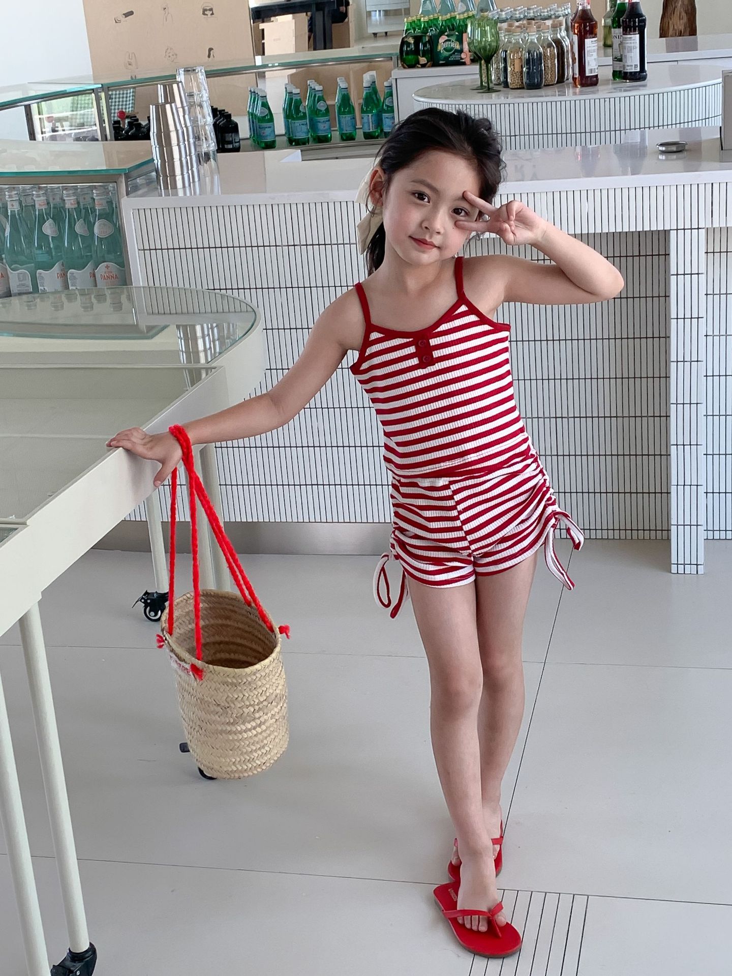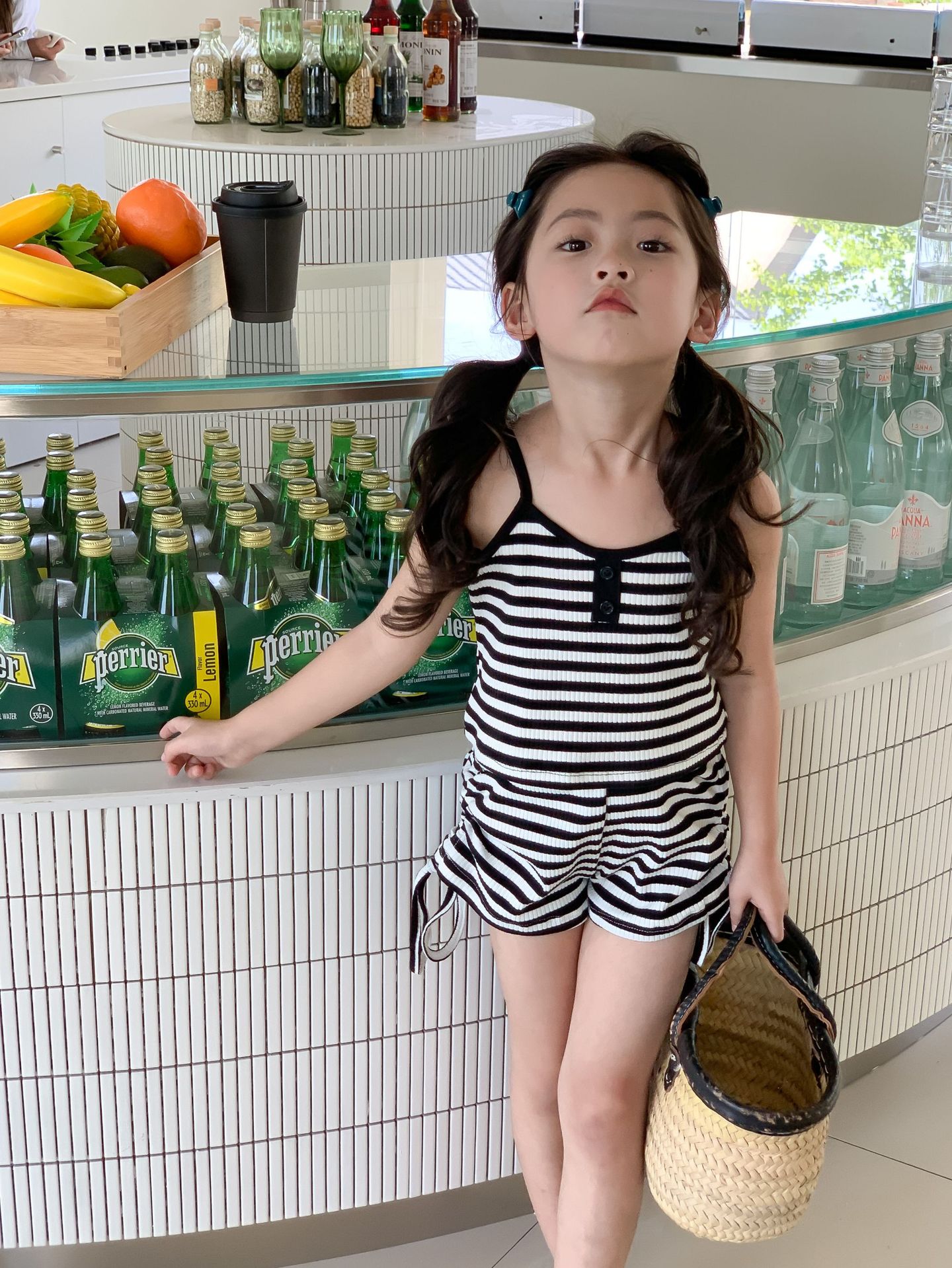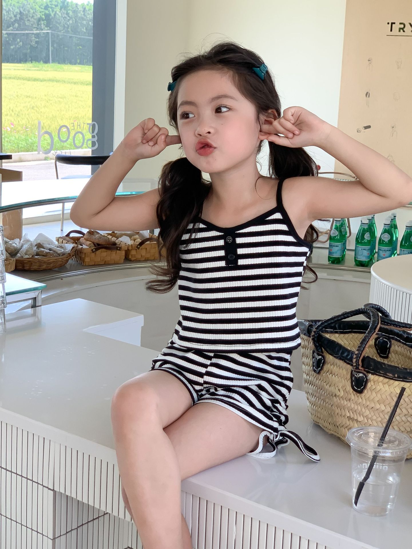 Комплект детской одежды Спайс для девочек 2023 Летний Тонкий полосатый подтяжки жилет и шорты на шнурке Повседневный простой комплект из двух предметов для детей