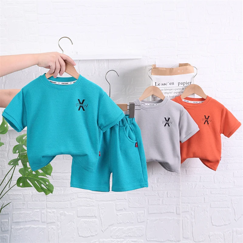 Комплект детской повседневной одежды, новинка 2023, летний костюм с коротким рукавом для маленьких мальчиков и девочек, комплект из 2 предметов с вышивкой буквами для малышей, детская одежда