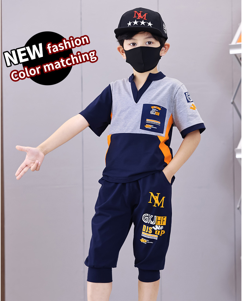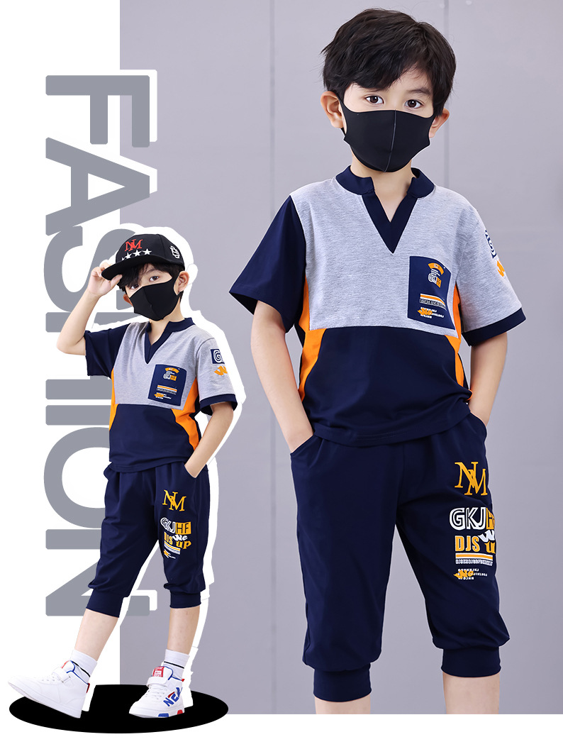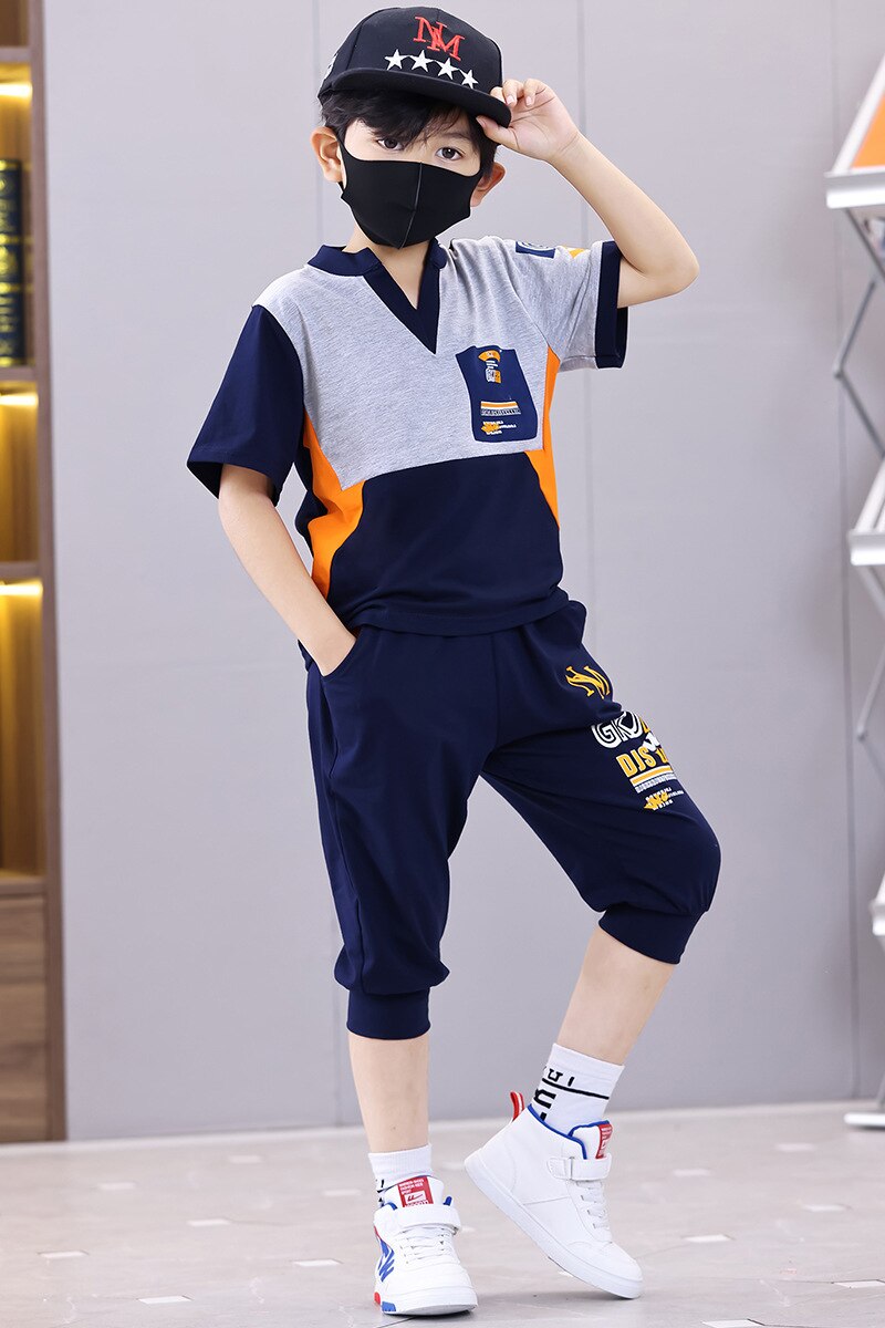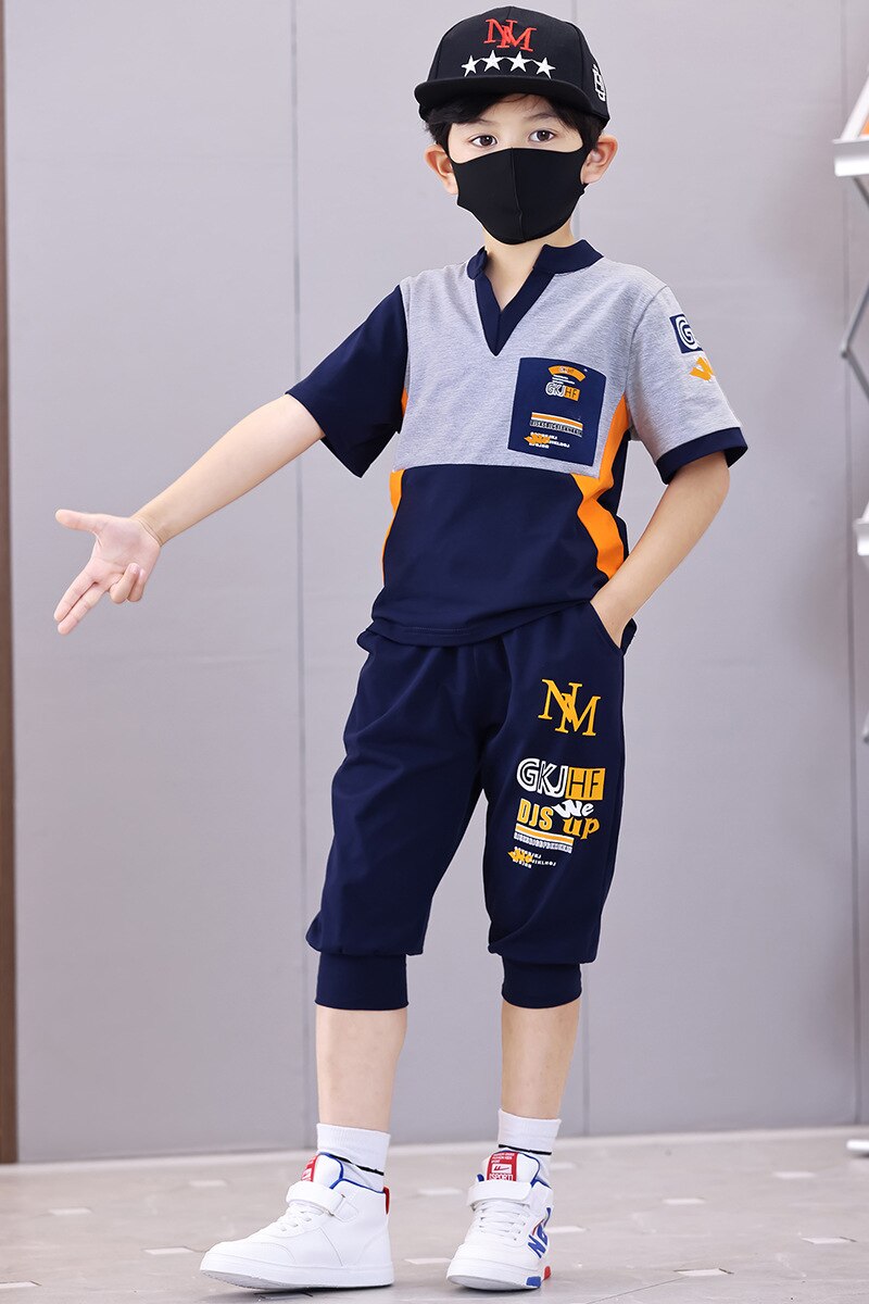 Комплект для мальчиков с V-образным вырезом, карманами и буквенным принтом