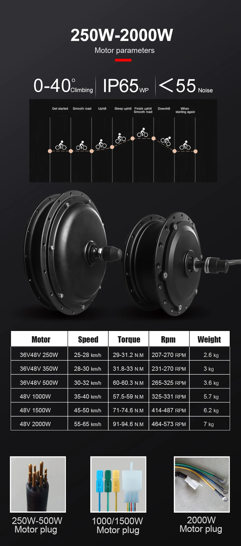 • 2000 Вт 【Без редукта】 около 55-65 км/ч; 464-537 об/мин; 91-94,6 Нм