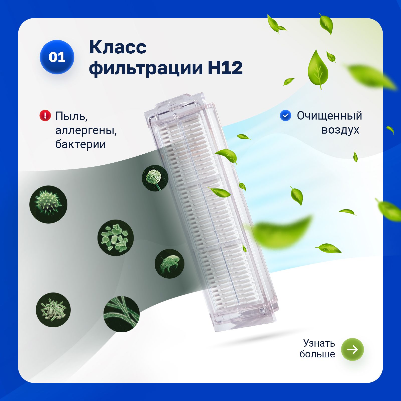 • Фильтры обеспечивают эффективную очистку воздуха до 99,9%, значительно уменьшая попадание пыли, пыльцы, продукты жизнедеятельности домашних животных и других аллергенов в воздух, которым вы дышите.⠀
