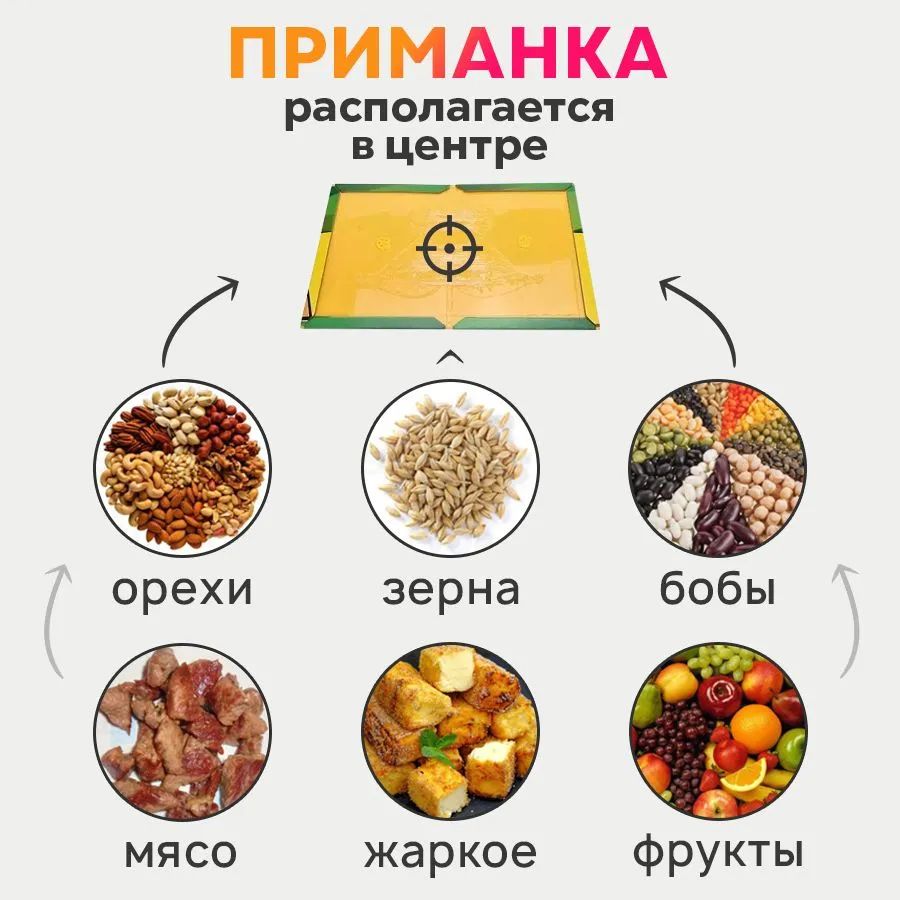 Описание: Клеевая картонная ловушкаПовадились в дом мыши или стало трудно защитить урожай от набега полевок? Рекомендуем купить надежное клеевое средство, современную мышеловку на основе высокотехнологичного клея. Клей безвреден для человека и животных, не наносит вреда окружающей среде. Одна мышеловка может захватить несколько вредителей. Собрать и установить ее не представляет сложности. Мышеловка может быть установлена на кухне иди в кладовке даже вблизи пищевых продуктов без риска их порчи.Инструкция по применениюШаг 1Раскройте ловушку и аккуратно удалите защитные от склеивания стикерыШаг 2 Закройте плотно ловушку, чтобы клеевой слой верхней и нижней части соприкоснулся Шаг 3Аккуратно и медленно раскройте ловушку Шаг 4 Насыпьте приманку по центру на клеевую основу ловушки