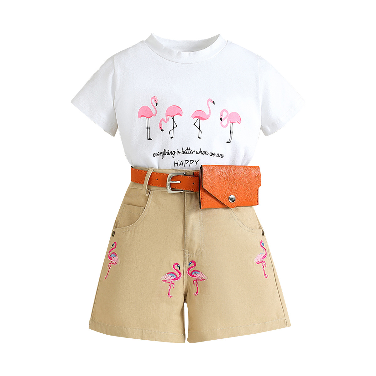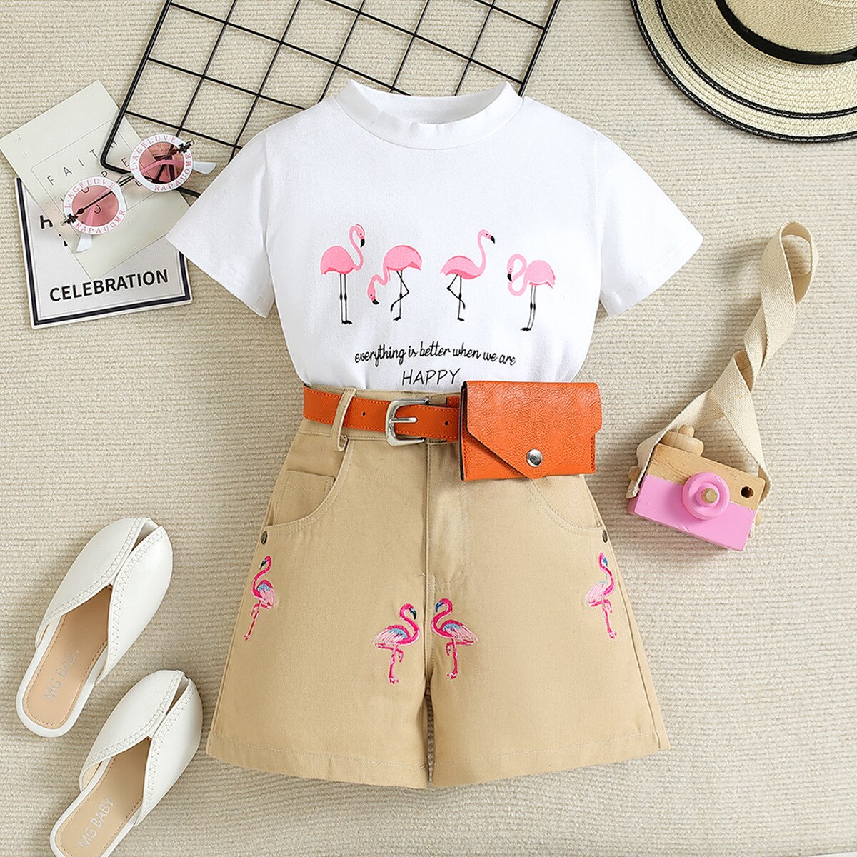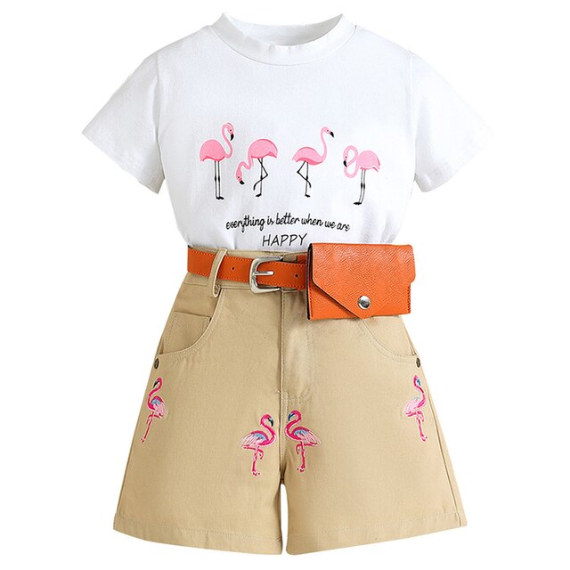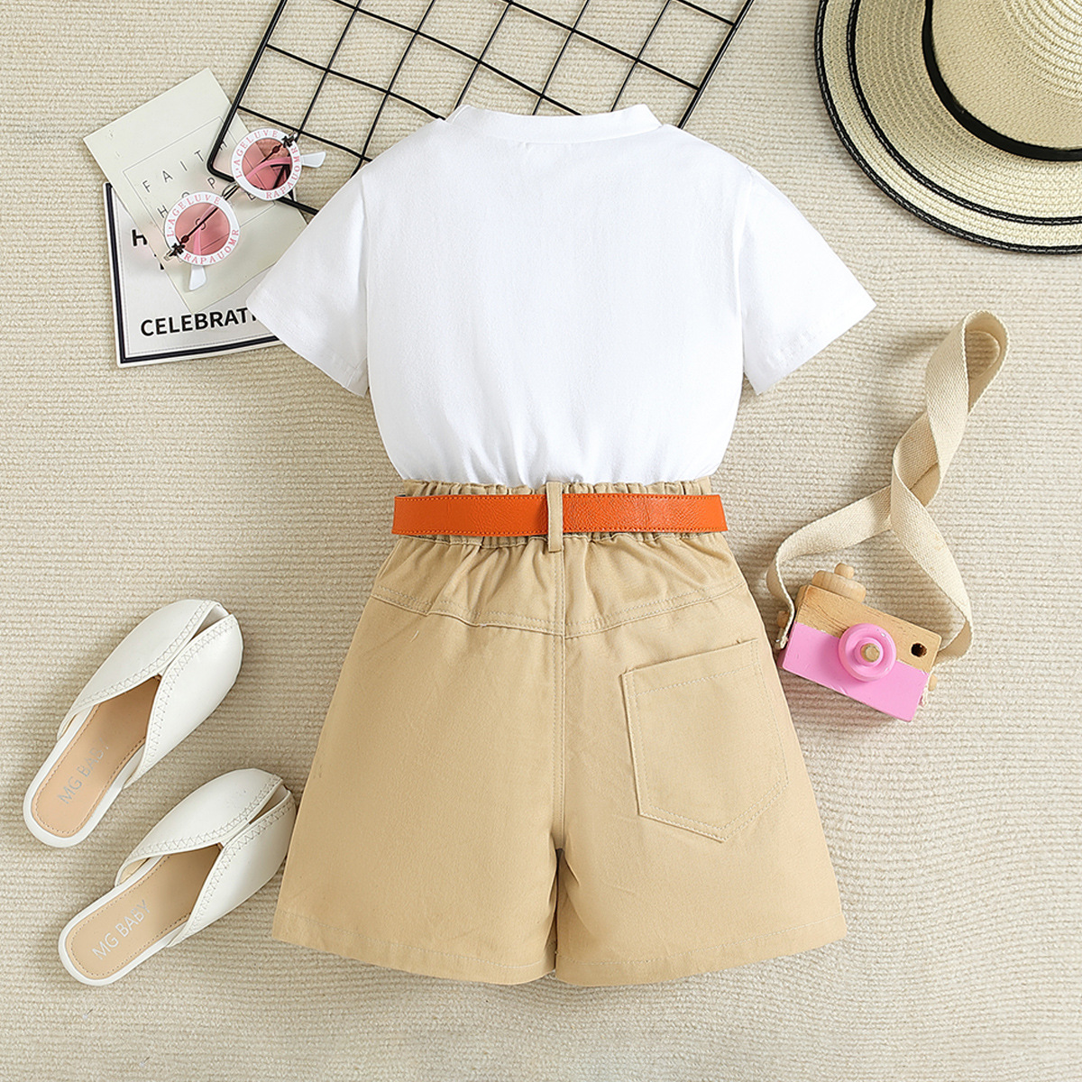 Комплект из 3 предметов, летняя детская одежда, модные корейские хлопковые топы с коротким рукавом и мультяшным принтом для девочек + шорты + пояс, Роскошная детская одежда BC599