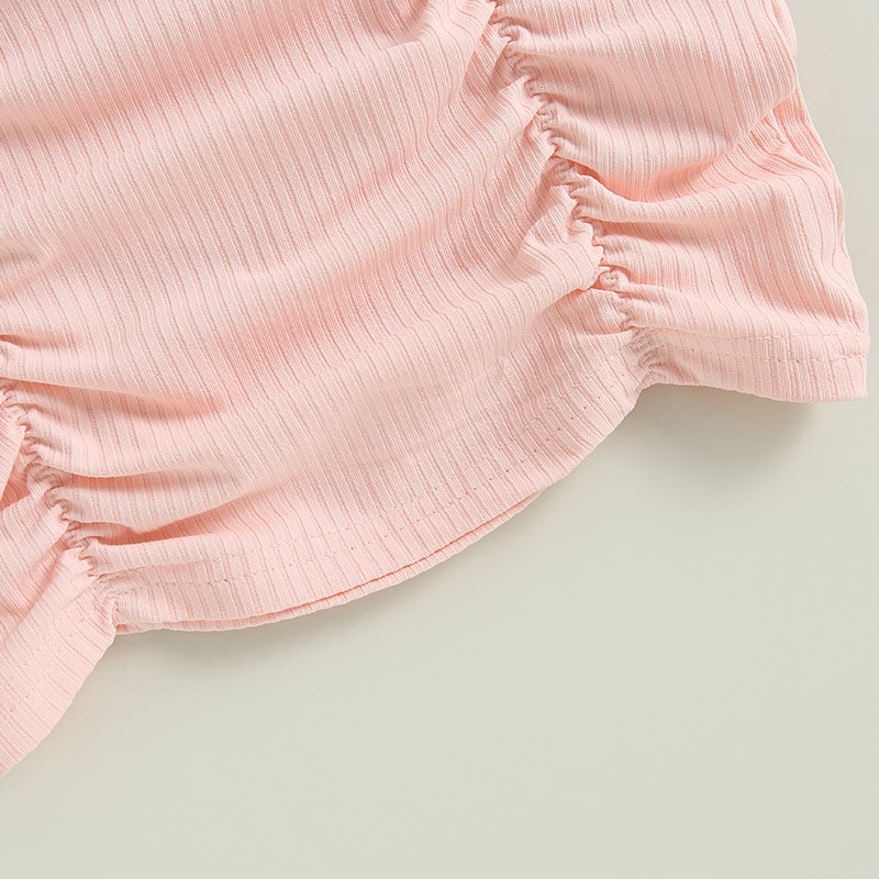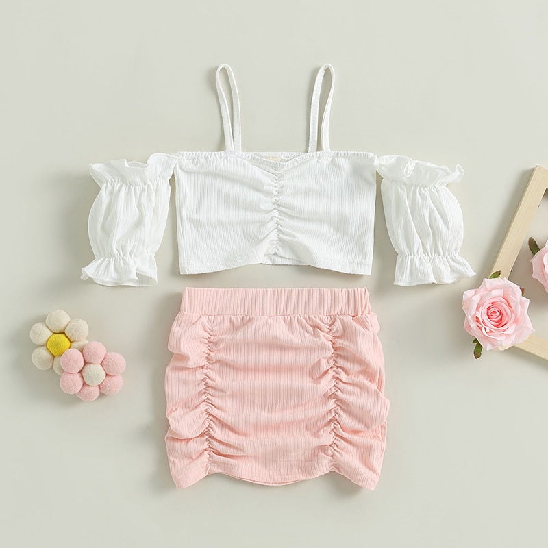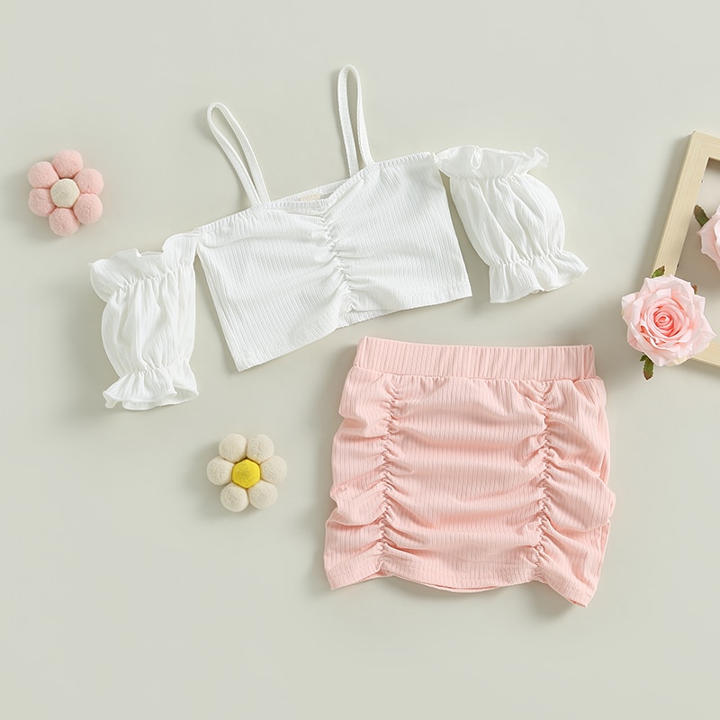 Комплект из двух предметов для маленьких девочек, однотонный укороченный топ с открытыми плечами и пышными рукавами и мини-юбка с рюшами, летняя одежда для девочек