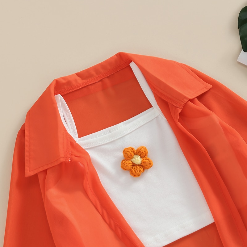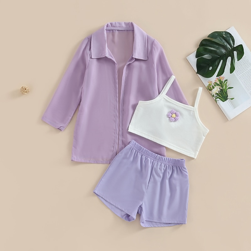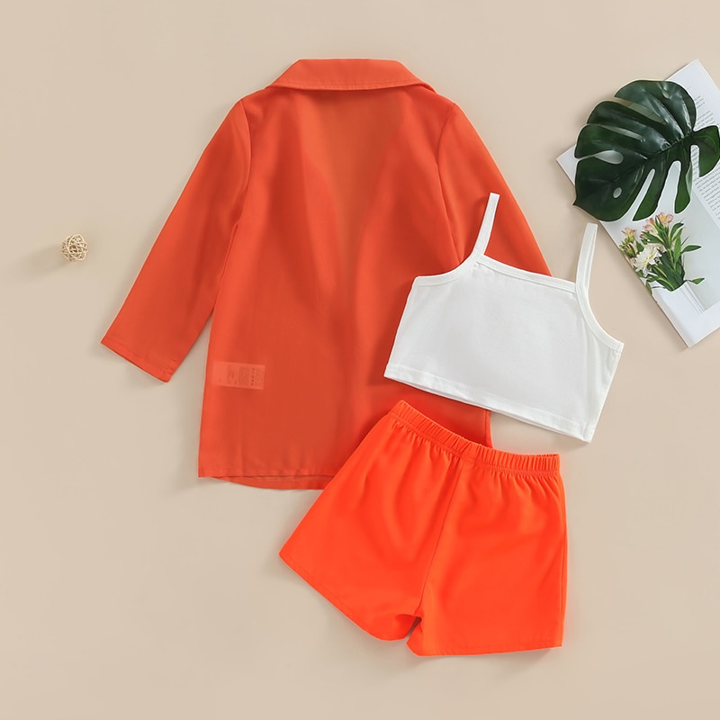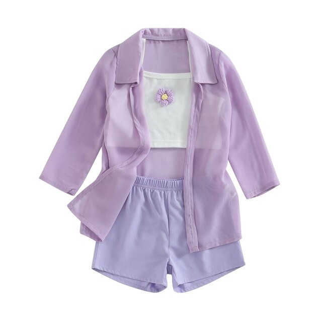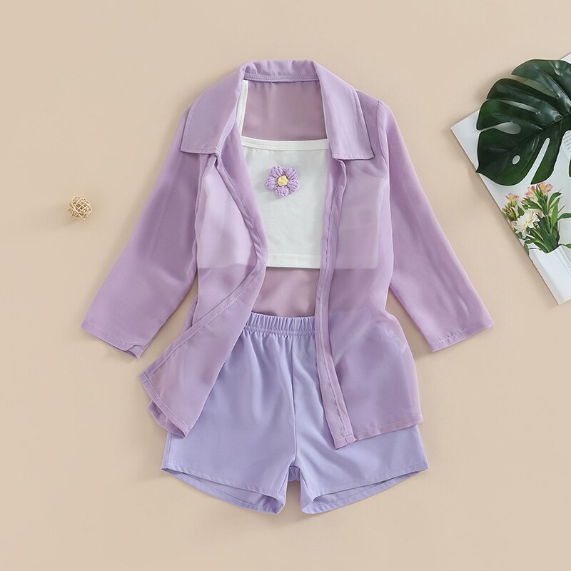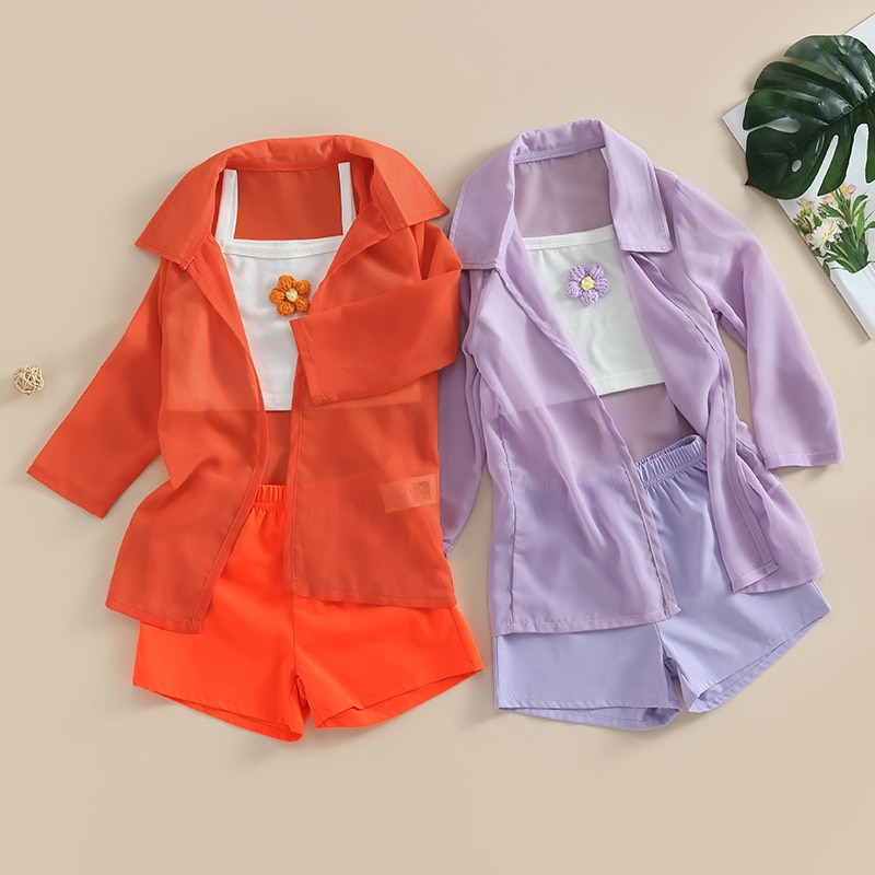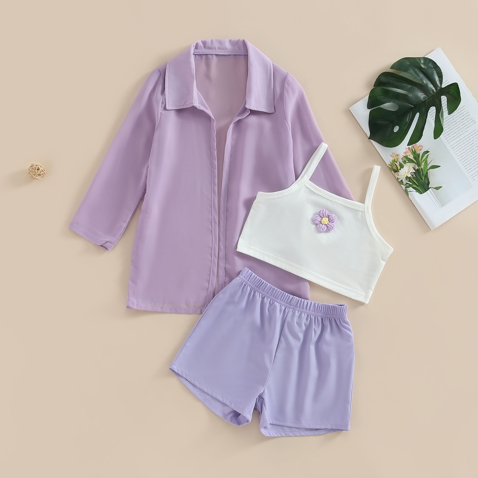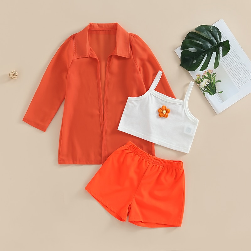 Комплект из трех предметов для девочек, блузка на бретельках без рукавов с цветочным принтом, повседневные шорты и шифоновый пиджак с длинным рукавом