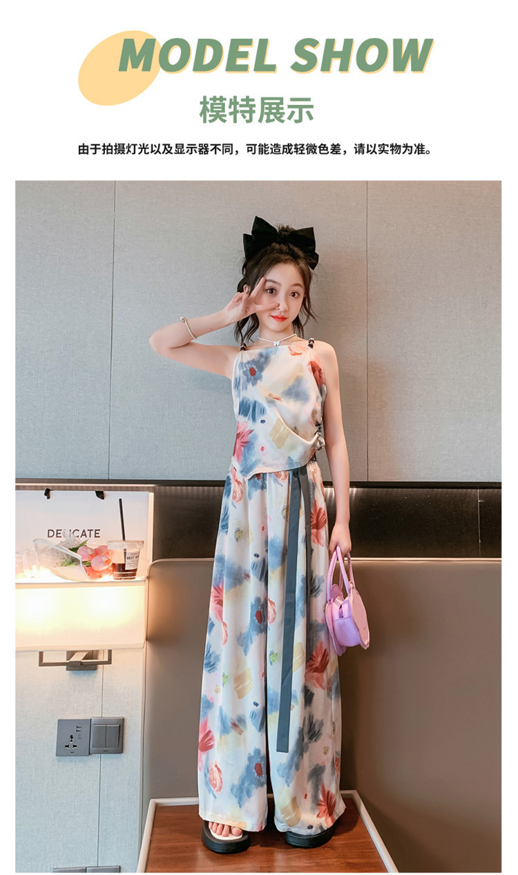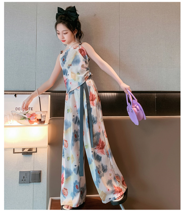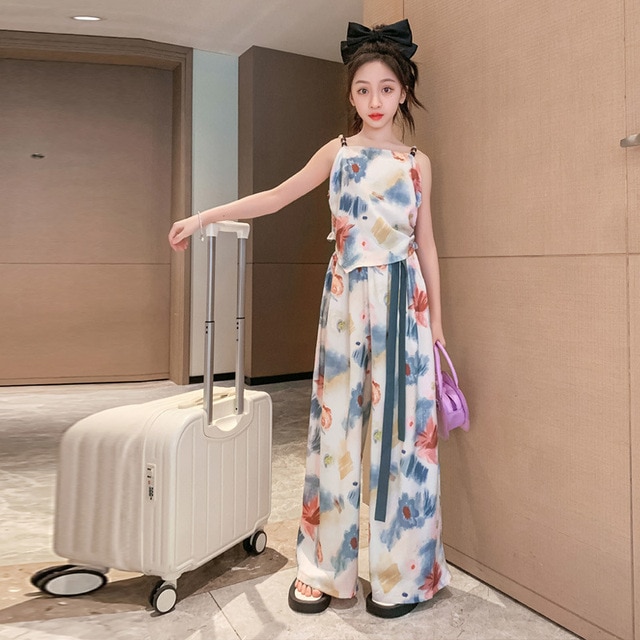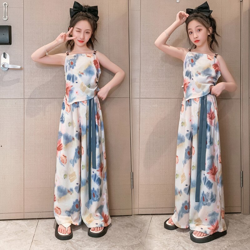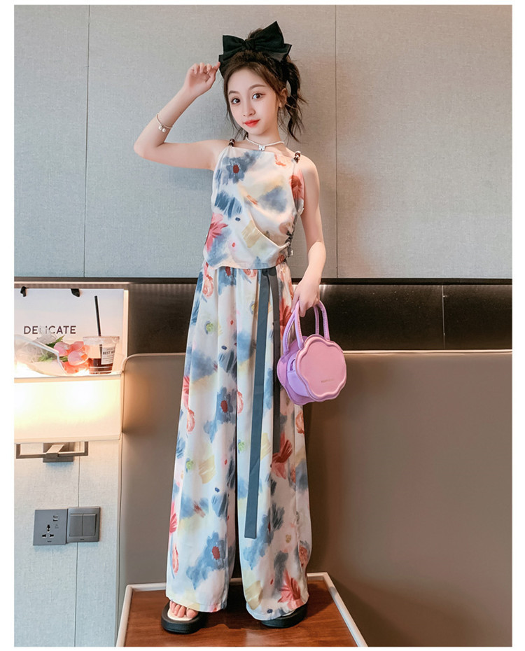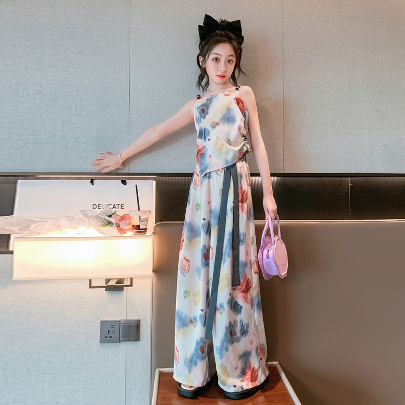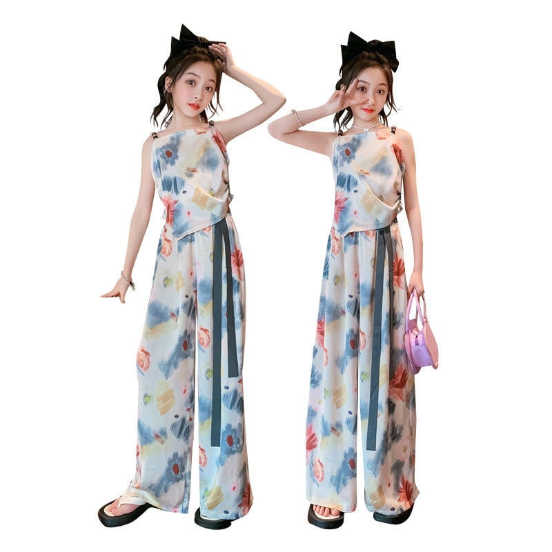 Комплект летней одежды для девочек-подростков, топ с лямкой на шее и свободные длинные штаны, комплект из 2 предметов, детский Шелковый костюм для девочек 6, 8, 10, 12, 13 лет