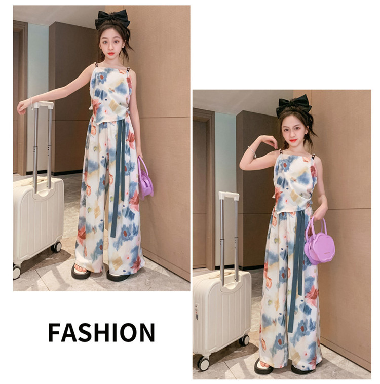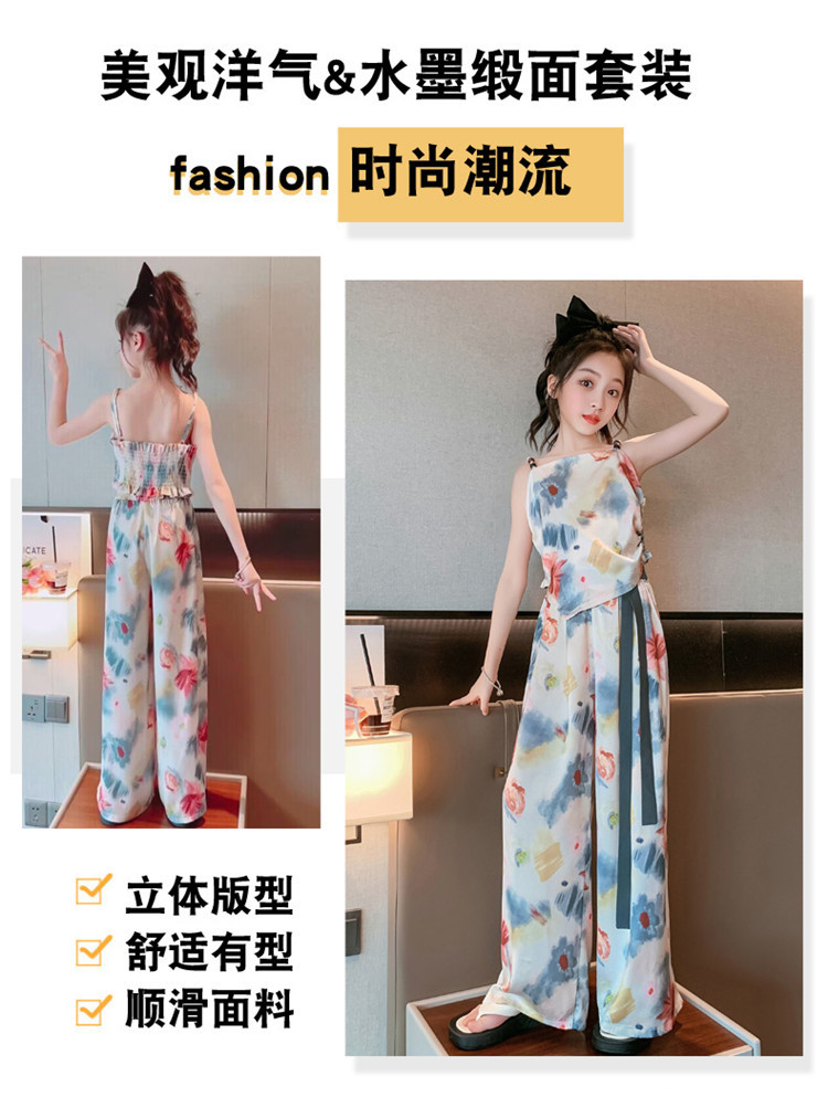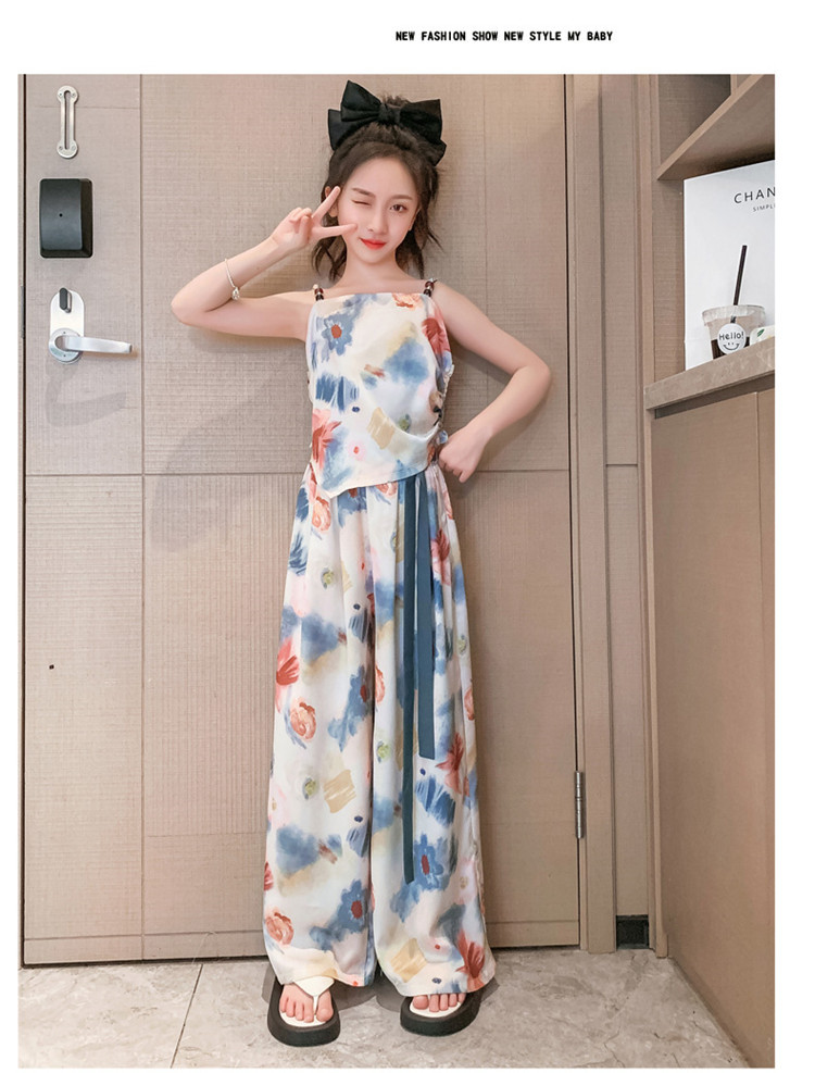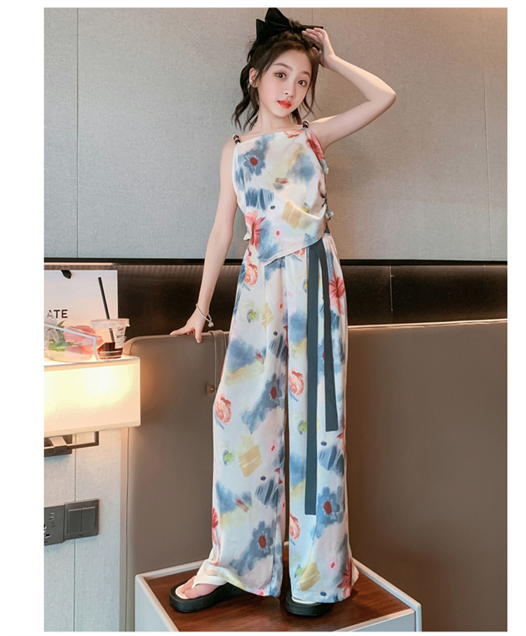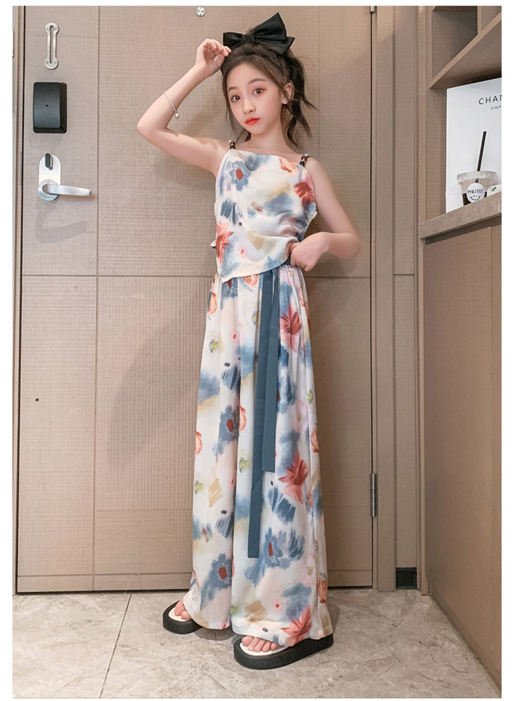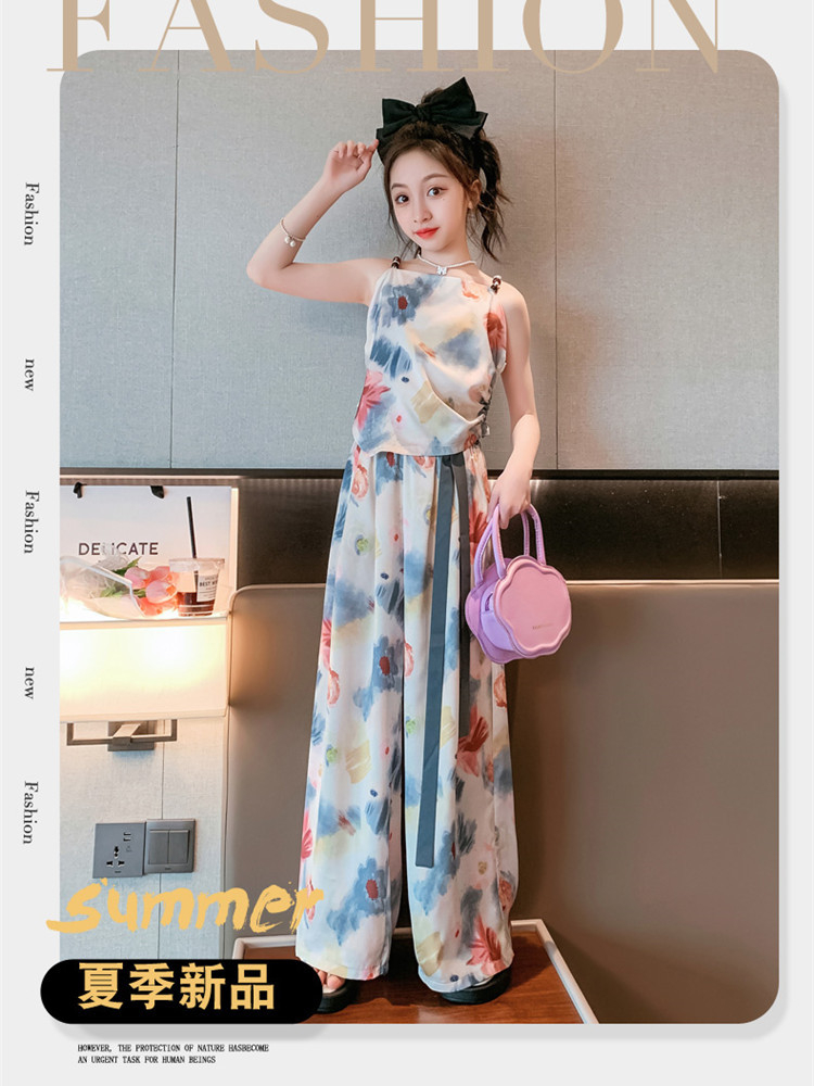 Комплект летней одежды для девочек-подростков, топ с лямкой на шее и свободные длинные штаны, комплект из 2 предметов, детский Шелковый костюм для девочек 6, 8, 10, 12, 13 лет