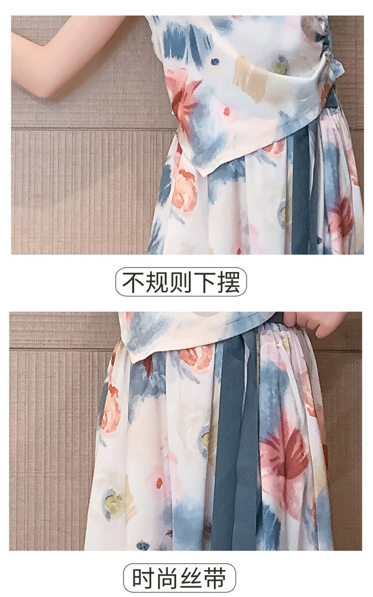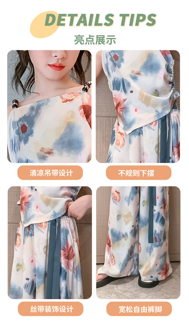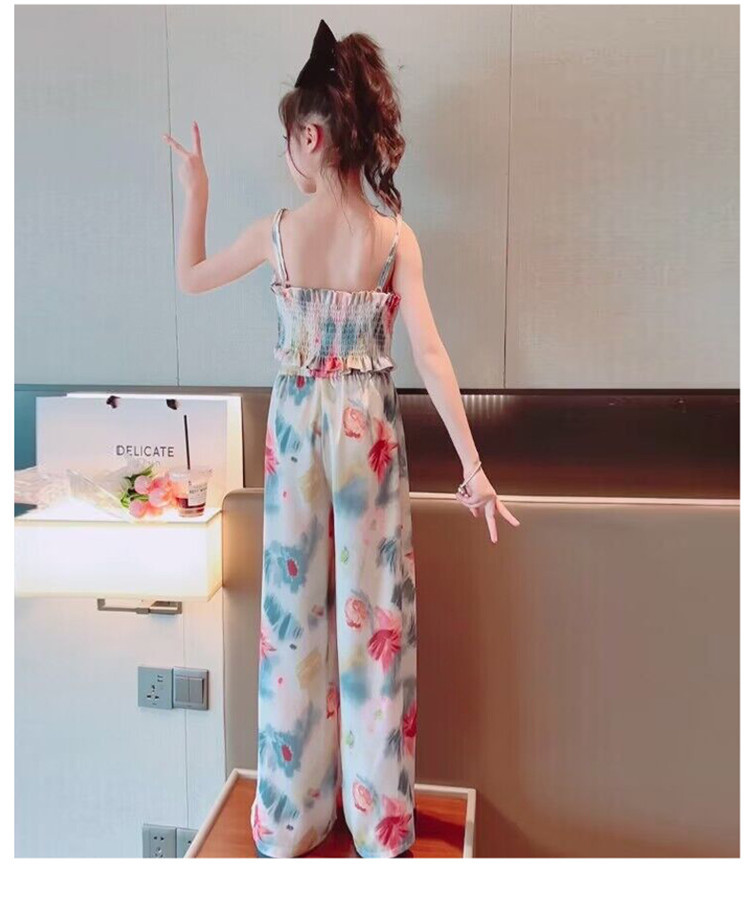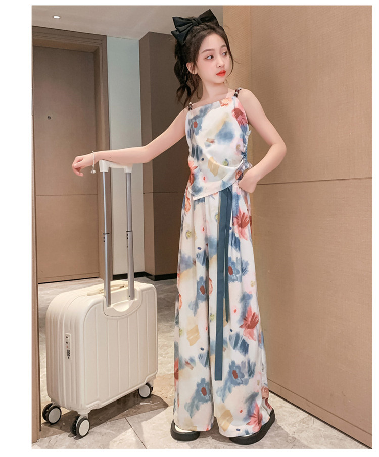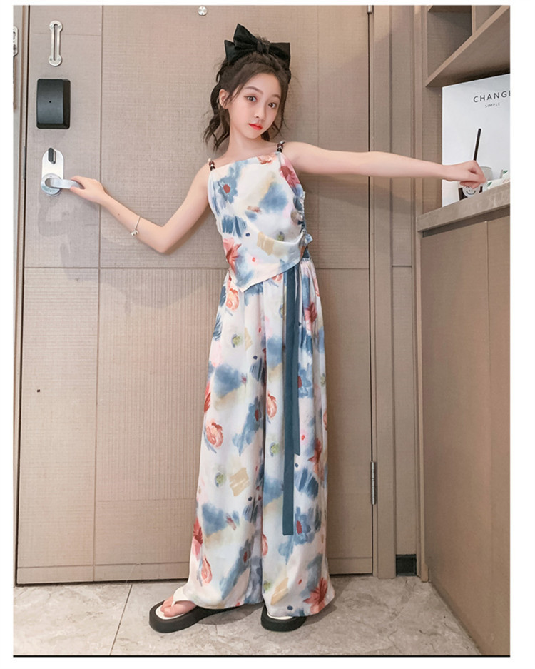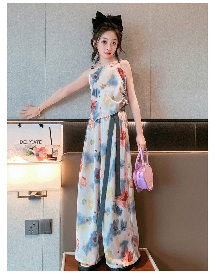 Комплект летней одежды для девочек-подростков, топ с лямкой на шее и свободные длинные штаны, комплект из 2 предметов, детский Шелковый костюм для девочек 6, 8, 10, 12, 13 лет