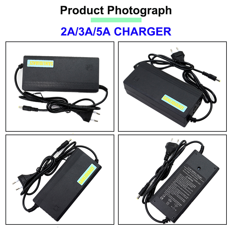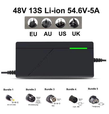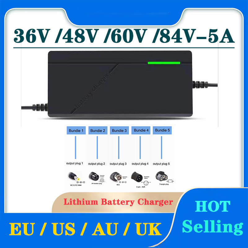 36V 48V 60V 72V 5A charger 10S 13S 16S 20S lithium battery 42V 54.6V 67.2V 84V 5A intelligent fast charging DC/Aviation/RCA/XLR/Triangular output plug EU/US/AU/UK input plug 100~240V AC, 50/60Hz