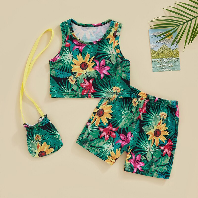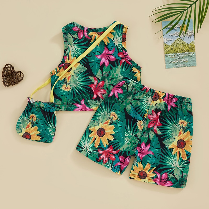 Комплект одежды для девочек 2-7 лет, повседневный уличный жилет без рукавов с цветочным рисунком, топ + шорты + сумка через плечо, наряды для детей