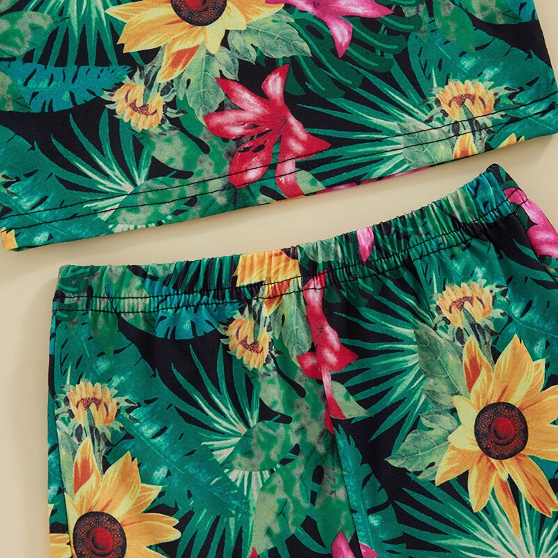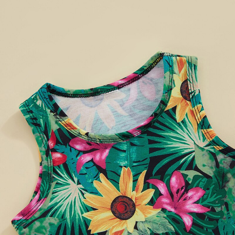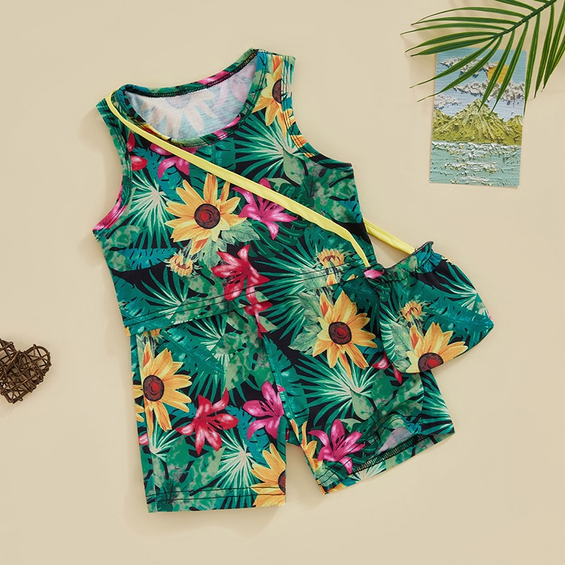 Описание: Детский брючный костюм для девочек, повседневный уличный жилет без рукавов с круглым вырезом и цветочным принтом, Топы + короткие штаны + сумка через плечо
