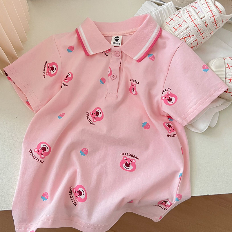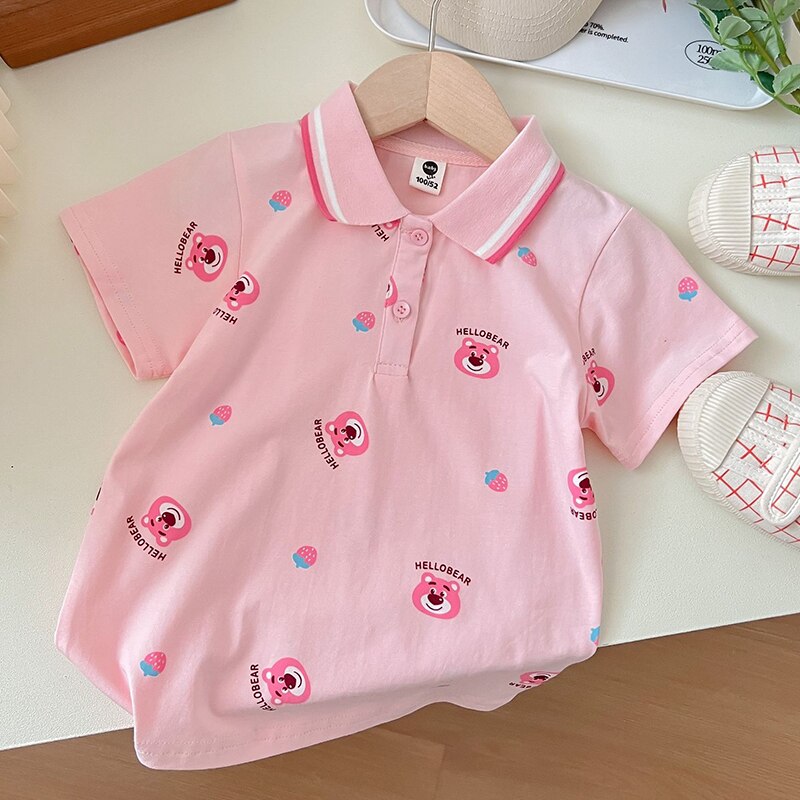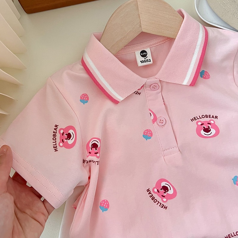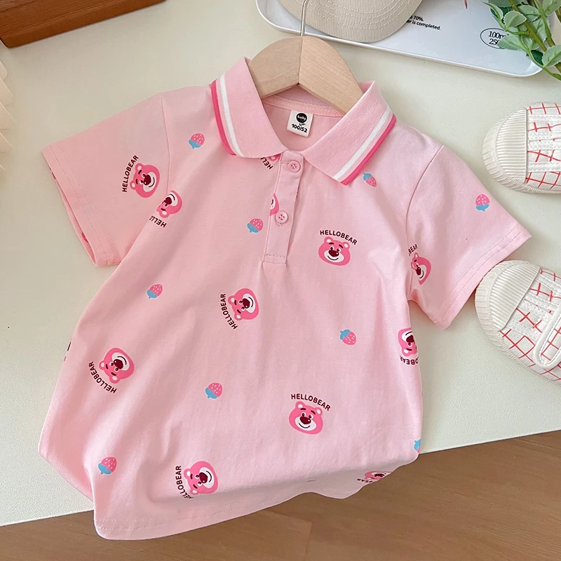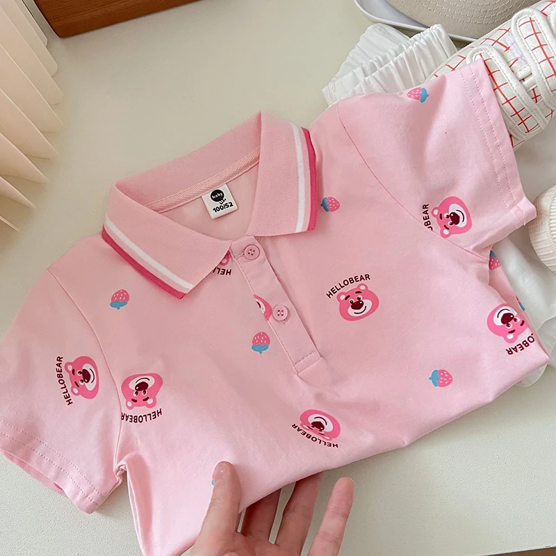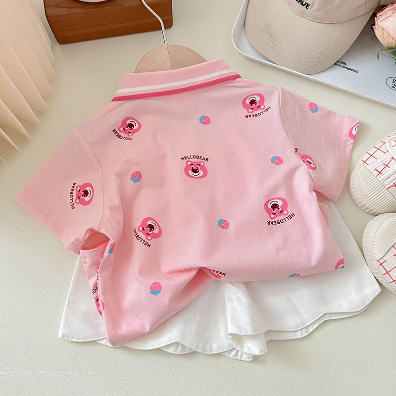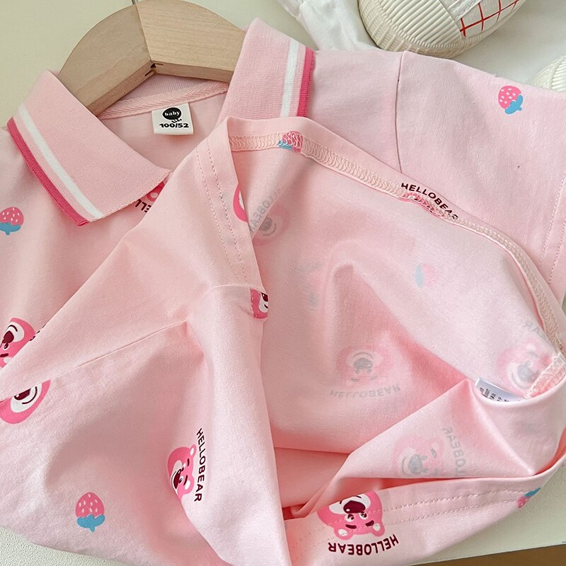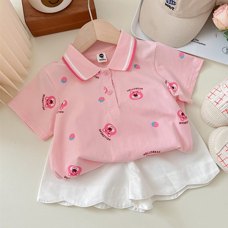 Комплект одежды для девочек с мультипликационным рисунком, летние футболки с клубничным медведем и белыми шортами, костюм из двух предметов, детская одежда в Корейском стиле