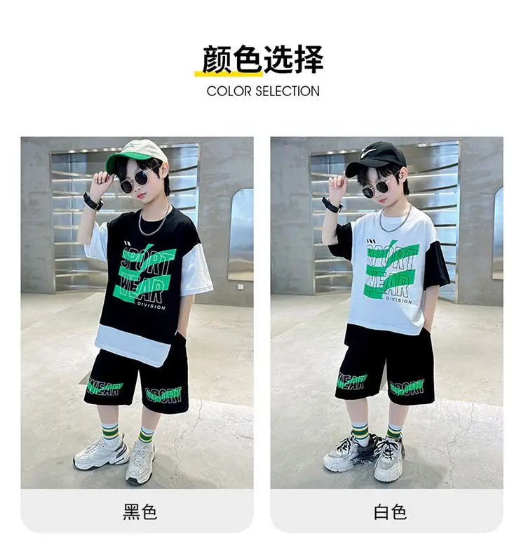 Комплект одежды для мальчиков с коротким рукавом, Новинка лета 2023, модная Лоскутная футболка с круглым вырезом и брюки-карго, комплект из 2 предметов, одежда для подростков