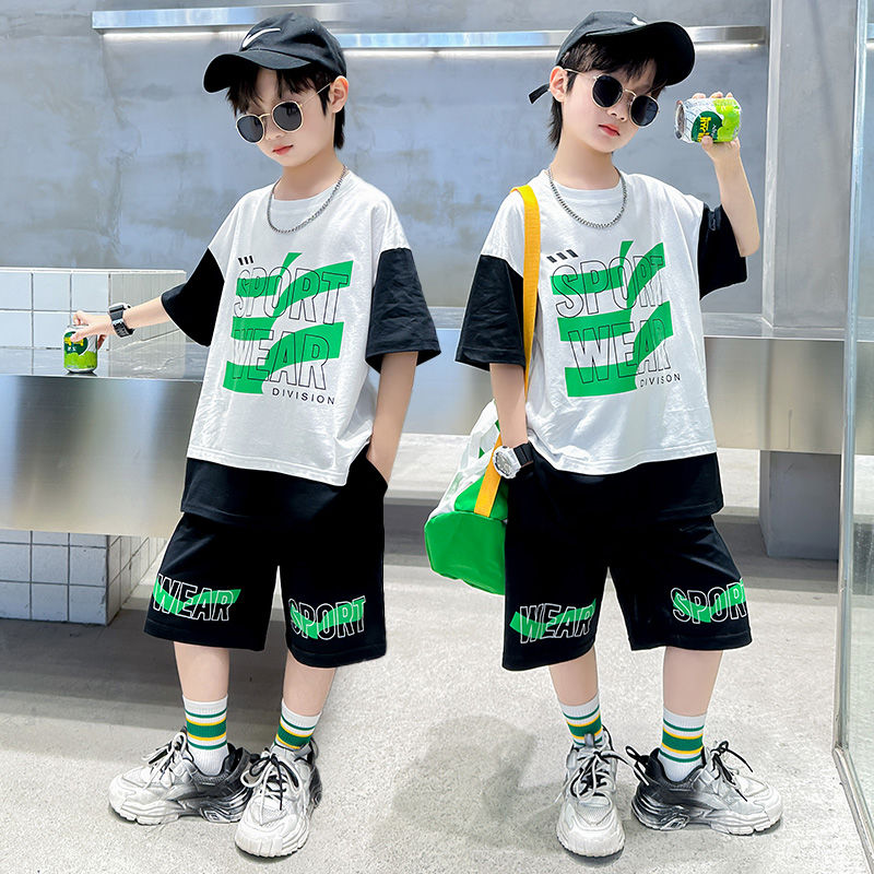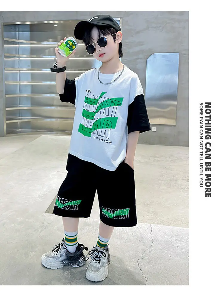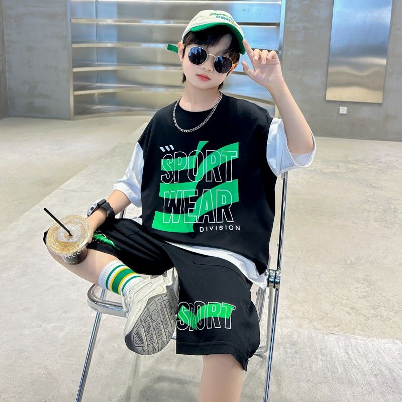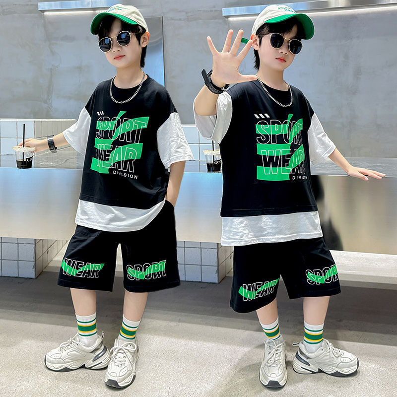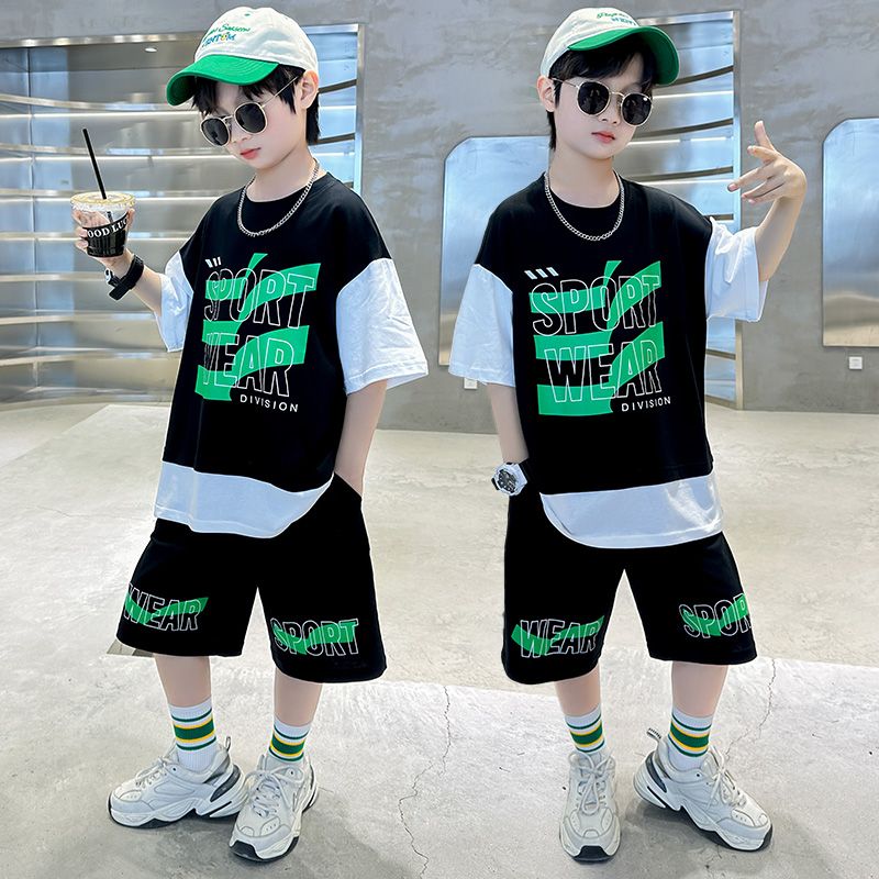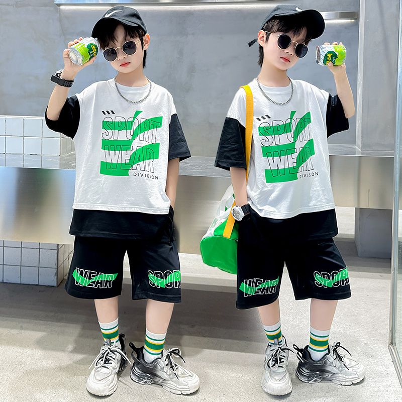 Комплект одежды для мальчиков с короткими рукавами, 2023 летняя новая модная Лоскутная футболка с круглым вырезом и брюки-карго, 2 предмета, одежда для подростков