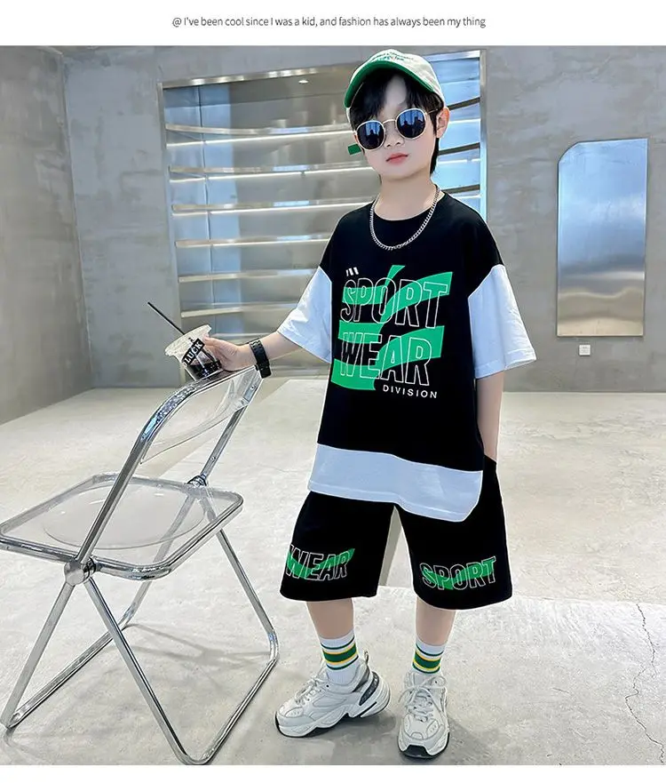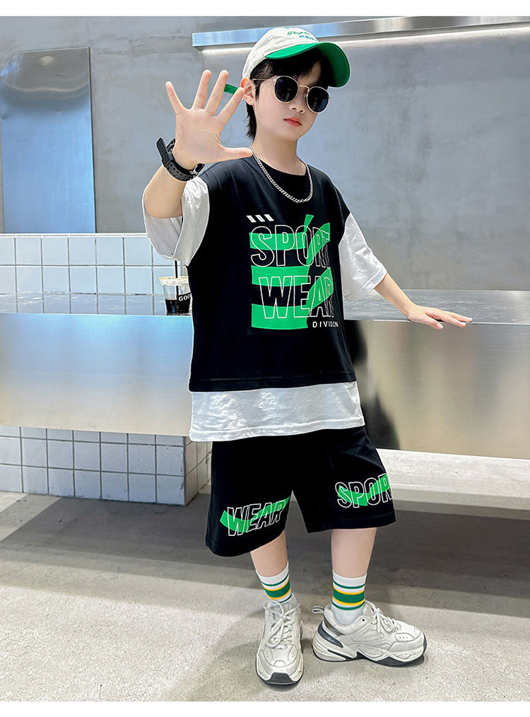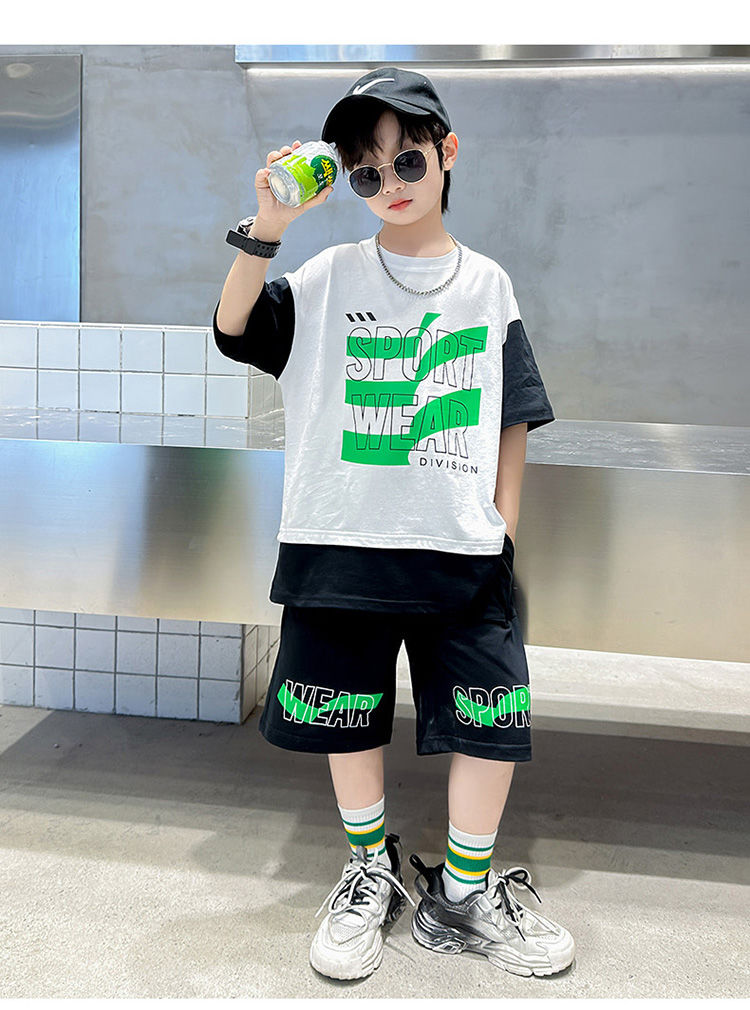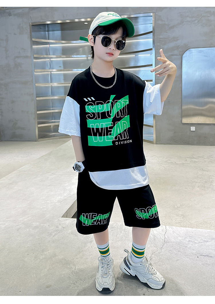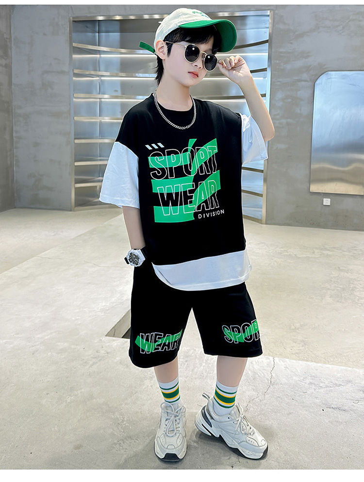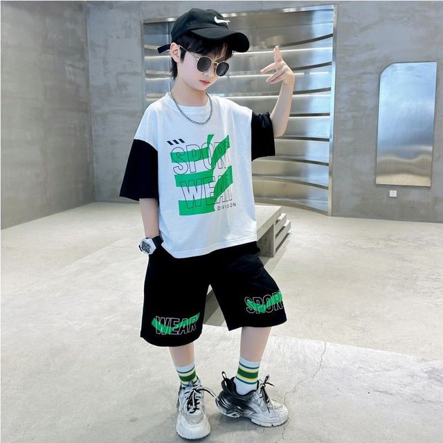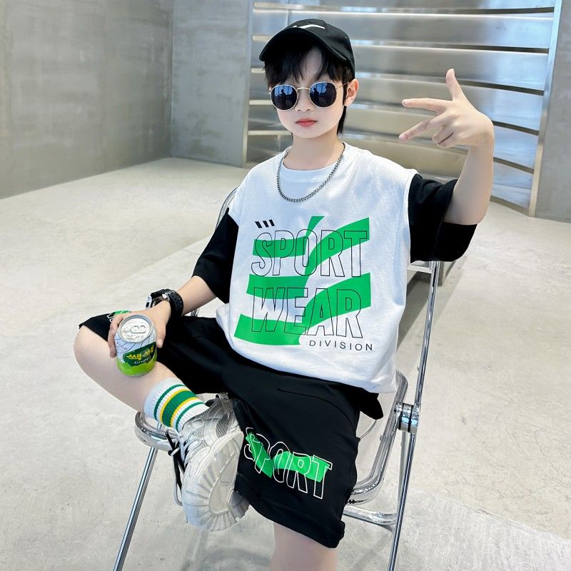 Комплект одежды для мальчиков с короткими рукавами, 2023 летняя новая модная Лоскутная футболка с круглым вырезом и брюки-карго, 2 предмета, одежда для подростков