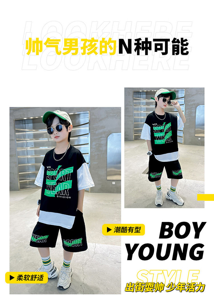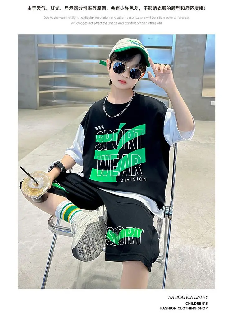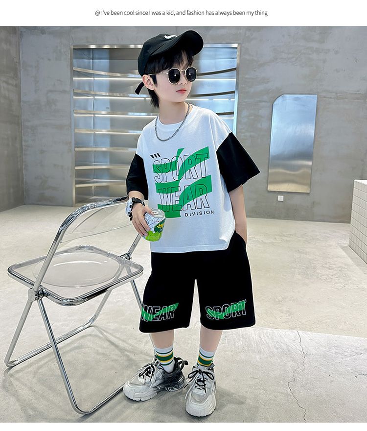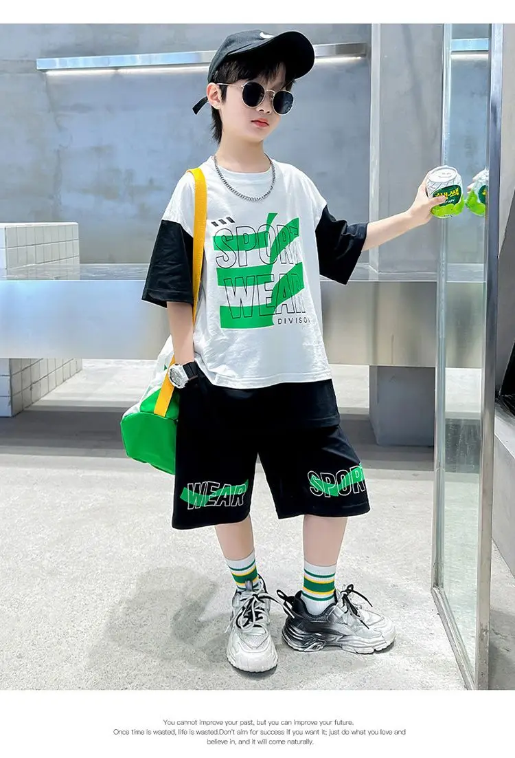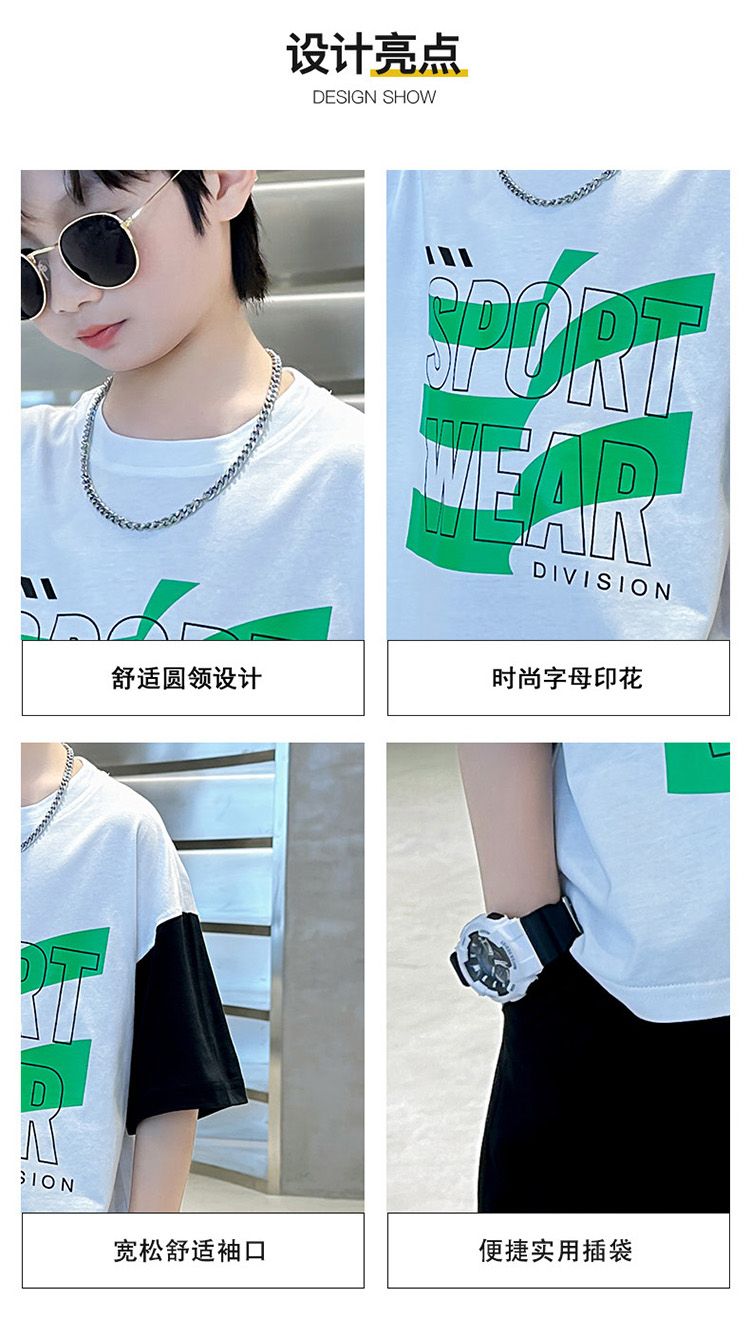 Комплект одежды для мальчиков с короткими рукавами, 2023 летняя новая модная Лоскутная футболка с круглым вырезом и брюки-карго, 2 предмета, одежда для подростков