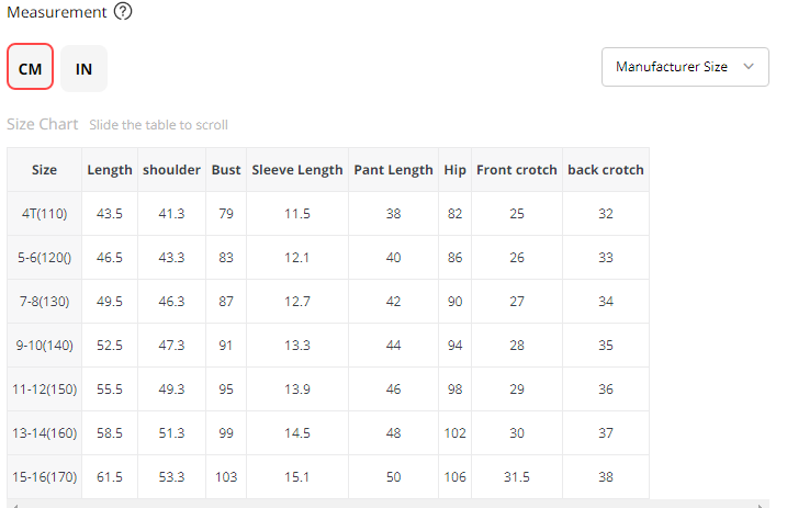 size 110 120 130 140 150 160 170