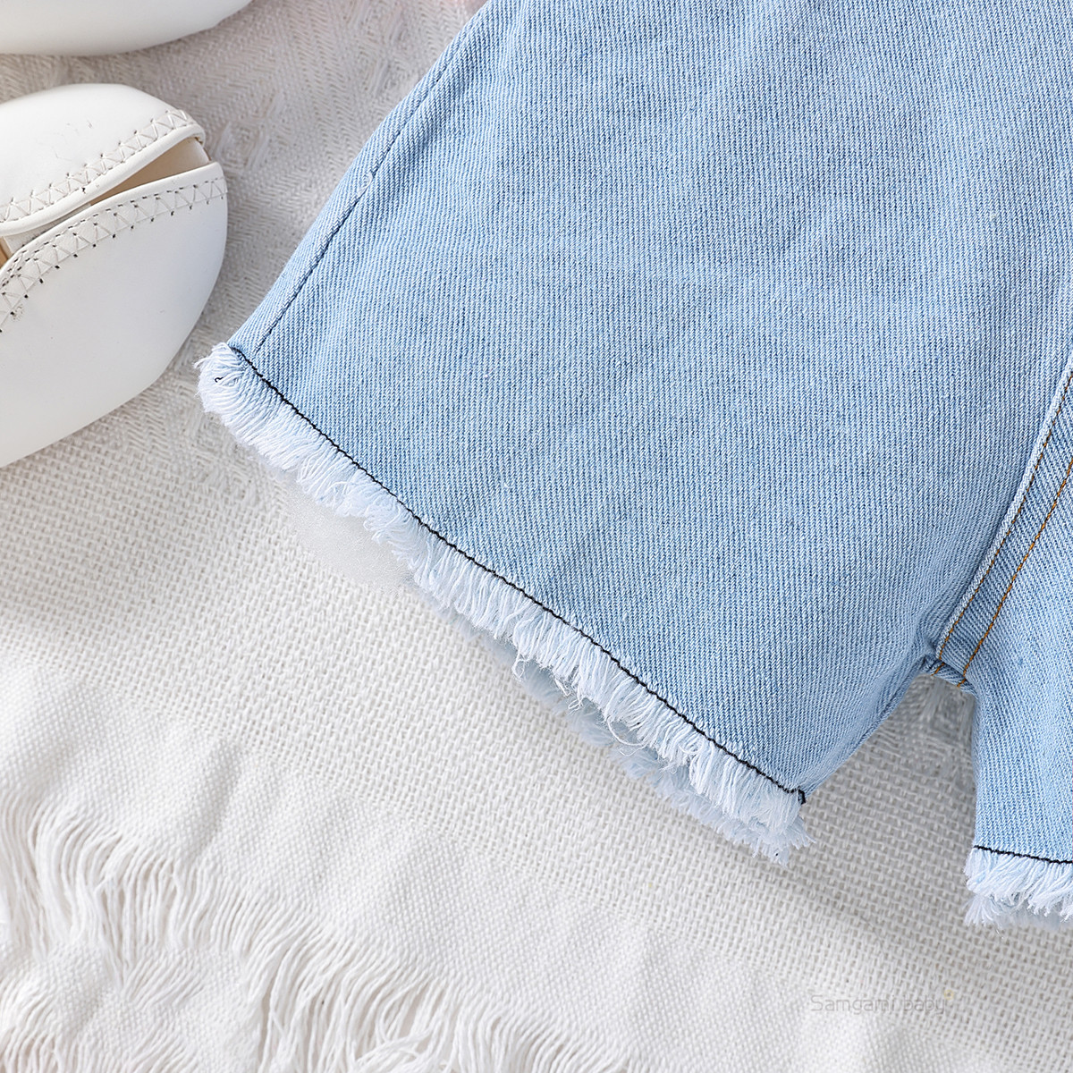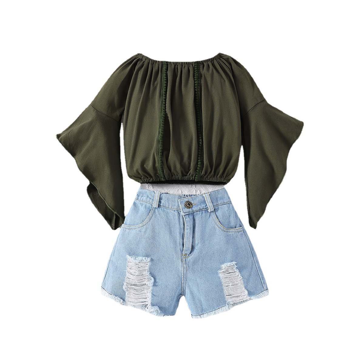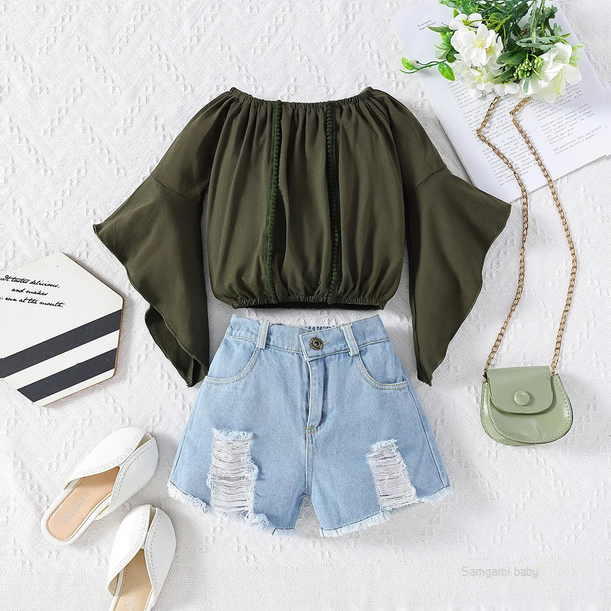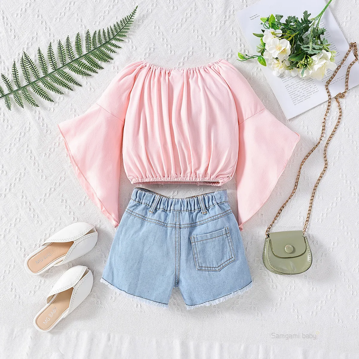Комплект одежды для маленьких девочек из 2 предметов, модный однотонный топ + джинсовые шорты с дырками, эксклюзивная детская одежда, одежда BC2410, на лето