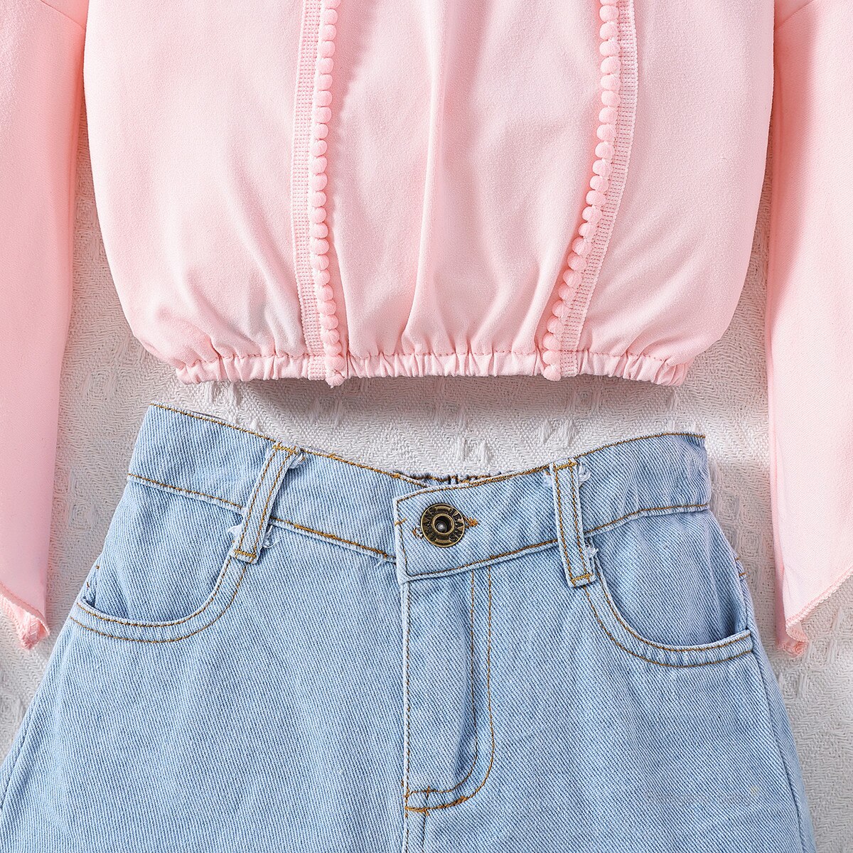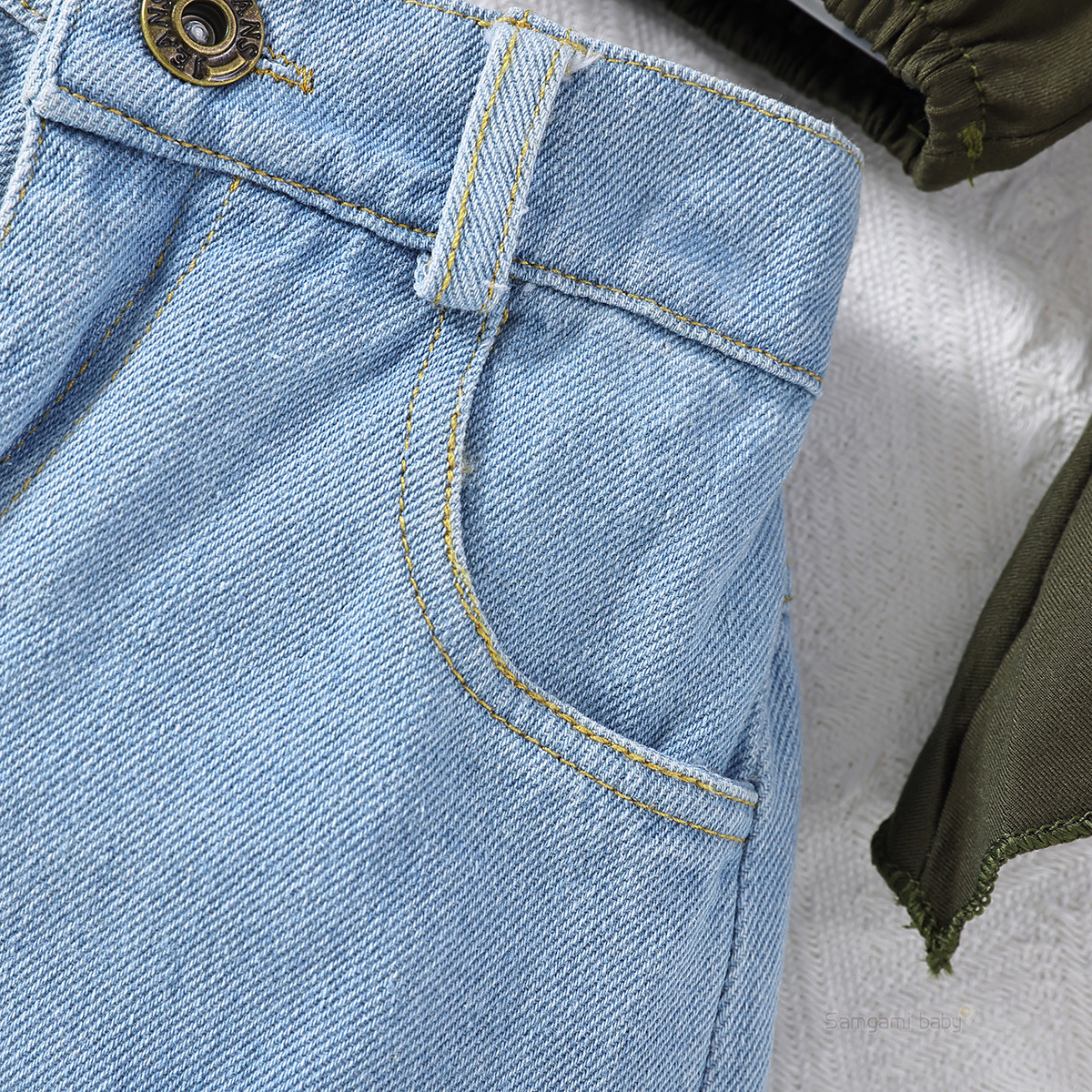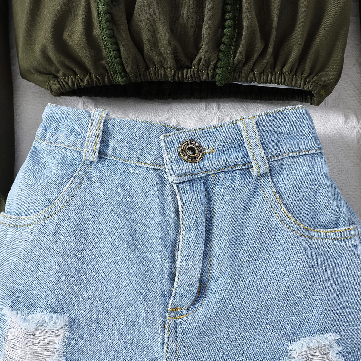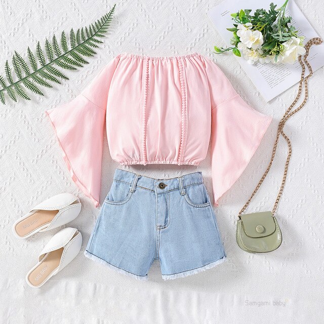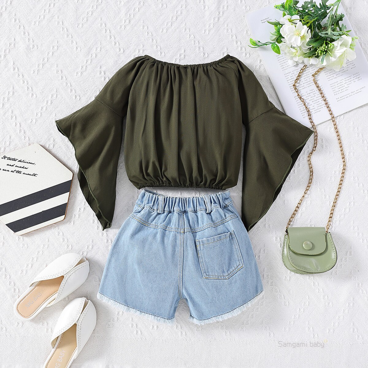 Комплект одежды для маленьких девочек из 2 предметов, модный однотонный топ + джинсовые шорты с дырками, эксклюзивная детская одежда, одежда BC2410, на лето