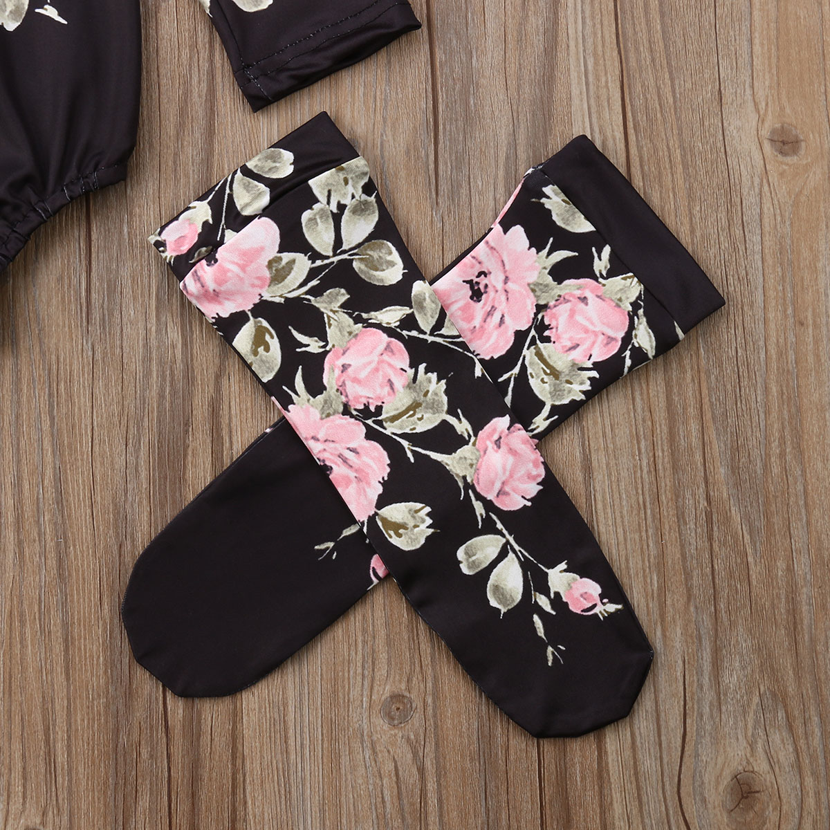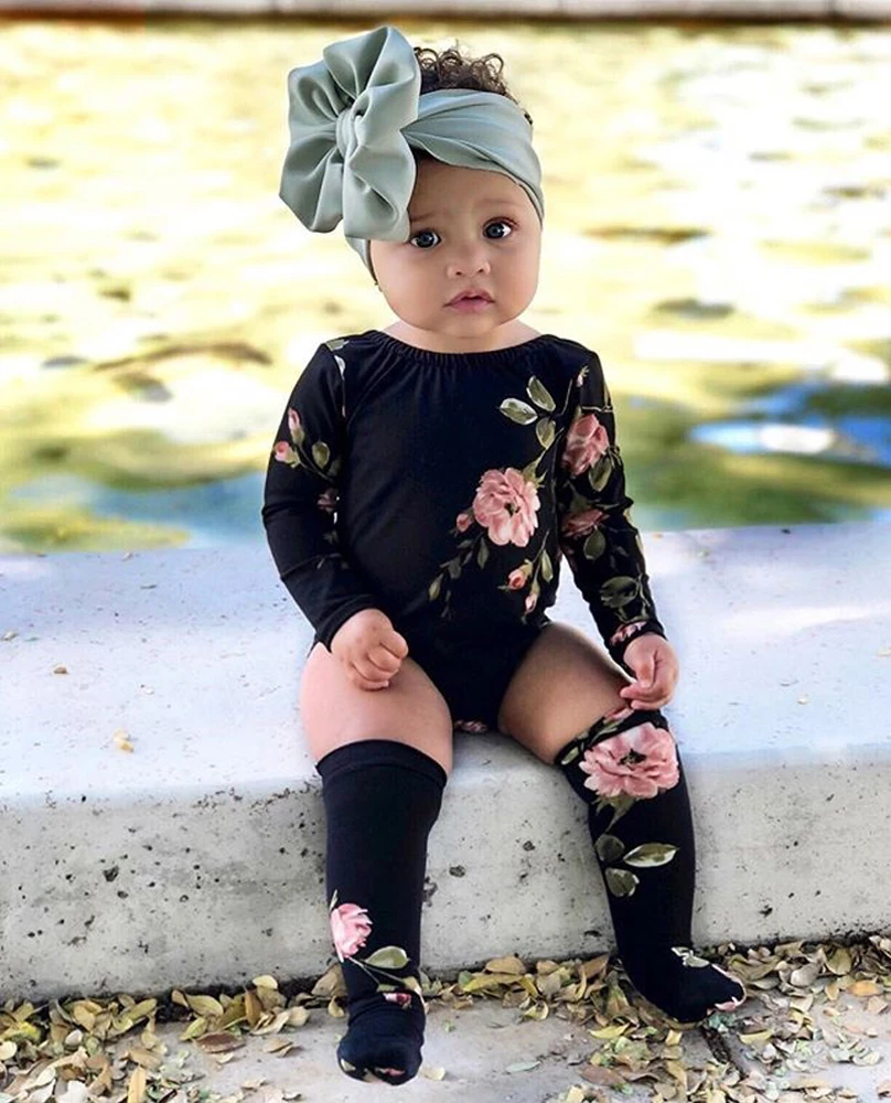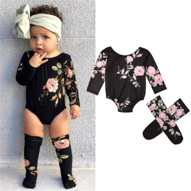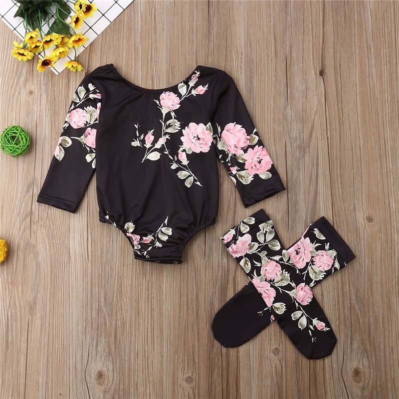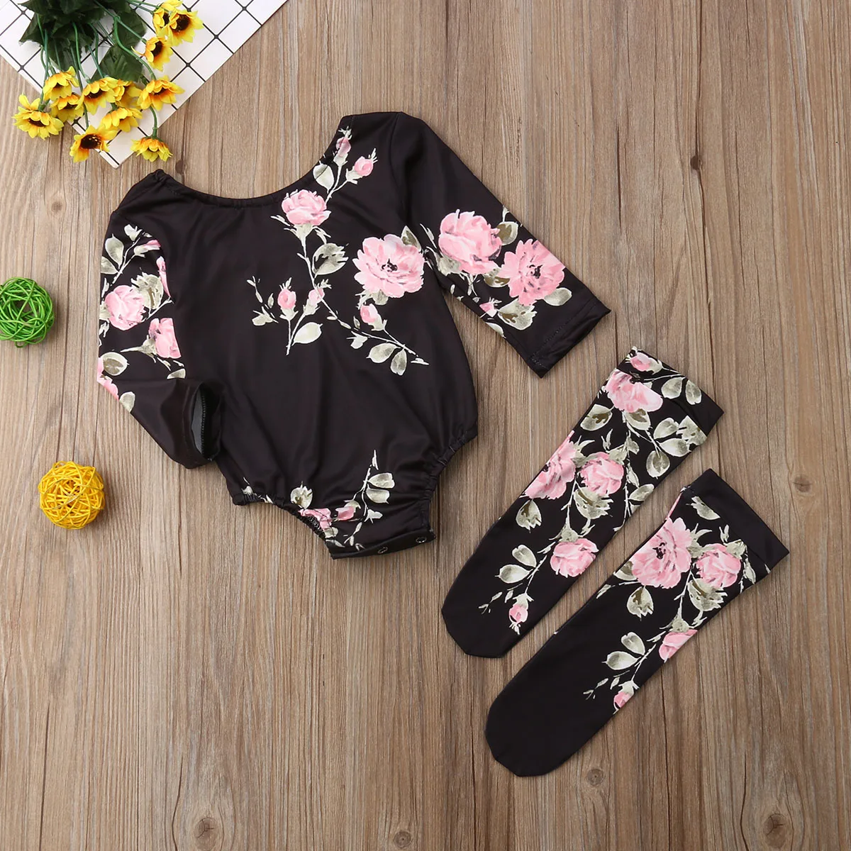 Комплект одежды для маленьких девочек от 0 до 18 месяцев, детские комбинезоны с длинным рукавом, черные боди для девочек с цветочным принтом, детские носки, комплект для новорожденных детей