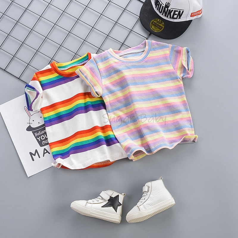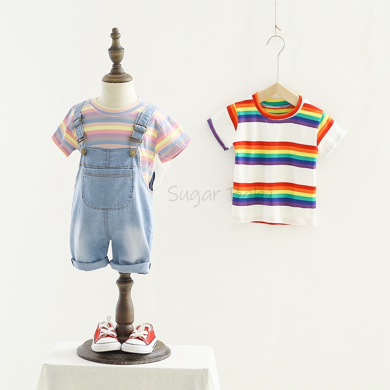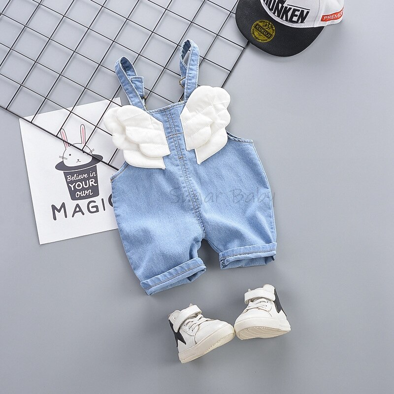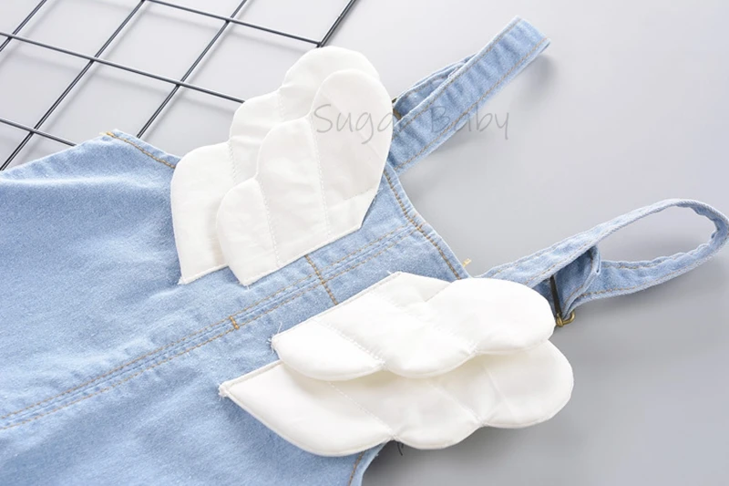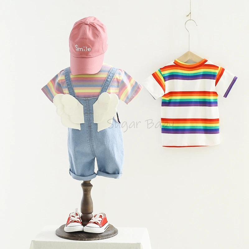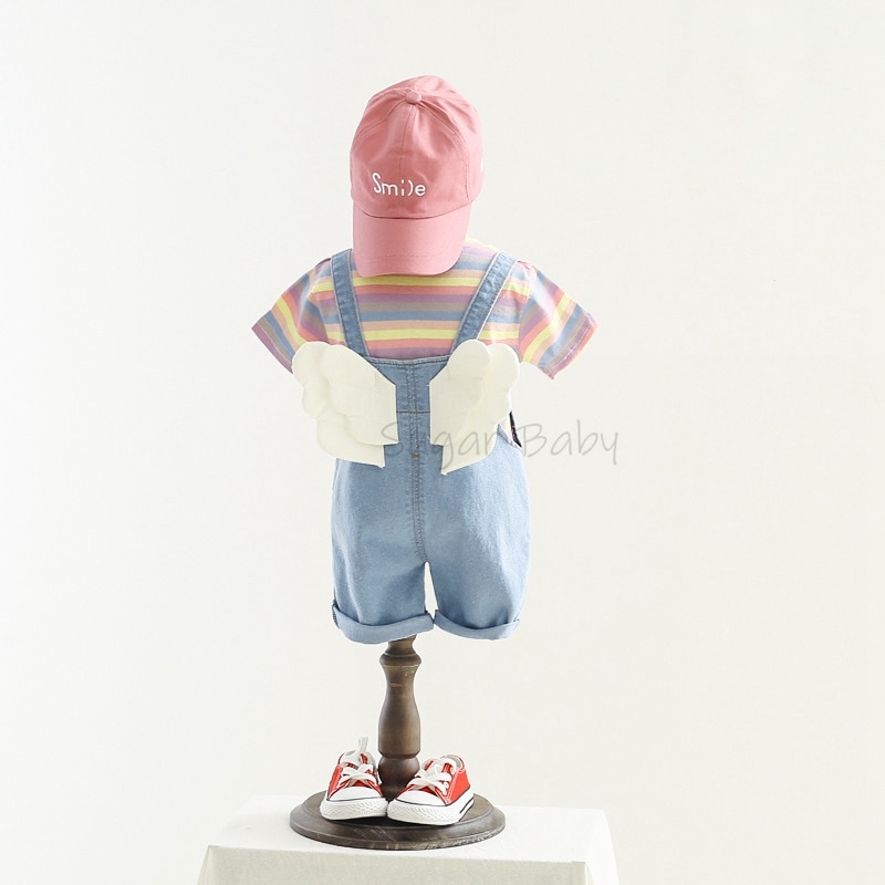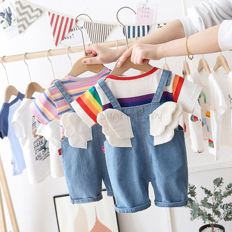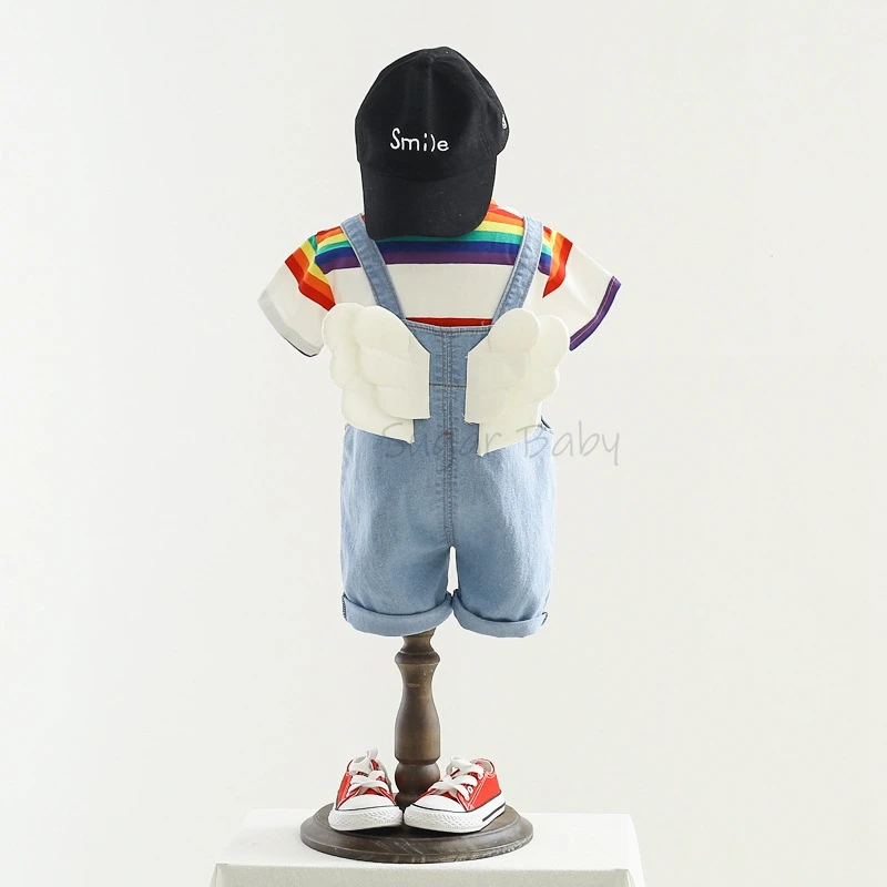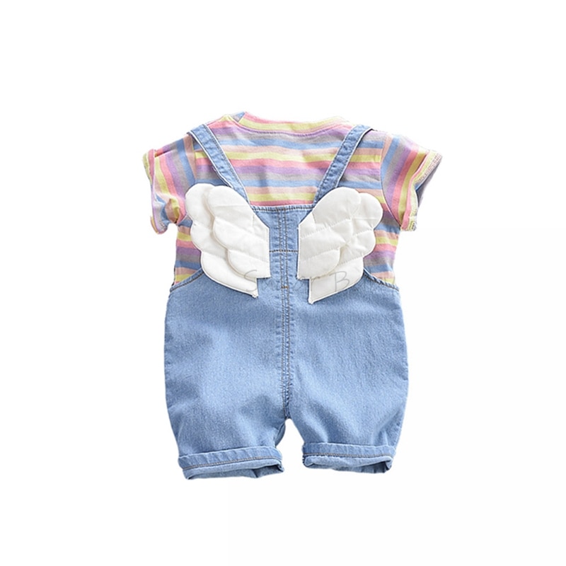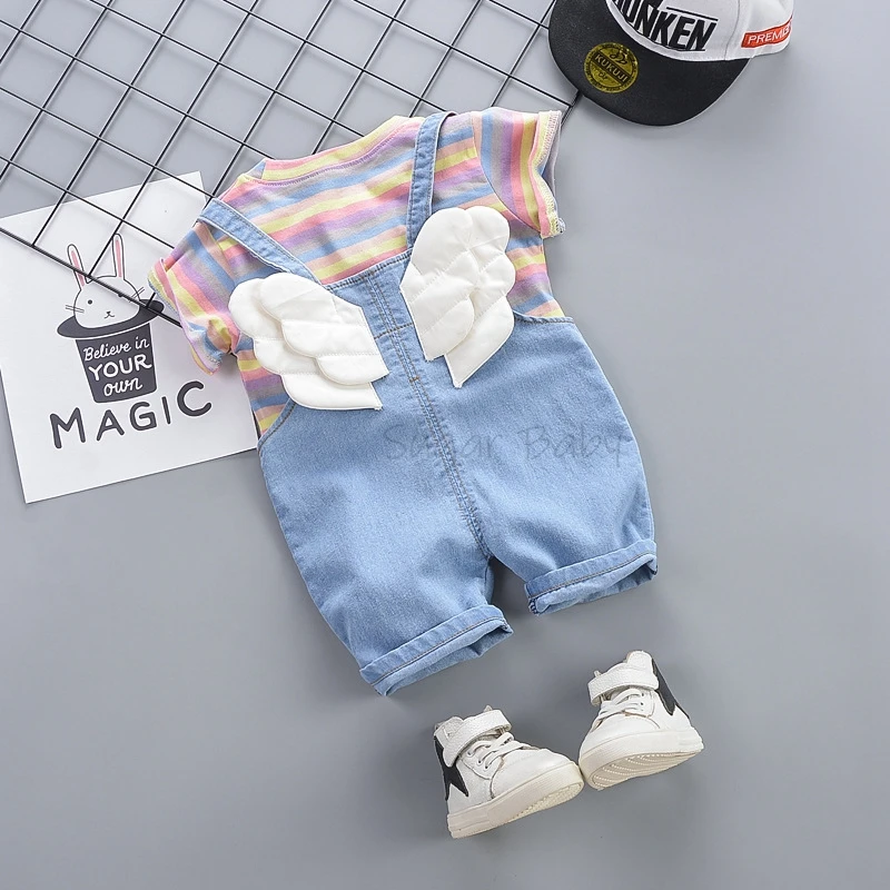 Комплект одежды для маленьких мальчиков, летняя футболка с круглым вырезом в полоску и джинсовый комбинезон, повседневный костюм с крыльями для детей 1-3 лет
