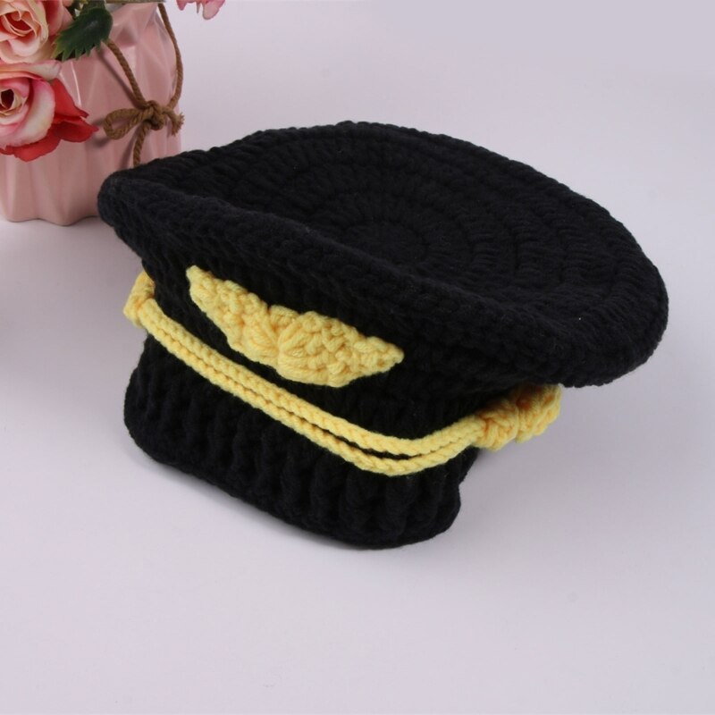 Костюм для фотосъемки новорожденных в стиле офицера включает вязаную шапку и подгузник яркого черного и ярко-желтого цветов.