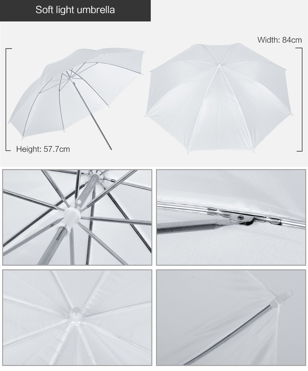 Полупрозрачный белый зонт может уменьшать тени, смягчать сильный свет, создавая равномерный и мягкий свет.