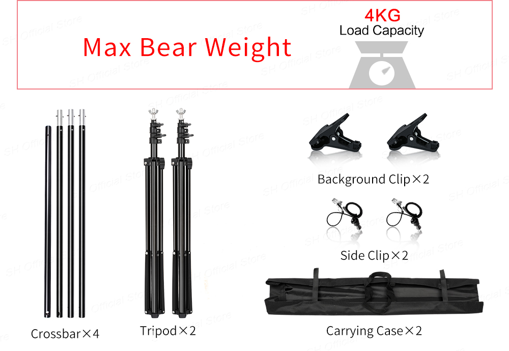 4xClamps:2x боковой зажим, отрегулируйте фоновую ткань до наилучшего положения. 2x прочный зажим, фиксированные элементы предотвращают его выскальзывание.
