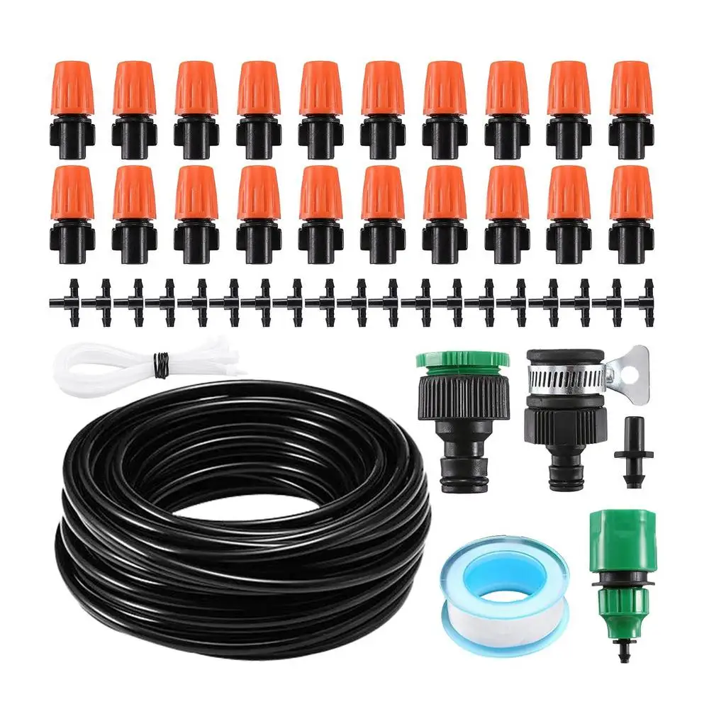 1pc * faucet joint + 1pc * universal joint + 1pc * sharp mouth quick connector + 1pc * raw material belt + 1pc * 15 meters of 4/7 capillary tube + 20pcs * orange atomizing nozzles + 19pcs * 4/7 flat tees, 1pc * single hook + 15pcs * cable ties