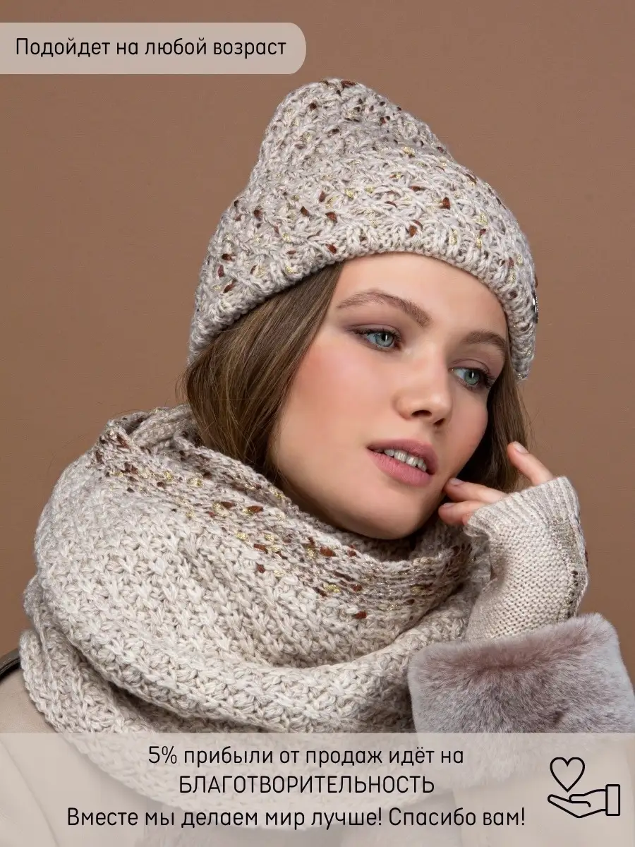 Описание: Вязаный зимний женский комплект шапка, снуд и перчатки от производителя MEVIAR. Изготовлен из высококачественной пряжи ""AVONDE"" на основе гипоаллергенного акрила, что делает комплект тактильно приятным. Объемная шапка имеет большой помпон и флисовый подклад для дополнительного тепла. Универсальный снуд шарф используется также как и накидка на голову. Крупная вязка. Размер универсальный, поэтому подойдут большинству женщин, девушек, подростков. MEVIAR - российский бренд, производитель головных уборов и одежды. Покупая товары бренда вы делаете мир лучше, 5 % от прибыли идет на благотворительность. Подробное описание: Вязанная для женщин. Модный Головной убор на сезон осень зима весна. Зимняя, демисезонная, вязанная, подростковая. Набор с отворотом. Идет как и подростковая так и женская. Со снудом ( шарфом ) и помпоном ( бубоном ). Перчатки с отверстиями для пальцев ( митенки или варежки ).