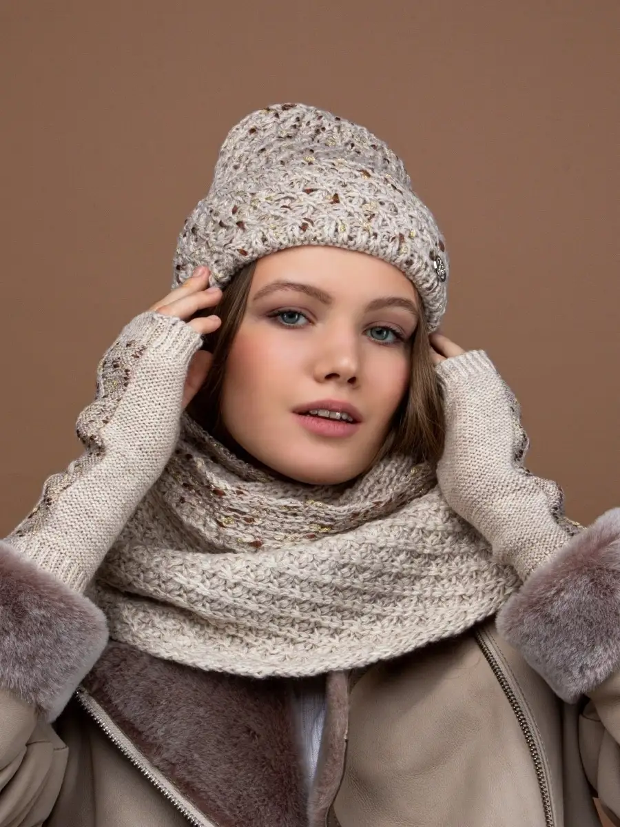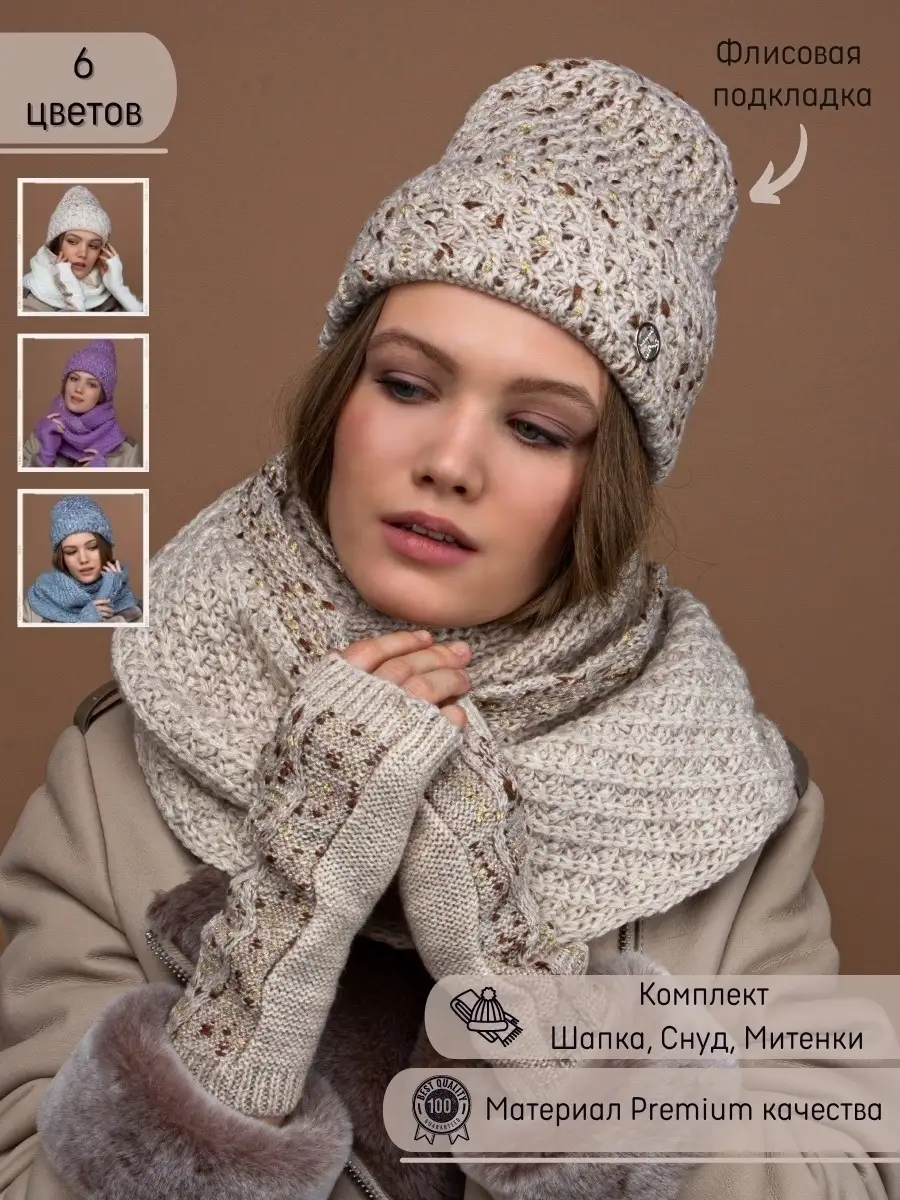 Комплект шапка женская зимняя и снуд шарф, митенки перчатки