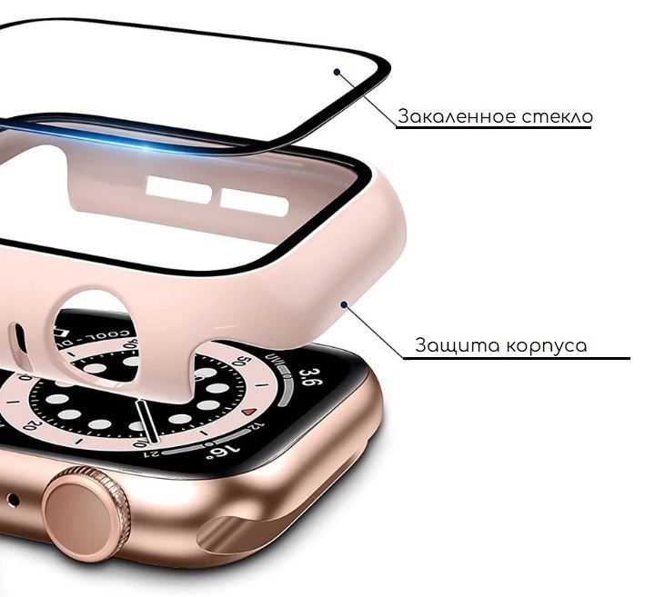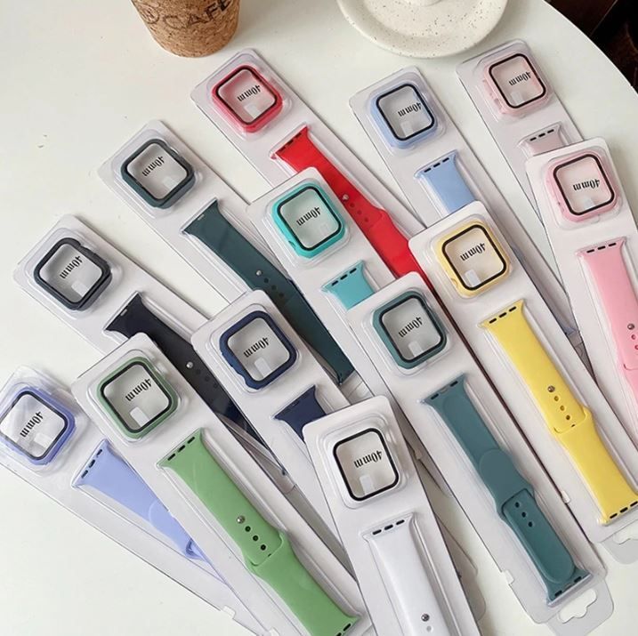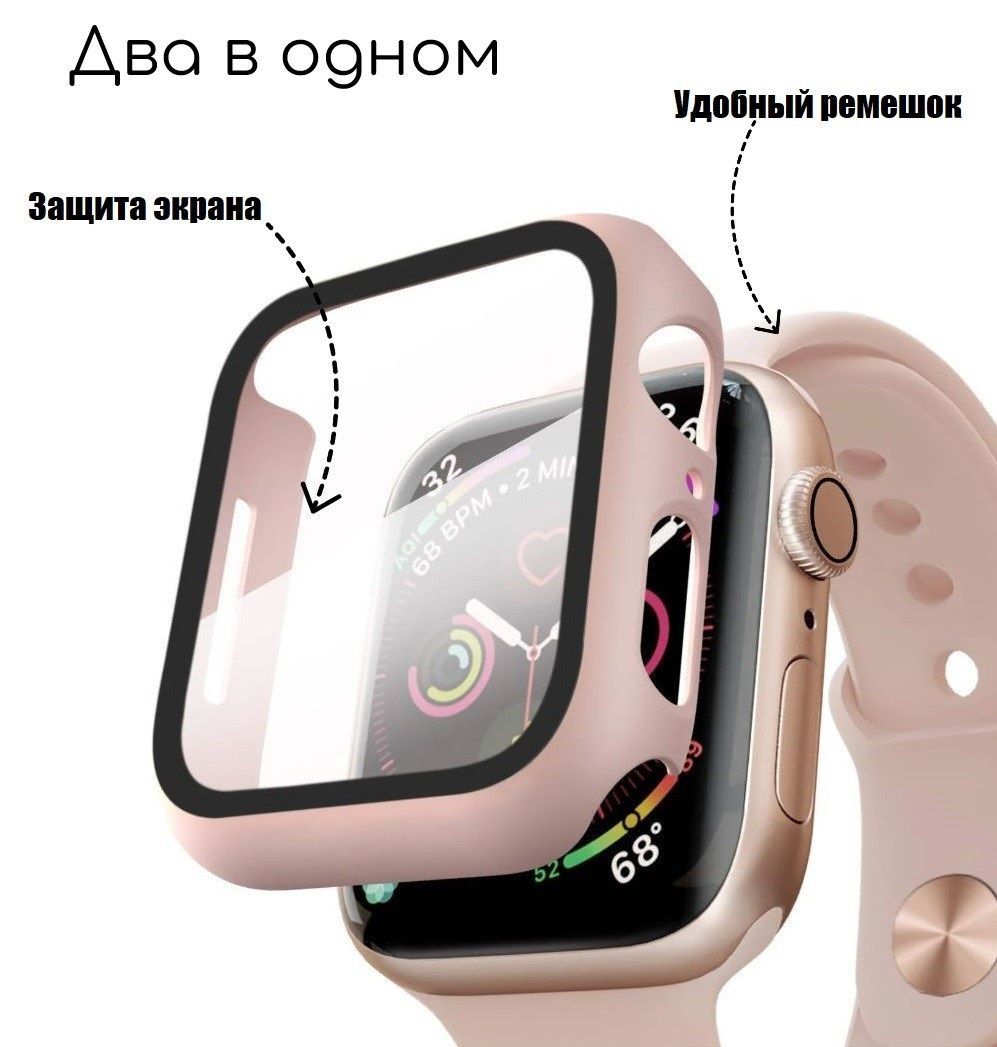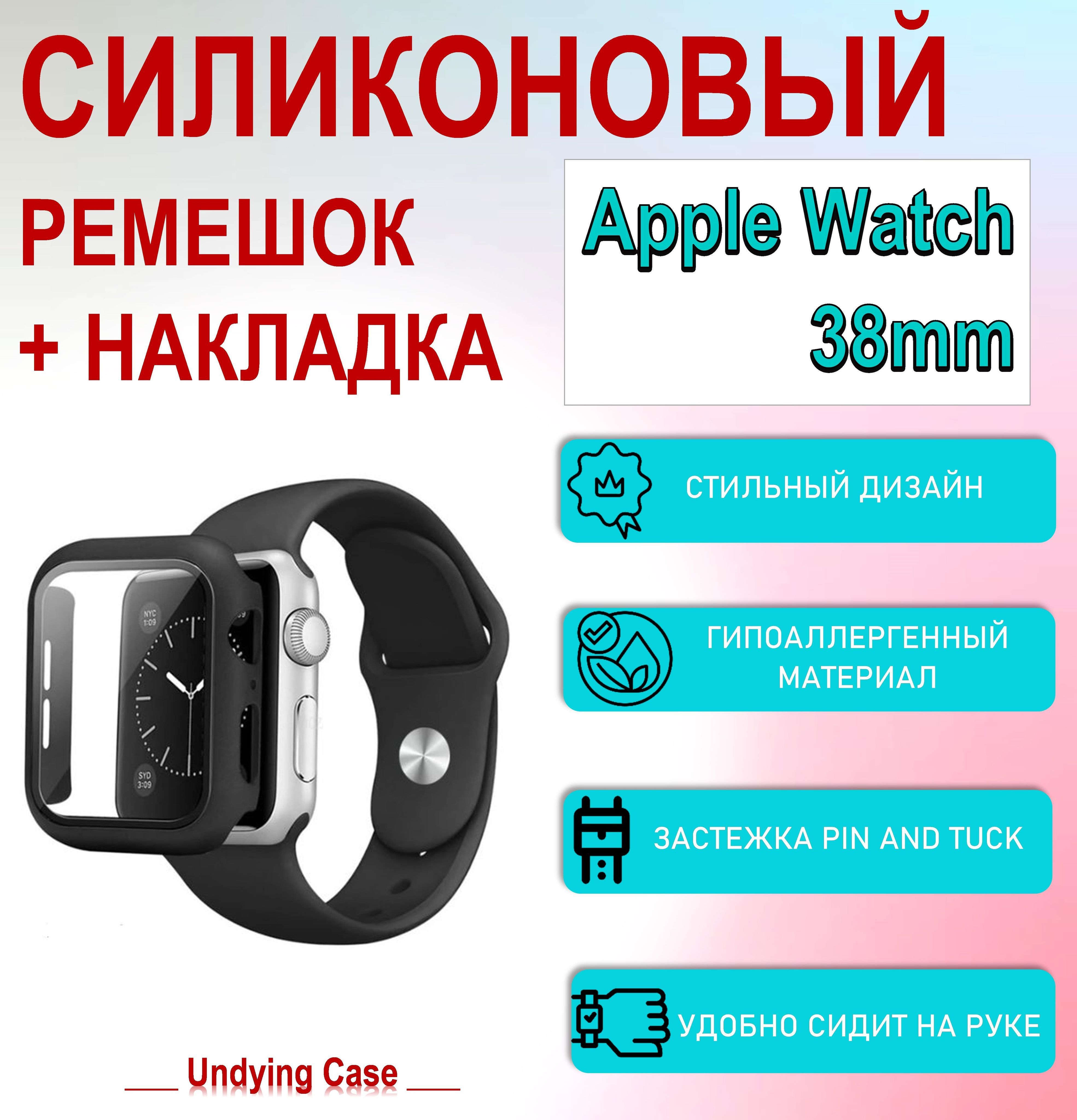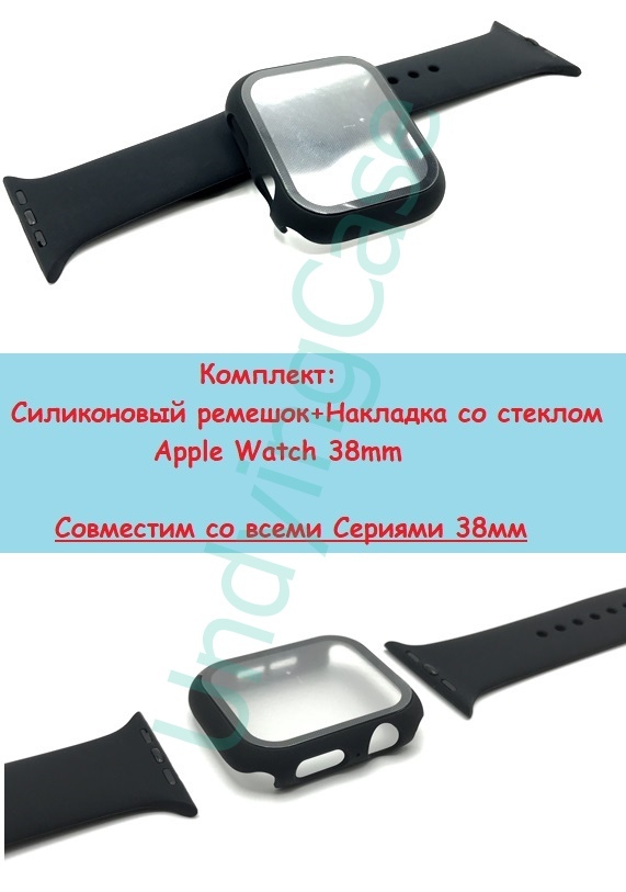 Комплект: Силиконовый ремешок и пластиковая накладка со стеклом для Apple Watch 38mm Черный-1шт