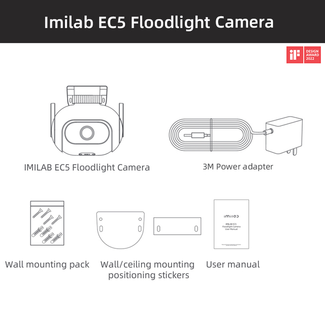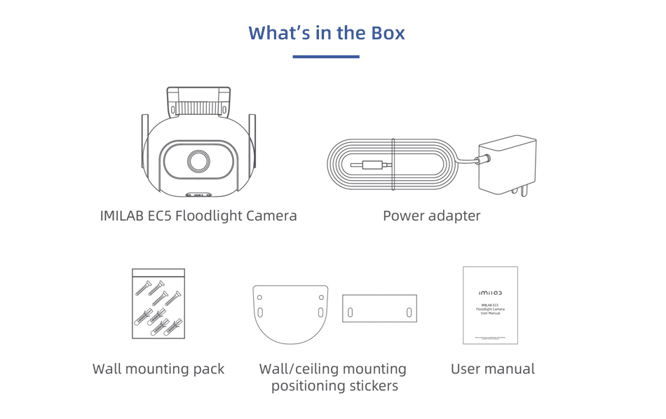 • Посылка содержимое: Прожекторная камера IMILAB EC5 * 1, комплект для настенного монтажа, адаптер питания * 1, руководство пользователя * 1, наклейки для позиционирования;