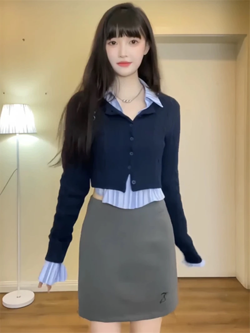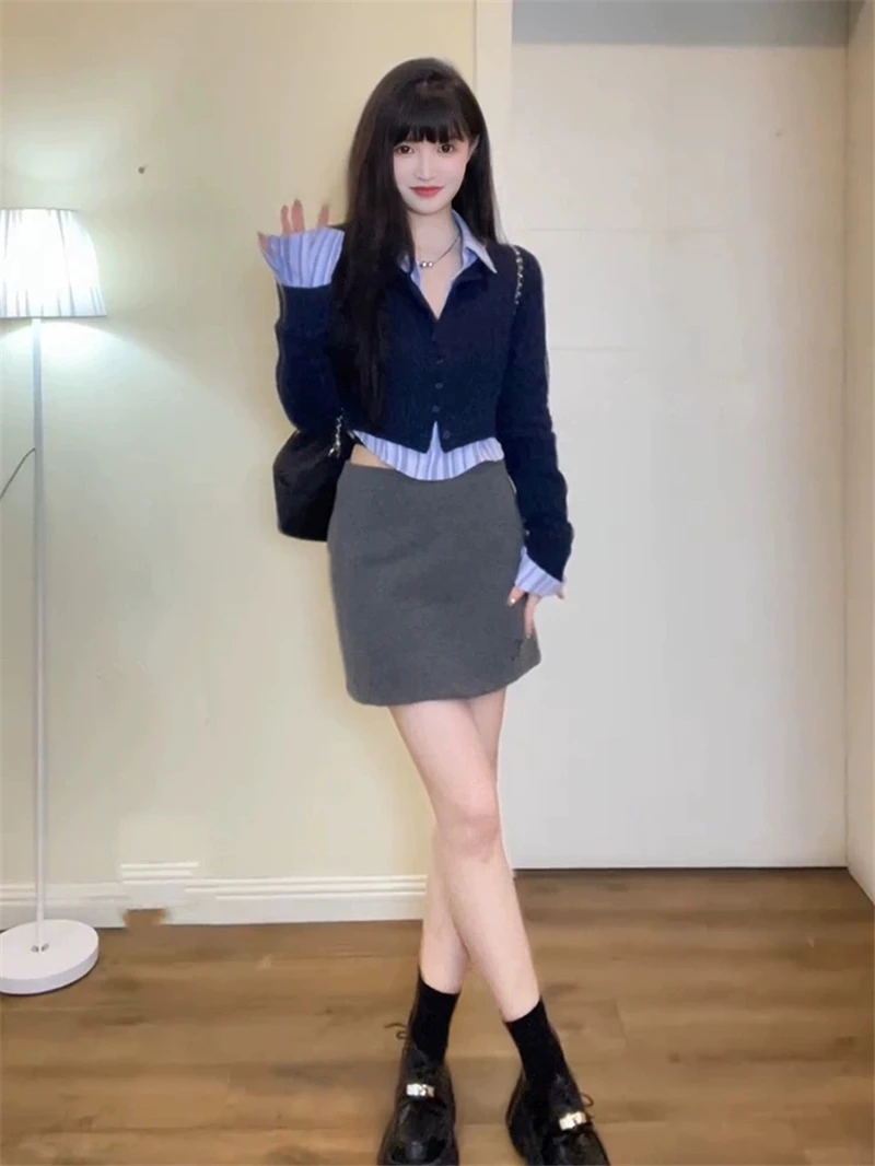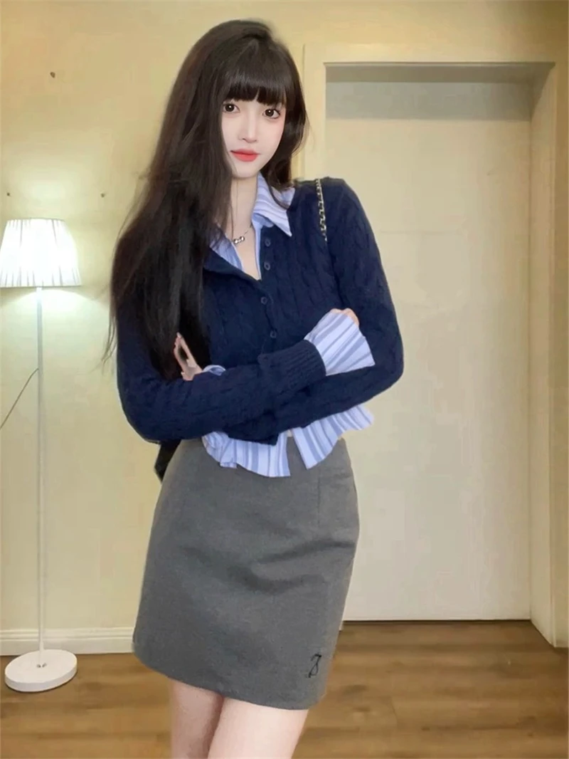 Комплект униформы JK в стиле преппи для японской и корейской девушки, полосатая рубашка с длинным рукавом, вязаный кардиган, облегающая бедра юбка, комплект из 3 предметов