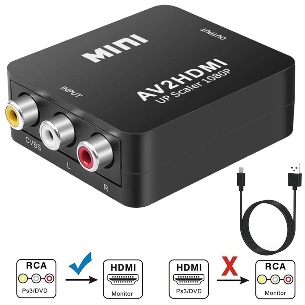 Просто Подключите стандартные композитные AV-кабели (желтый, красный и белый) к входному порту преобразователя, а затем подключите HDMI-совместимый кабель от преобразователя к телевизору.